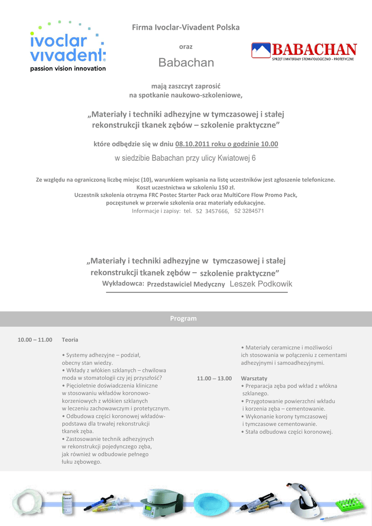 Firma Ivoclar-Vivadent Polska oraz Babachan mają zaszczyt zaprosid na spotkanie naukowo-szkoleniowe, „Materiały i techniki adhezyjne w tymczasowej i stałej rekonstrukcji tkanek zębów – szkolenie praktyczne” które odbędzie się w dniu 08.10.2011 roku o godzinie 10.00 w siedzibie Babachan przy ulicy Kwiatowej 6 Ze względu na ograniczoną liczbę miejsc (10), warunkiem wpisania na listę uczestników jest zgłoszenie telefoniczne. Koszt uczestnictwa w szkoleniu 150 zł. Uczestnik szkolenia otrzyma FRC Postec Starter Pack oraz MultiCore Flow Promo Pack, poczęstunek w przerwie szkolenia oraz materiały edukacyjne. Informacje i zapisy: tel. 52 3457 666, 52 3284571 „Materiały i techniki adhezyjne w tymczasowej i stałej rekonstrukcji tkanek zębów – szkolenie praktyczne” Wykładowca: Przedstawiciel Medyczny Leszek Podkowik Program 10.00 – 11.00 Teoria • Systemy adhezyjne – podział, obecny stan wiedzy. • Wkłady z włókien szklanych – chwilowa moda w stomatologii czy jej przyszłośd? • Pięcioletnie doświadczenia kliniczne w stosowaniu wkładów koronowokorzeniowych z włókien szklanych w leczeniu zachowawczym i protetycznym. • Odbudowa części koronowej wkładówpodstawa dla trwałej rekonstrukcji tkanek zęba. • Zastosowanie technik adhezyjnych w rekonstrukcji pojedynczego zęba, jak również w odbudowie pełnego łuku zębowego. • Materiały ceramiczne i możliwości ich stosowania w połączeniu z cementami adhezyjnymi i samoadhezyjnymi. 11.00 13.00 Warsztaty • Preparacja zęba pod wkład z włókna szklanego. • Przygotowanie powierzchni wkładu i korzenia zęba – cementowanie. • Wykonanie korony tymczasowej i tymczasowe cementowanie. • Stała odbudowa części koronowej.