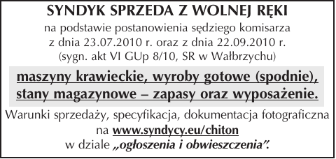 SYNDYK SPRZEDA Z WOLNEJ RĘKI na podstawie postanowienia sędziego komisarza z dnia 23.07.2010 r. oraz z dnia 22.09.2010 r. (sygn. akt VI GUp 8/10, SR w Wałbrzychu) maszyny krawieckie, wyroby gotowe (spodnie), stany magazynowe – zapasy oraz wyposażenie. Warunki sprzedaży, specyfikacja, dokumentacja fotograficzna na www.syndycy.eu/chiton w dziale „ogłoszenia i obwieszczenia”.