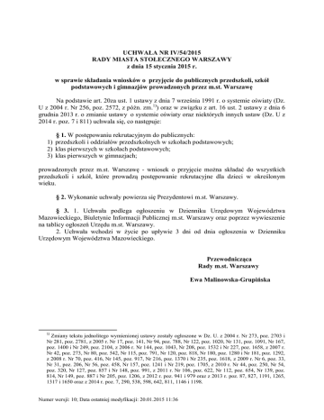 UCHWAŁA NR IV/54/2015 RADY MIASTA STOŁECZNEGO WARSZAWY z dnia 15 stycznia 2015 r. w sprawie składania wniosków o przyjęcie do publicznych przedszkoli, szkół podstawowych i gimnazjów prowadzonych przez m.st. Warszawę Na podstawie art. 20za ust. 1 ustawy z dnia 7 września 1991 r. o systemie oświaty (Dz. U z 2004 r. Nr 256, poz. 2572, z późn. zm.1)) oraz w związku z art. 16 ust. 2 ustawy z dnia 6 grudnia 2013 r. o zmianie ustawy o systemie oświaty oraz niektórych innych ustaw (Dz. U z 2014 r. poz. 7 i 811) uchwala się, co następuje: § 1. W postępowaniu rekrutacyjnym do publicznych: 1) przedszkoli i oddziałów przedszkolnych w szkołach podstawowych; 2) klas pierwszych w szkołach podstawowych; 3) klas pierwszych w gimnazjach; prowadzonych przez m.st. Warszawę - wniosek o przyjęcie można składać do wszystkich przedszkoli i szkół, które prowadzą postępowanie rekrutacyjne dla dzieci w określonym wieku. § 2. Wykonanie uchwały powierza się Prezydentowi m.st. Warszawy. § 3. 1. Uchwała podlega ogłoszeniu w Dzienniku Urzędowym Województwa Mazowieckiego, Biuletynie Informacji Publicznej m.st. Warszawy oraz poprzez wywieszenie na tablicy ogłoszeń Urzędu m.st. Warszawy. 2. Uchwała wchodzi w życie po upływie 3 dni od dnia ogłoszenia w Dzienniku Urzędowym Województwa Mazowieckiego. Przewodnicząca Rady m.st. Warszawy Ewa Malinowska-Grupińska 1) Zmiany tekstu jednolitego wymienionej ustawy zostały ogłoszone w Dz. U. z 2004 r. Nr 273, poz. 2703 i Nr 281, poz. 2781, z 2005 r. Nr 17, poz. 141, Nr 94, poz. 788, Nr 122, poz. 1020, Nr 131, poz. 1091, Nr 167, poz. 1400 i Nr 249, poz. 2104, z 2006 r. Nr 144, poz. 1043, Nr 208, poz. 1532 i Nr 227, poz. 1658, z 2007 r. Nr 42, poz. 273, Nr 80, poz. 542, Nr 115, poz. 791, Nr 120, poz. 818, Nr 180, poz. 1280 i Nr 181, poz. 1292, z 2008 r. Nr 70, poz. 416, Nr 145, poz. 917, Nr 216, poz. 1370 i Nr 235, poz. 1618, z 2009 r. Nr 6, poz. 33, Nr 31, poz. 206, Nr 56, poz. 458, Nr 157, poz. 1241 i Nr 219, poz. 1705, z 2010 r. Nr 44, poz. 250, Nr 54, poz. 320, Nr 127, poz. 857 i Nr 148, poz. 991, z 2011 r. Nr 106, poz. 622, Nr 112, poz. 654, Nr 139, poz. 814, Nr 149, poz. 887 i Nr 205, poz. 1206, z 2012 r. poz. 941 i 979 oraz z 2013 r. poz. 87, 827, 1191, 1265, 1317 i 1650 oraz z 2014 r. poz. 7, 290, 538, 598, 642, 811, 1146 i 1198. Numer wersji: 10; Data ostatniej modyfikacji: 20.01.2015 11:36