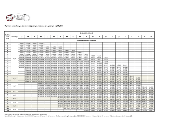 Wymiary rur stalowych bez szwu ciągnionych na zimno precyzyjnych wg EN, DIN Grubość ścianki [mm] Średnica zewn. [mm] Tolerancja 0,5 0,8 1 1,2 3±0,15 4±0,15 5±0,15 6±0,15 7±0,15 8±0,15 9±0,15 11±0,15 13±0,08 14±0,08 15±0,08 17±0,08 19±0,08 21±0,08 2,4±0,15 3,4±0,15 4,4±0,15 5,4±0,15 6,4±0,15 7,4±0,15 8,4±0,15 10,4±0,15 12,4±0,08 13,4±0,08 14,4±0,08 16,4±0,08 18,4±0,08 20,4±0,08 23,4±0,08 24,4±0,08 26,4±0,08 28,4±0,08 30,4±0,15 33,4±0,15 36,4±0,15 38,4±0,15 2±0,15 3±0,15 4±0,15 5±0,15 6±0,15 7±0,15 8±0,15 10±0,15 12±0,08 13±0,08 14±0,08 16±0,08 18±0,08 20±0,08 23±0,08 24±0,08 26±0,08 28±0,08 30±0,15 33±0,15 36±0,15 38±0,15 1,6±0,15 2,6±0,15 3,6±0,15 4,6±0,15 5,6±0,15 6,6±0,15 7,6±0,15 9,6±0,15 11,6±0,15 12,6±0,08 13,6±0,08 15,6±0,08 17,6±0,08 19,6±0,08 22,6±0,08 23,6±0,08 25,6±0,08 27,6±0,08 29,6±0,15 32,6±0,15 35,6±0,15 37,6±0,15 39,6±0,20 42,6±0,20 45,6±0,20 47,6±0,20 52,6±0,25 57,6±0,25 62,6±0,30 67,6±0,30 1,5 1,8 2 2,2 2,5 2,8 3 3,5 4 4,5 5 5,5 6 7 8 9 10 4±0,25 6±0,25 7±0,15 8±0,15 10±0,15 12±0,15 14±0,15 17±0,15 18±0,15 20±0,15 22±0,15 24±0,15 27±0,15 30±0,15 32±0,15 34±0,20 37±0,20 40±0,20 42±0,20 47±0,25 52±0,25 57±0,30 62±0,30 67±0,35 72±0,35 77±0,40 82±0,40 87±0,45 92±0,45 102±0,5 112±0,5 5±0,25 6±0,25 7±0,15 9±0,15 11±0,15 13±0,15 16±0,15 17±0,15 19±0,15 21±0,15 23±0,15 26±0,15 29±0,15 31±0,15 33±0,20 36±0,20 39±0,20 41±0,20 46±0,25 51±0,25 56±0,30 61±0,30 66±0,35 71±0,35 76±0,40 81±0,40 86±0,45 91±0,45 101±0,5 111±0,5 10±0,15 12±0,15 15±0,15 16±0,15 18±0,15 20±0,15 22±0,15 25±0,15 28±0,15 30±0,15 32±0,20 35±0,20 38±0,20 40±0,20 45±0,25 50±0,25 55±0,30 60±0,30 65±0,35 70±0,35 75±0,40 80±0,40 85±0,45 90±0,45 100±0,5 110±0,5 9±0,15 11±0,15 14±0,15 15±0,15 17±0,15 19±0,15 21±0,15 24±0,15 27±0,15 29±0,15 31±0,20 34±0,20 37±0,20 39±0,20 44±0,25 49±0,25 54±0,30 59±0,30 64±0,35 69±0,35 74±0,40 79±0,40 84±0,45 89±0,45 99±0,5 109±0,5 8±0,25 10±0,15 13±0,15 14±0,15 16±0,15 18±0,15 20±0,15 23±0,15 26±0,15 28±0,15 30±0,20 33±0,20 36±0,20 38±0,20 43±0,25 48±0,25 53±0,30 58±0,30 63±0,35 68±0,35 73±0,40 78±0,40 83±0,45 88±0,45 98±0,5 108±0,5 18±0,15 21±0,15 24±0,15 26±0,15 28±0,20 31±0,20 34±0,20 36±0,20 41±0,25 46±0,25 51±0,30 56±0,30 61±0,35 66±0,35 71±0,40 76±0,40 81±0,45 86±0,45 96±0,5 106±0,5 19±0,15 22±0,15 24±0,15 26±0,20 29±0,20 32±0,20 34±0,20 39±0,25 44±0,25 49±0,30 54±0,30 59±0,35 64±0,35 69±0,40 74±0,40 79±0,45 84±0,45 94±0,5 104±0,5 30±0,20 32±0,20 37±0,25 42±0,25 47±0,30 52±0,30 57±0,35 62±0,35 67±0,40 72±0,40 77±0,45 82±0,45 92±0,5 102±0,5 28±0,20 30±0,20 35±0,25 40±0,25 45±0,30 50±0,30 55±0,35 60±0,35 65±0,40 70±0,40 75±0,45 80±0,45 90±0,5 100±0,5 Średnica wewnętrzna i tolerancje 4 5 6 7 8 9 10 12 14 15 16 18 20 22 25 26 28 30 32 35 38 40 42 45 48 50 55 60 65 70 75 80 85 90 95 100 110 120 ±0,08 ±0,15 ±0,20 ±0,25 ±0,30 ±0,35 ±0,40 ±0,45 ±0,50 3±0,15 4±0,15 5±0,15 6±0,15 7±0,15 9±0,15 11±0,15 12±0,15 13±0,08 15±0,08 17±0,08 19±0,08 22±0,08 23±0,08 25±0,08 27±0,08 29±0,15 32±0,15 35±0,15 37±0,15 39±0,20 42±0,20 45±0,20 47±0,20 52±0,25 57±0,25 62±0,30 67±0,30 2,4±0,15 3,4±0,15 4,4±0,15 5,4±0,15 6,4±0,15 8,4±0,15 10,4±0,15 11,4±0,15 12,4±0,15 14,4±0,08 16,4±0,08 18,4±0,08 21,4±0,08 22,4±0,08 24,4±0,08 26,4±0,08 28,4±0,15 31,4±0,15 34,4±0,15 36,4±0,15 38,4±0,20 41,4±0,20 44,4±0,20 46,4±0,20 51,4±0,25 56,4±0,25 61,4±0,30 66,4±0,30 2±0,15 3±0,15 4±0,15 5±0,15 6±0,15 8±0,15 10±0,15 11±0,15 12±0,15 14±0,08 16±0,08 18±0,08 21±0,08 22±0,08 24±0,08 26±0,08 28±0,15 31±0,15 34±0,15 36±0,15 38±0,20 41±0,20 44±0,20 46±0,20 51±0,25 56±0,25 61±0,30 66±0,30 71±0,35 76±0,35 81±0,40 86±0,40 91±0,45 96±0,45 3,6±0,15 4,6±0,15 5,6±0,15 7,6±0,15 9,6±0,15 10,6±0,15 11,6±0,15 13,6±0,15 15,6±0,15 17,6±0,08 20,6±0,08 21,6±0,08 23,6±0,08 25,6±0,08 27,6±0,15 30,6±0,15 33,6±0,15 35,6±0,15 37,6±0,20 40,6±0,20 43,6±0,20 45,6±0,20 50,6±0,25 55,6±0,25 60,6±0,30 65,6±0,30 70,6±0,35 75,6±0,35 80,6±0,40 85,6±0,40 90,6±0,45 95,6±0,45 105,6±0,5 3±0,25 4±0,25 5±0,15 7±0,15 9±0,15 10±0,15 11±0,15 13±0,15 15±0,15 17±0,15 20±0,08 21±0,08 23±0,08 25±0,08 27±0,15 30±0,15 33±0,15 35±0,15 37±0,20 40±0,20 43±0,20 45±0,20 50±0,25 55±0,25 60±0,30 65±0,30 70±0,35 75±0,35 80±0,40 85±0,40 90±0,45 95±0,45 105±0,5 3,4±0,25 4,4±0,25 6,4±0,15 8,4±0,15 9,4±0,15 10,4±0,15 12,4±0,15 14,4±0,15 16,4±0,15 19,4±0,15 20,4±0,15 22,4±0,08 24,4±0,08 26,4±0,15 29,4±0,15 32,4±0,15 34,4±0,15 36,4±0,20 39,4±0,20 42,4±0,20 44,4±0,20 49,4±0,25 54,4±0,25 59,4±0,30 64,6±0,30 69,4±0,35 74,4±0,35 79,4±0,40 84,4±0,40 89,4±0,45 94,4±0,45 104,4±0,5 4±0,25 6±0,25 8±0,15 9±0,15 10±0,15 12±0,15 14±0,15 16±0,15 19±0,15 20±0,15 22±0,15 24±0,15 26±0,15 29±0,15 32±0,15 34±0,15 36±0,20 39±0,20 42±0,20 44±0,20 49±0,25 54±0,25 59±0,30 64±0,30 69±0,35 74±0,35 79±0,40 84±0,40 89±0,45 94±0,45 104±0,5 114±0,5 5±0,25 7±0,15 8±0,15 9±0,15 11±0,15 13±0,15 15±0,15 18±0,15 19±0,15 21±0,15 23±0,15 25±0,15 28±0,15 31±0,15 33±0,15 35±0,20 38±0,20 41±0,20 43±0,20 48±0,25 53±0,25 58±0,30 63±0,30 68±0,35 73±0,35 78±0,40 83±0,40 88±0,45 93±0,45 103±0,5 113±0,5 Inne wymiary (do średnicy 162 mm) i tolerancje na podstawie uzgodnienia. Wartości tolerancji D dotyczą rur w stanie BK i BKW wg normy DIN oraz +C i +LC wg normy EN. Dla rur obrobionych cieplnie (stan NBK, GBK, BKS wg normy DIN oraz +N, +A, +SR wg normy EN) jest możliwe zawężenie tolerancji D.