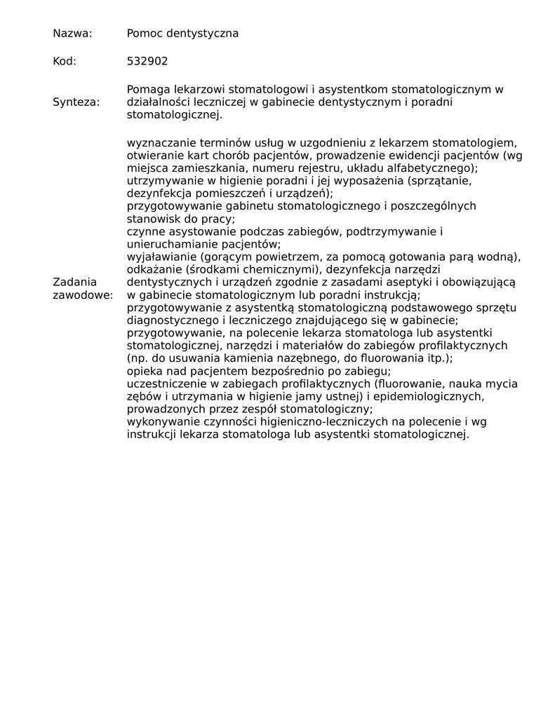 Nazwa: Pomoc dentystyczna Kod: 532902 Synteza: Pomaga lekarzowi stomatologowi i asystentkom stomatologicznym w działalności leczniczej w gabinecie dentystycznym i poradni stomatologicznej. Zadania zawodowe: wyznaczanie terminów usług w uzgodnieniu z lekarzem stomatologiem, otwieranie kart chorób pacjentów, prowadzenie ewidencji pacjentów (wg miejsca zamieszkania, numeru rejestru, układu alfabetycznego); utrzymywanie w higienie poradni i jej wyposażenia (sprzątanie, dezynfekcja pomieszczeń i urządzeń); przygotowywanie gabinetu stomatologicznego i poszczególnych stanowisk do pracy; czynne asystowanie podczas zabiegów, podtrzymywanie i unieruchamianie pacjentów; wyjaławianie (gorącym powietrzem, za pomocą gotowania parą wodną), odkażanie (środkami chemicznymi), dezynfekcja narzędzi dentystycznych i urządzeń zgodnie z zasadami aseptyki i obowiązującą w gabinecie stomatologicznym lub poradni instrukcją; przygotowywanie z asystentką stomatologiczną podstawowego sprzętu diagnostycznego i leczniczego znajdującego się w gabinecie; przygotowywanie, na polecenie lekarza stomatologa lub asystentki stomatologicznej, narzędzi i materiałów do zabiegów profilaktycznych (np. do usuwania kamienia nazębnego, do fluorowania itp.); opieka nad pacjentem bezpośrednio po zabiegu; uczestniczenie w zabiegach profilaktycznych (fluorowanie, nauka mycia zębów i utrzymania w higienie jamy ustnej) i epidemiologicznych, prowadzonych przez zespół stomatologiczny; wykonywanie czynności higieniczno-leczniczych na polecenie i wg instrukcji lekarza stomatologa lub asystentki stomatologicznej.