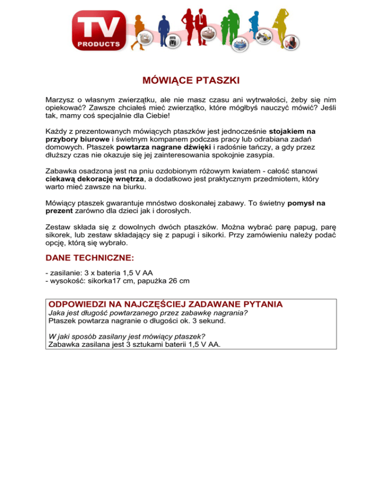 MÓWIĄCE PTASZKI Marzysz o własnym zwierzątku, ale nie masz czasu ani wytrwałości, żeby się nim opiekować? Zawsze chciałeś mieć zwierzątko, które mógłbyś nauczyć mówić? Jeśli tak, mamy coś specjalnie dla Ciebie! Każdy z prezentowanych mówiących ptaszków jest jednocześnie stojakiem na przybory biurowe i świetnym kompanem podczas pracy lub odrabiana zadań domowych. Ptaszek powtarza nagrane dźwięki i radośnie tańczy, a gdy przez dłuższy czas nie okazuje się jej zainteresowania spokojnie zasypia. Zabawka osadzona jest na pniu ozdobionym różowym kwiatem - całość stanowi ciekawą dekorację wnętrza, a dodatkowo jest praktycznym przedmiotem, który warto mieć zawsze na biurku. Mówiący ptaszek gwarantuje mnóstwo doskonałej zabawy. To świetny pomysł na prezent zarówno dla dzieci jak i dorosłych. Zestaw składa się z dowolnych dwóch ptaszków. Można wybrać parę papug, parę sikorek, lub zestaw składający się z papugi i sikorki. Przy zamówieniu należy podać opcję, którą się wybrało. DANE TECHNICZNE: - zasilanie: 3 x bateria 1,5 V AA - wysokość: sikorka17 cm, papużka 26 cm ODPOWIEDZI NA NAJCZĘŚCIEJ ZADAWANE PYTANIA Jaka jest długość powtarzanego przez zabawkę nagrania? Ptaszek powtarza nagranie o długości ok. 3 sekund. W jaki sposób zasilany jest mówiący ptaszek? Zabawka zasilana jest 3 sztukami baterii 1,5 V AA.