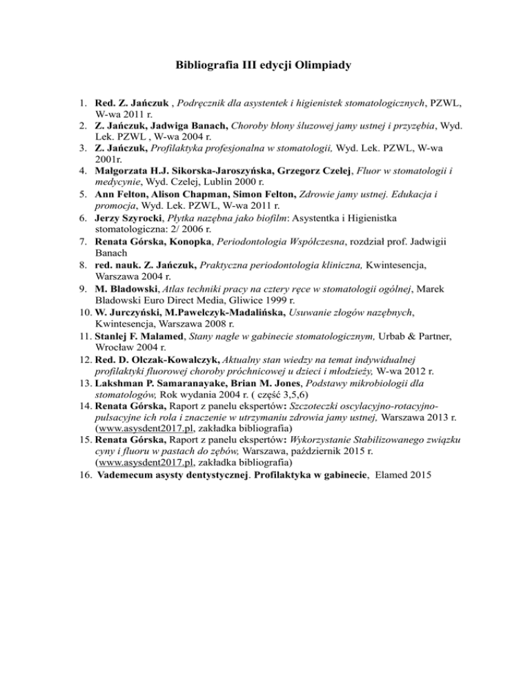 Bibliografia III edycji Olimpiady 1. Red. Z. Jańczuk , Podręcznik dla asystentek i higienistek stomatologicznych, PZWL, W-wa 2011 r. 2. Z. Jańczuk, Jadwiga Banach, Choroby błony śluzowej jamy ustnej i przyzębia, Wyd. Lek. PZWL , W-wa 2004 r. 3. Z. Jańczuk, Profilaktyka profesjonalna w stomatologii, Wyd. Lek. PZWL, W-wa 2001r. 4. Małgorzata H.J. Sikorska-Jaroszyńska, Grzegorz Czelej, Fluor w stomatologii i medycynie, Wyd. Czelej, Lublin 2000 r. 5. Ann Felton, Alison Chapman, Simon Felton, Zdrowie jamy ustnej. Edukacja i promocja, Wyd. Lek. PZWL, W-wa 2011 r. 6. Jerzy Szyrocki, Płytka nazębna jako biofilm: Asystentka i Higienistka stomatologiczna: 2/ 2006 r. 7. Renata Górska, Konopka, Periodontologia Współczesna, rozdział prof. Jadwigii Banach 8. red. nauk. Z. Jańczuk, Praktyczna periodontologia kliniczna, Kwintesencja, Warszawa 2004 r. 9. M. Bladowski, Atlas techniki pracy na cztery ręce w stomatologii ogólnej, Marek Bladowski Euro Direct Media, Gliwice 1999 r. 10. W. Jurczyński, M.Pawelczyk-Madalińska, Usuwanie złogów nazębnych, Kwintesencja, Warszawa 2008 r. 11. Stanlej F. Malamed, Stany nagłe w gabinecie stomatologicznym, Urbab & Partner, Wrocław 2004 r. 12. Red. D. Olczak-Kowalczyk, Aktualny stan wiedzy na temat indywidualnej profilaktyki fluorowej choroby próchnicowej u dzieci i młodzieży, W-wa 2012 r. 13. Lakshman P. Samaranayake, Brian M. Jones, Podstawy mikrobiologii dla stomatologów, Rok wydania 2004 r. ( część 3,5,6) 14. Renata Górska, Raport z panelu ekspertów: Szczoteczki oscylacyjno-rotacyjnopulsacyjne ich rola i znaczenie w utrzymaniu zdrowia jamy ustnej, Warszawa 2013 r. (www.asysdent2017.pl, zakładka bibliografia) 15. Renata Górska, Raport z panelu ekspertów: Wykorzystanie Stabilizowanego związku cyny i fluoru w pastach do zębów, Warszawa, październik 2015 r. (www.asysdent2017.pl, zakładka bibliografia) 16. Vademecum asysty dentystycznej. Profilaktyka w gabinecie, Elamed 2015