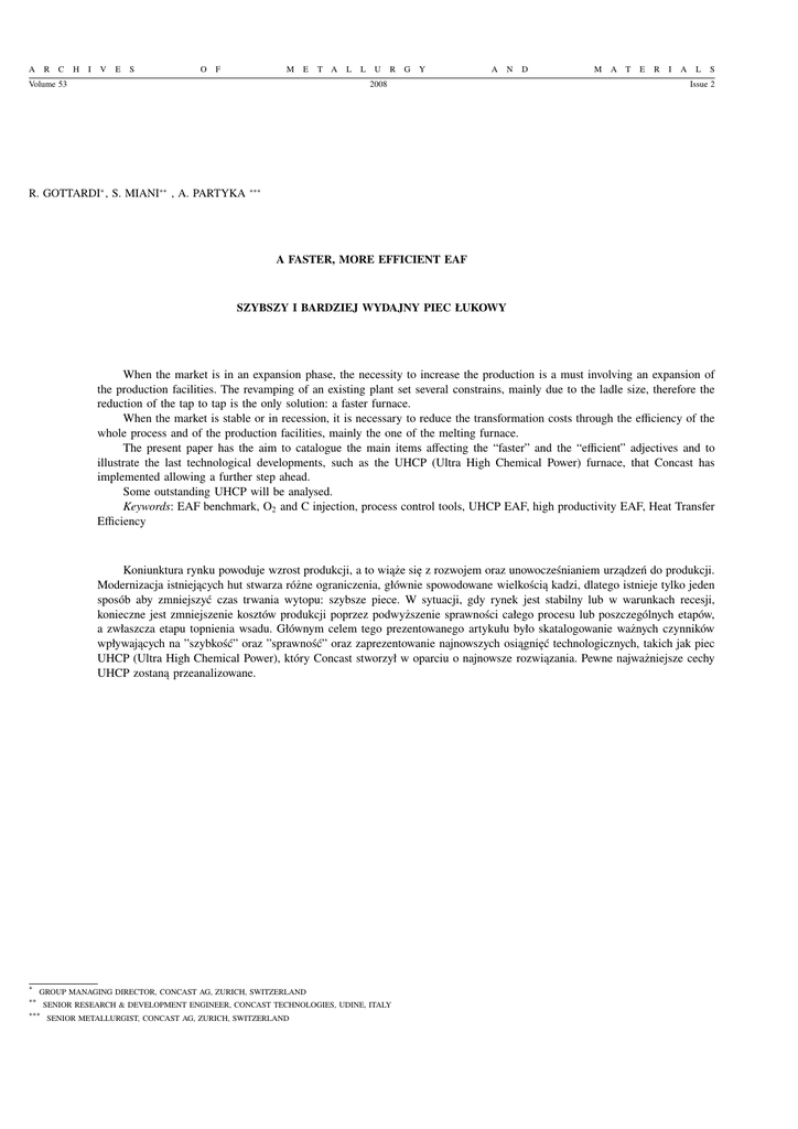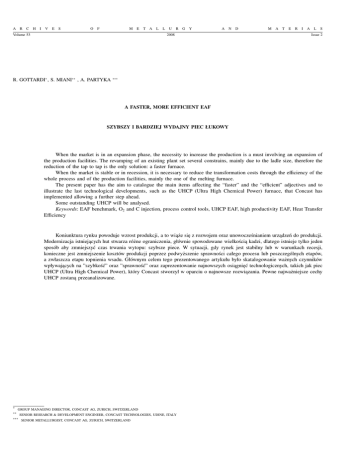 A R C H I V E S O F M E Volume 53 T A L L U R G Y A 2008 R. GOTTARDI∗ , S. MIANI∗∗ , A. PARTYKA N D M A T E R I A L S Issue 2 ∗∗∗ A FASTER, MORE EFFICIENT EAF SZYBSZY I BARDZIEJ WYDAJNY PIEC ŁUKOWY When the market is in an expansion phase, the necessity to increase the production is a must involving an expansion of the production facilities. The revamping of an existing plant set several constrains, mainly due to the ladle size, therefore the reduction of the tap to tap is the only solution: a faster furnace. When the market is stable or in recession, it is necessary to reduce the transformation costs through the efficiency of the whole process and of the production facilities, mainly the one of the melting furnace. The present paper has the aim to catalogue the main items affecting the “faster” and the “efficient” adjectives and to illustrate the last technological developments, such as the UHCP (Ultra High Chemical Power) furnace, that Concast has implemented allowing a further step ahead. Some outstanding UHCP will be analysed. Keywords: EAF benchmark, O2 and C injection, process control tools, UHCP EAF, high productivity EAF, Heat Transfer Efficiency Koniunktura rynku powoduje wzrost produkcji, a to wiąże się z rozwojem oraz unowocześnianiem urządzeń do produkcji. Modernizacja istniejących hut stwarza różne ograniczenia, głównie spowodowane wielkością kadzi, dlatego istnieje tylko jeden sposób aby zmniejszyć czas trwania wytopu: szybsze piece. W sytuacji, gdy rynek jest stabilny lub w warunkach recesji, konieczne jest zmniejszenie kosztów produkcji poprzez podwyższenie sprawności całego procesu lub poszczególnych etapów, a zwłaszcza etapu topnienia wsadu. Głównym celem tego prezentowanego artykułu było skatalogowanie ważnych czynników wpływających na ”szybkość” oraz ”sprawność” oraz zaprezentowanie najnowszych osiągnięć technologicznych, takich jak piec UHCP (Ultra High Chemical Power), który Concast stworzył w oparciu o najnowsze rozwiązania. Pewne najważniejsze cechy UHCP zostaną przeanalizowane. ∗ GROUP MANAGING DIRECTOR, CONCAST AG, ZURICH, SWITZERLAND ∗∗ ∗∗∗ SENIOR RESEARCH & DEVELOPMENT ENGINEER, CONCAST TECHNOLOGIES, UDINE, ITALY SENIOR METALLURGIST, CONCAST AG, ZURICH, SWITZERLAND