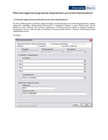 Płatności zagraniczne grupowe, ekspresowe i po kursie indywidualnym 1. P łatność zagraniczna przeliczana po kursie indywidualnym. W celu zdefiniowania przelewu zagranicznego, przeliczanego po kursie indywidualnym, należy uaktywnić zakładkę Wskazówki/referencje, a następnie wpisać w polu Referencje słowo NEW, a w polu Partner do rozmów wpisujemy //VH/Vxxxxxxxxxxx, gdzie w miejsce znaków x wstawiamy numer referencyjny otrzymany od pracownika banku, z którym dokonywane było uzgodnienie kursu. Przykład: 2. Płatność zagraniczna grupowa przeliczana po kursie indywidualnym W przypadku, kiedy płatność zagraniczna jest jednocześnie płatnością grupową, postępujemy analogicznie, a w polu Partner do rozmów wpisujemy /REC/SAME (dla płatności na rzecz Danske Bank), /REC/INTRACOM (dla płatności na rzecz innego banku) , a dopiero następnie //VH/Vxxxxxxxxxxx, gdzie w miejsce znakow x wstawiamy numer referencyjny otrzymany od pracownika banku, z którym dokonywane było uzgodnienie kursu. Przykład: 3. Płatność grupowa przeliczana po kursie dnia W tym przypadku w polu Partner do rozmów wpisujemy jedynie odpowiednio /REC/SAME lub /REC/INTRACOM. Przykład: 4. Płatność ekspresowa W celu zdefiniowania przelewu zagranicznego, ekspresowego należy uaktywnić zakładkę Wskazówki/referencje, a następnie wpisać w polu Referencje słowo EXPRESS. Pole partner do rozmów pozostaje puste. Przykład: