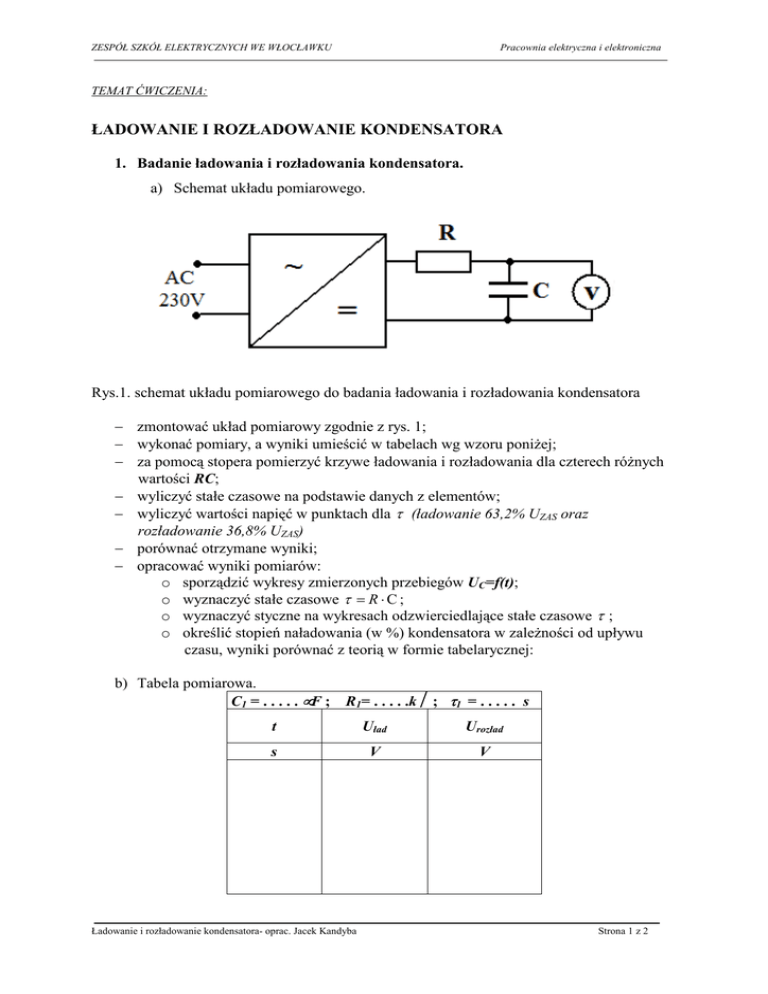 ZESPÓŁ SZKÓŁ ELEKTRYCZNYCH WE WŁOCŁAWKU Pracownia elektryczna i elektroniczna TEMAT ĆWICZENIA: ŁADOWANIE I ROZŁADOWANIE KONDENSATORA 1. Badanie ładowania i rozładowania kondensatora. a) Schemat układu pomiarowego. Rys.1. schemat układu pomiarowego do badania ładowania i rozładowania kondensatora − zmontować układ pomiarowy zgodnie z rys. 1; − wykonać pomiary, a wyniki umieścić w tabelach wg wzoru poniŜej; − za pomocą stopera pomierzyć krzywe ładowania i rozładowania dla czterech róŜnych wartości RC; − wyliczyć stałe czasowe na podstawie danych z elementów; − wyliczyć wartości napięć w punktach dla τ (ładowanie 63,2% UZAS oraz rozładowanie 36,8% UZAS) − porównać otrzymane wyniki; − opracować wyniki pomiarów: o sporządzić wykresy zmierzonych przebiegów UC=f(t); o wyznaczyć stałe czasowe τ = R ⋅ C ; o wyznaczyć styczne na wykresach odzwierciedlające stałe czasowe τ ; o określić stopień naładowania (w %) kondensatora w zaleŜności od upływu czasu, wyniki porównać z teorią w formie tabelarycznej: b) Tabela pomiarowa. C1 = . . . . . µF ; R1= . . . . .kΩ ; τ1 = . . . . . s t Uład Urozład s V V Ładowanie i rozładowanie kondensatora- oprac. Jacek Kandyba Strona 1 z 2 ZESPÓŁ SZKÓŁ ELEKTRYCZNYCH WE WŁOCŁAWKU Pracownia elektryczna i elektroniczna Obliczyć stałą czasową τ = R ⋅ C gdzie: C – pojemność kondensatora [F]; R – rezystancja opornika [Ω]. WyróŜnić w tabeli pomiarowej wartości napięcia dla czasów odpowiadającego: τ ; 2τ ; 3τ ; 4τ ; 5τ . c) Tabela do wyliczenia stopnia naładowania kondensatora. Stopień naładowania kondensatora [%] procent naładowania rzeczywistego dane teoretyczne uzyskane z literatury τ 2τ 3τ 4τ 5τ ∞ 63,2 86,5 95,0 98,2 98,9 100 τ1 = . . . . . s τ2 = . . . . . s τ3 = . . . . . s τ4 = . . . . . s Obliczyć procent naładowania rzeczywistego kondensatora K % : K% = UC U Ładowanie i rozładowanie kondensatora- oprac. Jacek Kandyba Strona 2 z 2