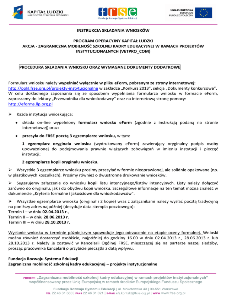 INSTRUKCJA SKŁADANIA WNIOSKÓW PROGRAM OPERACYJNY KAPITAŁ LUDZKI AKCJA - ZAGRANICZNA MOBILNOŚĆ SZKOLNEJ KADRY EDUKACYJNEJ W RAMACH PROJEKTÓW INSTYTUCJONALNYCH (VETPRO_COM) PROCEDURA SKŁADANIA WNIOSKU ORAZ WYMAGANE DOKUMENTY DODATKOWE Formularz wniosku należy wypełniać wyłącznie w pliku eForm, pobranym ze strony internetowej: http://pokl.frse.org.pl/projekty-instytucjonalne w zakładce „Konkurs 2013”, sekcja „Dokumenty konkursowe”. W celu dokładnego zapoznania się ze sposobem wypełniania formularza wniosku w formacie eForm, zapraszamy do lektury „Przewodnika dla wnioskodawcy” oraz na internetową stronę pomocy: http://eforms.llp.org.pl Każda instytucja wnioskująca: składa on-line wypełniony formularz wniosku eForm (zgodnie z instrukcją podaną na stronie internetowej) oraz: przesyła do FRSE pocztą 3 egzemplarze wniosku, w tym: 1 egzemplarz oryginału wniosku (wydrukowany eForm) zawierający oryginalny podpis osoby upoważnionej do podejmowania prawnie wiążących zobowiązań w imieniu instytucji i pieczęć instytucji; 2 egzemplarze kopii oryginału wniosku. Wszystkie 3 egzemplarze wniosku prosimy przesyłać w formie nieoprawionej, ale solidnie opakowane (np. w plastikowych koszulkach). Prosimy również o dwustronne drukowanie wniosków. Sugerujemy załączenie do wniosku kopii listu intencyjnego/listów intencyjnych. Listy należy dołączyć zarówno do oryginału, jak i do obydwu kopii wniosku. Szczegółowe informacje na ten temat można znaleźć w dokumencie „Kryteria formalne i jakościowe dla wnioskodawców”. Wszystkie egzemplarze wniosku (oryginał i 2 kopie) wraz z załącznikami należy wysłać pocztą tradycyjną na poniższy adres najpóźniej (decyduje data stempla pocztowego): Termin I – w dniu 02.04.2013 r., Termin II – w dniu 28.06.2013 r. Termin III – w dniu 28.10.2013 r. Wysłanie wniosku w terminie późniejszym spowoduje jego odrzucenie na etapie oceny formalnej. Wnioski można również dostarczyć osobiście, najpóźniej do godziny 16.00 w dniu 02.04.2013 r., 28.06.2013 r. lub 28.10.2013 r. Należy je zostawić w Kancelarii Ogólnej FRSE, mieszczącej się na parterze naszej siedziby, prosząc pracownika kancelarii o przybicie pieczątki z datą wpływu. Fundacja Rozwoju Systemu Edukacji Zagraniczna mobilność szkolnej kadry edukacyjnej – projekty instytucjonalne „Zagraniczna mobilność szkolnej kadry edukacyjnej w ramach projektów instytucjonalnych” współfinansowany przez Unię Europejską w ramach środków Europejskiego Funduszu Społecznego PROJEKT: Fundacja Rozwoju Systemu Edukacji | ul. Mokotowska 43 | 00-551 Warszawa 46 31 680 | FAKS 22 46 31 021 | E-MAIL [email protected] | WWW www.frse.org.pl TEL. 22 wniosek ul. Mokotowska 43 00-551 Warszawa Adresowanie koperty: na kopercie zawierającej wniosek należy podać nazwę akcji: Zagraniczna mobilność szkolnej kadry edukacyjnej – projekty instytucjonalne. Wniosek. Zalecane jest zachowanie dowodów nadania przesyłki pocztowej z czytelną datą. Do wniosku należy dołączyć w jednym zestawie: Wszystkie instytucje: W przypadku gdy wniosek jest podpisany przez inną osobę niż przedstawiciel prawny organizacji, należy obowiązkowo dołączyć stosowne pełnomocnictwo (oryginał lub kopia poświadczona za zgodność z oryginałem). UWAGA: przypadku instytucji posiadających organ prowadzący, jeżeli wniosek jest podpisywany przez osobę inną niż przedstawiciel prawny organu prowadzącego, do wniosku należy dołączyć stosowne pełnomocnictwo (oryginał lub kopia poświadczona za zgodność z oryginałem). Pełnomocnictwo na etapie składania wniosku powinno zawierać minimum upoważnienie do składania oświadczeń woli w zakresie pozyskiwania środków z programów unijnych. Np. Jeżeli wniosek podpisuje dyrektor szkoły, której organem prowadzącym jest miasto, do wniosku powinno być dołączone stosowne pełnomocnictwo wystawione przez prezydenta miasta dla dyrektora. W przypadku instytucji/organizacji niepublicznych: Aktualny (nie starszy niż 3 miesiące od daty podpisania wniosku) wyciąg z odpowiedniego rejestru (np. wyciąg z KRS) i ewentualnie inne właściwe dokumenty informujące o prawnym statusie organizacji i osobach prawnie upoważnionych do zaciągania zobowiązań w imieniu organizacji (oryginał lub kopia potwierdzona za zgodność z oryginałem). W przypadku wniosków o dofinansowanie wyższe niż 60 000 EUR – bilans i rachunek wyników za ostatni rok finansowy, w którym zamknięto rachunki (kopia poświadczona za zgodność z oryginałem). „Zagraniczna mobilność szkolnej kadry edukacyjnej w ramach projektów instytucjonalnych” współfinansowany przez Unię Europejską w ramach środków Europejskiego Funduszu Społecznego PROJEKT: Fundacja Rozwoju Systemu Edukacji | ul. Mokotowska 43 | 00-551 Warszawa 46 31 680 | FAKS 22 46 31 021 | E-MAIL [email protected] | WWW www.frse.org.pl TEL. 22