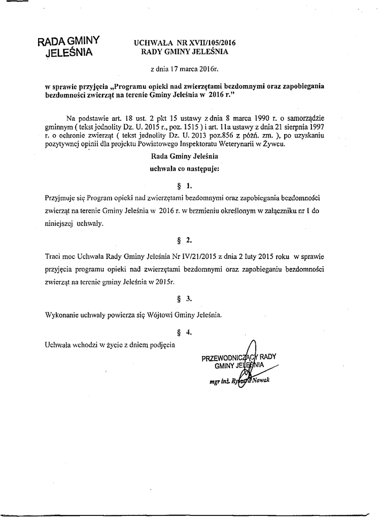 RADA GMINY JELEŚNIA UCHWAŁA NRXVII/105/2016 R A D Y GMINY JELEŚNIA z dnia 17 marca 20t6r. w sprawie przyjęcia „Programu opieki nad zwierzętami bezdomnymi oraz zapobiegania bezdomności zwierząt na terenie Gminy Jeleśnia w 2016 r." Na podstawie art. 18 ust. 2 pkt 15 ustawy z dnia 8 marca 1990 r. o samorządzie gminnym (tekst jednolity Dz. U. 2015 r.,poz. 1515 ) i art. 1 la ustawy z dnia 21 sierpnia 1997 r. o ochronie zwierząt ( tekst jednolity Dz. U. 2013 poz.856 z póżń. zm. ), po uzyskaniu pozytywnej opinii dla projektu Powiatowego Inspektoratu Weterynarii w Żywcu. Rada Gminy Jeleśnia uchwala co następuje: § i. Przyjmuje się Program opieki nad zwierzętami bezdomnymi oraz zapobiegania bezdomności zwierząt na terenie Gminy Jeleśnia w 2016 r. w brzmieniu określonym w załączniku nr 1 do niniejszej uchwały. § 2. Traci moc Uchwała Rady Gminy Jeleśnia Nr IV/21/2015 z dnia 2 luty 2015 roku w sprawie przyjęcia programu opieki nad zwierzętami bezdomnymi oraz zapobieganiu bezdomności zwierząt na terenie gminy Jeleśnia w 2015r. § 3. Wykonanie uchwały powierza się Wójtowi Gminy Jeleśnia. § 4. Uchwała wchodzi w życie z dniem podjęcia PRZEWODNICZCE RADY GMINY JEUĘBNIA ^ RADA GMINY JELEŚNIA Uzasadnienie Zgodnie z art. 11 ustawy z dnia 21 sierpnia 1997 r. o ochronie zwierząt (Dz. U . z 2013 r. poz. 856 z późn. zm.) zapewnienie opieki bezdomnym zwierzętom oraz ich wyłapywanie należy do zadań własnych gminy. W związku z nowelizacją ustawy o ochronie zwierząt, zgodnie z art. 11 a, Rada Gminy została zobligowana, corocznie do dnia 31 marca, określenia w drodze uchwały Programu opieki nad zwierzętami bezdomnymi oraz zapobiegania bezdomności zwierząt. Przedmiotowy Program ma obejmować zadania związane z: 1) zapewnieniem bezdomnym zwierzętom miejsca w schronisku dla zwierząt; 2) opiekę nad wolno żyjącymi kotami, w tym ich dokarmianie; 3) odławianie bezdomnych zwierząt; 4) obligatoryjną sterylizację albo kastrację zwierząt w schroniskach dla zwierząt; 5) poszukiwanie właścicieli dla bezdomnych zwierząt; 6) usypianie ślepych miotów; 7) wskazanie gospodarstwa rolnego w celu zapewnienia miejsca dla zwierząt gospodarskich; 8) zapewnienie całodobowej opieki weterynaryjnej w przypadkach zdarzeń drogowych z udziałem zwierząt. Program ma zastosowanie do wszystkich zwierząt domowych, w szczególności psów i kotów, w tym kotów wolno żyjących oraz zwierząt gospodarskich. Bezdomność zwierząt jest zjawiskiem społecznym, którego głównymi przyczynami są: - niekontrolowane rozmnażanie, - porzucenie zwierząt przez właścicieli, - ucieczki zwierząt, - łatwość zdobycia zwierząt, - brak edukacji i wiedzy społeczeństwa w zakresie metod zapobiegania bezdomności. W celu ograniczenia w/w działań przygotowany został Program opieki nad bezdomnymi zwierzętami oraz zapobiegania bezdomności zwierząt na terenie Gminy Jeleśnia w 2016 roku, który stanowi załącznik do niniejszej uchwały. W Programie został określony sposób realizacji zadań wynikających art. 11 a ust. 2 ustawy o ochronie zwierząt. Projekt Programu został uzgodniony z: - powiatowym lekarzem weterynarii, - dzierżawcami/zarządcami obwodów łowieckich, działających na obszarze gminy. Program zawiera wskazanie wysokości środków finansowych przeznaczonych na jego realizację oraz sposób wydatkowania tych środków. Koszty realizacji programu ponosi gmina. Obligatoryjne uchwalenie przez gminy programu opieki nad zwierzętami bezdomnymi oraz zapobiegania bezdomności zwierząt oraz realizacja zadań Programu zmierza do ograniczenia liczby bezdomnych zwierząt, poprawy bytu tych zwierząt oraz poprawy świadomości mieszkańców w sprawach dotyczących odpowiedzialnej i właściwej opieki/Ład zwierzętami. PRZEWODNICZĄCY RADY GMINY JjppJJ!^ mgr ml R^k Nowak Załącznik do uchwały Nr XVII/105/2016 Rady Gminy Jeleśnia RADA GMINY JELEŚNIA z dnia 17 marca 2016 r Program opieki nad zwierzętami bezdomnymi oraz zapobiegania bezdomności zwierząt na terenie Gminy Jeleśnia w 2016 roku. Rozdział 1 POSTANOWIENIA OGÓLNE §1. Ilekroć w uchwale jest mowa o: 1) Schronisku, należy przez to rozumieć Schronisko dla Bezdomnych Zwierząt Kabaty 2 w Żywcu, które jest własnością Spółki z o.o. Beskid w Żywcu; przy ul. 2) Programie, należy przez to rozumieć Program opieki nad zwierzętami bezdomnymi oraz zapobiegania bezdomności zwierząt domowych w tym w szczególności psów i kotów przebywających w granicach administracyjnych Gminy Jeleśnia w 2016 roku. 3) ustawie - należy przez to rozumieć ustawę z dnia 21 sierpnia 1997r. o ochronie zwierząt (Dz.U. z 2013 poz. 856 z późn. zm. ). §2. 1. Koordynatorem Programu jest Wójt Gminy Jeleśnia. 2. Realizatorami Programu są: 1) na poziomie Gminy Jeleśnia - Wójt Gminy Jeleśnia, 2) na podstawie umowy z Gminą Jeleśnia - „Beskid" Spółka z o.o. w Żywcu właściciel Schroniska dla bezdomnych zwierząt w Żywcu, przy ul. Kabaty 2. Rozdział 2 CEL PROGRAMU §3 Celem Programu jest zapobieganie bezdomności zwierząt na terenie Gminy Jeleśnia oraz opieka nad zwierzętami bezdomnymi. Rozdział 3 REALIZACJA ZADAŃ §4 Zapewnienie opieki bezdomnym zwierzętom z terenu Gminy Jeleśnia realizują: 1) „Beskid" Spółka z o.o. poprzez wyłapywanie oraz przyjmowanie bezdomnych zwierząt do schroniska na zgłoszenie telefoniczne przez właściwego pracownika Urzędu Gminy Jeleśnia, Policję lub Inspekcję Weterynaryjną; 2) Wójt Gminy poprzez wskazanie gospodarstwa rolnego, zapewniającego miejsce dla zwierząt gospodarskich. §5 Sprawowanie opieki nad kotami wolno żyjącymi, w tym ich dokarmianie realizują: 1) Wójt Gminy poprzez: a) zakup i wydawanie kanny społecznym opiekunom ( karmicielom żyjących; ) kotów wolno b) podejmowanie interwencji w sprawach kotów wolno żyjących; 2) Schronisko poprzez sprawowanie opieki nad kotami w schronisku oraz podejmowanie interwencji w sprawach kotów wol