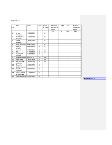 Załącznik nr 1 Tytuł ISSN Ilość Częst. w roku M jak mieszkanie Architektura murator Dobre wnętrze Art & Business Dom & wnętrze Murator Odra Kwartalnik filmowy Rachunkowość Świat szkła Marketing w praktyce Dziennik gazeta prawna Gazeta wyborcza Polska gazeta wrocławska Rzeczpospolita 1508-2083 1 12 1232-6372 1 12 1429-3226 1 12 0867-3160 0867-2105 1 1 12 12 0239-6866 0472-5182 0452-9502 1 1 1 12 12 4 0481-5475 1426-5494 1425-8315 1 1 1 12 12 12 2080-6744 1 0860-908X 1 2353-6152 1 0208-9130 1 Lp 1. 2. 3. 4. 5. 6. 7. 8. 9. 10. 11. 12. 13. 14. 15. Wartość sprzedaży netto PLN VAT VAT % PLN Wartość Sprzedaży brutto PLN Komentarz [ER1]: