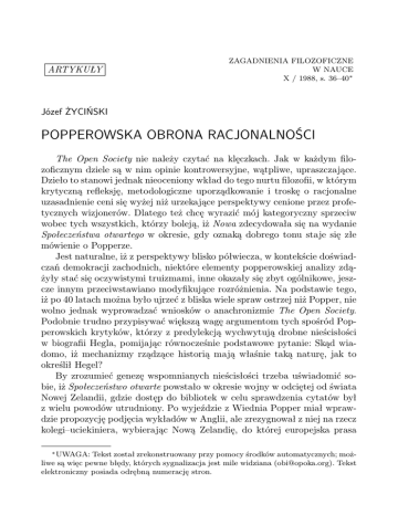 ARTYKUŁY ZAGADNIENIA FILOZOFICZNE W NAUCE X / 1988, s. 36–40∗ Józef ŻYCIŃSKI POPPEROWSKA OBRONA RACJONALNOŚCI The Open Society nie należy czytać na klęczkach. Jak w każdym filozoficznym dziele są w nim opinie kontrowersyjne, wątpliwe, upraszczające. Dzieło to stanowi jednak nieoceniony wkład do tego nurtu filozofii, w którym krytyczną refleksję, metodologiczne uporządkowanie i troskę o racjonalne uzasadnienie ceni się wyżej niż urzekające perspektywy cenione przez profetycznych wizjonerów. Dlatego też chcę wyrazić mój kategoryczny sprzeciw wobec tych wszystkich, którzy boleją, iż Nowa zdecydowała się na wydanie Społeczeństwa otwartego w okresie, gdy oznaką dobrego tonu staje się złe mówienie o Popperze. Jest naturalne, iż z perspektywy blisko półwiecza, w kontekście doświadczań demokracji zachodnich, niektóre elementy popperowskiej analizy zdążyły stać się oczywistymi truizmami, inne okazały się zbyt ogólnikowe, jeszcze innym przeciwstawiano modyfikujące rozróżnienia. Na podstawie tego, iż po 40 latach można było ujrzeć z bliska wiele spraw ostrzej niż Popper, nie wolno jednak wyprowadzać wniosków o anachronizmie The Open Society. Podobnie trudno przypisywać większą wagę argumentom tych spośród Popperowskich krytyków, którzy z predylekcją wychwytują drobne nieścisłości w biografii Hegla, pomijając równocześnie podstawowe pytanie: Skąd wiadomo, iż mechanizmy rządzące historią mają właśnie taką naturę, jak to określił Hegel? By zrozumieć genezę wspomnianych nieścisłości trzeba uświadomić sobie, iż Społeczeństwo otwarte powstało w okresie wojny w odciętej od świata Nowej Zelandii, gdzie dostęp do bibliotek w celu sprawdzenia cytatów był z wielu powodów utrudniony. Po wyjeździe z Wiednia Popper miał wprawdzie propozycję podjęcia wykładów w Anglii, ale zrezygnował z niej na rzecz kolegi–uciekiniera, wybierając Nową Zelandię, do której europejska prasa ∗ UWAGA: Tekst został zrekonstruowany przy pomocy środków automatycznych; możliwe są więc pewne błędy, których sygnalizacja jest mile widziana ([email protected]). Tekst elektroniczny posiada odrębną numerację stron. 2 Józef ŻYCIŃSKI docierała wtedy pocztą morską dopiero po pięciu tygodniach. Ta izolacja od kultury europejskiej pozwala zrozumieć zarówno pewne nieścisłości występujące w The Open Society, jak i komentarze, w których widać nieznajomość szczegółów aktualnych realiów. Dla mnie osobiście Popperowskie Open Society stanowi ważną i należącą już do klasyki obronę filozoficznej racjonalności, która nie pozwala przedstawiać prywatnych życzeń jako uzasadnionych sądów czy zastępować zasad logicznego wynikania autorytetem kolejnego guru. W Popperowskiej krytyce zarówno Hegla jak i Marksa widzę wypracowany metodologicznie protest przeciw filozofii, w której zdroworozsądkowe obiegowe opinie danej epoki podnosi się do rangi prawd ostatecznych nie zadając sobie trudu podstawowych pytań o uzasadnienie lub ewentualną falsyfikację tych właśnie opinii. Ten ważny element dorobku Poppera zdaje się być ignorowany przez tych współczesnych przedstawicieli nauk społecznych czy filozofii historii, którzy przestarzałą aksjomatykę Hegla i Marksa chcieli by zastępować nowymi wersjami aksjomatów pozbawionych tak samo odniesienia do testów empirycznych czy do racjonalnej krytyki. Aby łatwiej ocenić metodologiczny status nowej historiozofii proponowanej przez sympatyków epistemologii Hegla wyobraźmy sobie, iż per impossibile w naukach przyrodniczych XIX wieku przyjęto propozycje Heglowskie z identyczną powagą jak przyjęto je w naukach społecznych. Jak wyglądałaby fizyka budowana na dobrych radach Fenomenologii ducha? U Hegla znajdujemy obszerny zbiór wypowiedzi, które bądź to dotyczą nauk przyrodniczych, bądź też zawierają wskazówki, jak nauki te należałoby uprawiać. W znamiennym stylu Hegel orzeka ex cathedra np. iż poznanie historyczne dotyczy zagadnień znacznie bardziej doniosłych niż poznanie przyrodnicze. Przyroda stanowić ma jedynie „trupa myśli” zaś astronomiczne badanie niebios jest zajęciem równie bezsensownym, jak badanie rozkładu piegów na ludzkiej twarzy (Encyklopädie 11, par. 341). Lekceważąc empiryczne analizy astronomii autor tych opinii zasłynął w 1801 r. ze swego dowodu nieistnienia planetoid. Rozgłos związany tym „dowodem” wynikał z faktu, iż kilka miesięcy przed opublikowaniem tekstu Hegla, Piazzi odkrył obserwacyjnie pierwszą planetoidę — Ceres. To metodologiczne curiosum przestaje szokować w kontekście innych bardziej szokujących asercji, w których Hegel np. kategorycznie odrzuca teorię ewolucji zapewniając kategorycznie: „człowiek nie rozwinął się ze zwierzęcia [...]; każda istota jest od razu tym czym jest” (System der Philosophie, par. 339, 9). By „wyjaśnić” naturę wykopalisk paleontologicznych, wykazy- POPPEROWSKA OBRONA RACJONALNOŚCI 3 wał on następnie, iż wykopaliska te dostarczają jedynie obrazów antycypacji form, które miały pojawić się w późniejszych stadiach rozwoju... Nawet najprostsze uwagi Hegla dotyczące np. sposobu zamrażania wody (Logika 1, 573) zdradzają zaskakującą nieznajomość elementarnych faktów przyrodniczych. Dochodzi do tego ezoteryczny język, który informuje np. iż liczba jest „określonością obojętną, gnuśną; musi ona z wewnątrz być wprowadzana w ruch i w odnoszenie się” (Logika, 1, 305). Z kolei ilość okazuje się być „określonością «bytu», która stała się dla bytu obojętna, stała się granicą, która w równym stopniu granicą nie jest”. Jako przykłady „czystej ilości” można zdaniem Hegla, wskazać „przestrzeń i czas, także materię w ogóle, światło a nawet czyste Ja” (Logika 1, 269. 277). Zrozumiałe jest, iż podobny styl uprawiania refleksji musiał wywołać pro