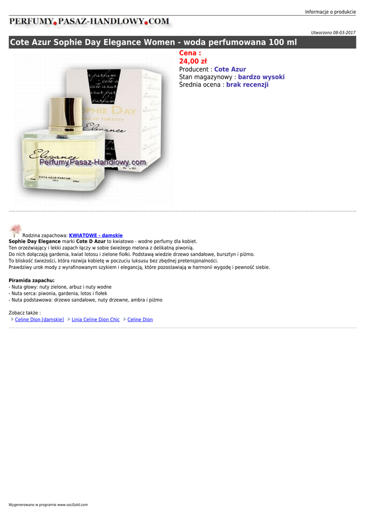 Informacje o produkcie Utworzono 08-03-2017 Cote Azur Sophie Day Elegance Women - woda perfumowana 100 ml Cena : 24,00 zł Producent : Cote Azur Stan magazynowy : bardzo wysoki Średnia ocena : brak recenzji Rodzina zapachowa: KWIATOWE - damskie Sophie Day Elegance marki Cote D Azur to kwiatowo - wodne perfumy dla kobiet. Ten orzeźwiający i lekki zapach łączy w sobie świeżego melona z delikatną piwonią. Do nich dołączają gardenia, kwiat lotosu i zielone fiołki. Podstawą wiedzie drzewo sandałowe, bursztyn i piżmo. To bliskość świeżości, która rozwija kobietę w poczuciu luksusu bez zbędnej pretensjonalności. Prawdziwy urok mody z wyrafinowanym szykiem i elegancją, które pozostawiają w harmonii wygodę i pewność siebie. Piramida zapachu: - Nuta głowy: nuty zielone, arbuz i nuty wodne - Nuta serca: piwonia, gardenia, lotos i fiołek - Nuta podstawowa: drzewo sandałowe, nuty drzewne, ambra i piżmo Zobacz także : Celine Dion [damskie] Linia Celine Dion Chic Wygenerowano w programie www.oscGold.com Celine Dion