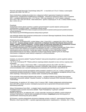 Kierownik Jednostki Samorządu Terytorialnego (dalej JST) - w rozumieniu art. 33 ust. 3 Ustawy o samorządzie gminnym (Dz.U.2001.142.1591 j.t.) Dane wnioskodawcy znajdują się poniżej wraz z załączonym plikiem sygnowanym bezpiecznym podpisem elektronicznym, weryfikowanym kwalifikowanym certyfikatem - stosownie do dyspozycji ustawy z dnia 18 września 2001 r. o podpisie elektronicznym (Dz. U. Nr 130 poz. 1450) oraz przepisów art. 4 ust. 5 ustawy o petycjach (Dz.U.2014.1195 z dnia 2014.09.05) - Data dostarczenia - zgodna z dyspozycją art. 61 pkt. 2 Ustawy Kodeks Cywilny (Dz. U. 2014.121 j.t.) Preambuła: Zaniepokojeni stanem jakości powietrza w polskich gminach/miastach (wysokie stężenia zanieczyszczeń odnotowywane w ostatnim czasie) – przykładowe artykuły poniżej http://www.tvp.info/23060723/komisja-europejska-pozwala-polske-w-sprawie-zanieczyszczen-powietrza-bardzosurowe-ostrzezenie http://krakow.tvp.pl/19781836/ograniczenie-niskiej-emisji-w-gminach oraz analizując bieżące dane pomiarowe zamieszczane na stronach Głównego Inspektoratu Ochrony Środowiska http://powietrze.gios.gov.pl/pjp/home Postulujemy jak poniżej: §1) Na mocy art. 63 Konstytucji RP, w trybie Ustawy z dnia 11 lipca 2014 r. o petycjach (Dz.U.2014.1195 z dnia 2014.09.05) - wnosimy petycję-wniosek o utworzenie w oficjalnym Serwisie Internetowym Gminy (serwis WWW) - zakładki "Czystsze Powietrze", w której, znajdą się informacje edukacyjne dla mieszkańców na temat prawidłowych zachowań sprzyjających poprawie jakości powietrza (niespalanie śmieci). §1.1) Współwnioskodawcą jest w tym przypadku organizacja non profit, tj. Fundacja PlasticsEurope Polska, która w zakresie swoich celów statutowych prowadzi od lat działania związane z promocją pełnego i właściwego wykorzystania tworzyw sztucznych, również jako odpadu. Informacje ze strony internetowej Fundacji (www.plasticseurope.pl) oraz teksty z załącznika do petycji mogą posłużyć władzom gminy do aktywnego informowania o inicjatywach władz lokalnych związanych z ochroną środowiska. Uzasadnienie wniosku: Uważamy, że utworzenie zakładki "Czystsze Powietrze" może pomóc decydentom w gminie wypełniać zadania określone m.in. w: - art. 74 ust. 4 Konstytucji RP: "Władze publiczne wspierają działania obywateli na rzecz ochrony i poprawy stanu środowiska." - art. 7 ust. 1 pkt 1 ustawy z dnia 8 marca 1990 r. o samorządzie gminnym (Dz.U.2001.142.1591 j.t.) - oraz dyspozycjach ustawy o udostępnianiu informacji o środowisku i jego ochronie, udziale społeczeństwa w ochronie środowiska oraz o ocenach oddziaływania na środowisko (Dz.U.2016.353 z dnia 2016.03.16) Przedmiotowa petycja-wniosek bezwzględnie spełnia przesłanki, określone w art 2 ust. 3 ustawy o petycjach, jako pozyskiwanie percepcji decydentów w związku z promowaniem wartości wymagających szczególnej ochrony w imię dobra wspólnego, mieszczących się w zakresie zadań i kompetencji Adresata petycji. W tym przypadku naszą petycje traktujemy jako wniosek - o podjęcie działania przez Władze Samorządowe związanego z tworzeniem zakładki "Czystsze Powietrze" na oficjalnych serwisach WWW Jednostek Samorządu Terytorialnego. Przypominamy, że zgodnie art. 241 ustawy z dnia 14 czerwca 1960 r. Kodeks postępowania administracyjnego (Dz.U.2013.267 j.t) każdy ma prawo i obowiązek przyczyniać się do usprawniania funkcjonowania struktur administracji publicznej. Główny Wnioskodawca Szulc-Efekt - w ubiegłych latach prowadził podobną akcję wraz z Fundacją Akademia Liderów Przedsiębiorczości w sprawie utworzenia zakładek "Kącik Przedsiębiorcy" w gminach i szkołach ponadgimnazjalnych. Efektem tej akcji było to, że większość gmin w kraju rozpoczęła tworzenie w/w zakładki w swoich oficjalnych serwisach internetowych i obecnie wielu przedsiębiorców korzysta z bezpłatnych porad informacyjnych za pośrednictwem utworzonej przez gminy zakładki. §2) Wnosimy o zwrotne potwierdzenie otrzymania niniejszego wniosku w trybie §7 rozporządzenia Prezesa Rady Ministrów z dnia 8 stycznia 2002 r. w sprawie organizacji przyjmowania i rozpatrywania s. i wniosków. (Dz. U. z dnia 22 styczna 2002 r. Nr 5, poz. 46) na adres e-mail [email protected] §3) Wnosimy o to, aby odpowiedź w przedmiocie powyższych petycji złożonych na mocy art. 63 Konstytucji RP w związku z art. 241 KPA, została udzielona zwrotnie na adres e-mail [email protected] W załączniku nr 1 znajdują proponowane elementy graficzne oraz tekstowe z podstawowymi informacjami merytorycznymi na temat szkodliwości spalania odpadów w piecach domowych. Mogą one posłużyć gminom jako materiały do zamieszczenia na swoich stronach www, w rzeczonej zakładce. Petycja-wniosek został sygnowany przez głównego Wnioskodawcę bezpiecznym, kwalifikowanym podpisem elektronicznym stosownie do wytycznych ustawy z dnia 18 września 2001 r. o podpisie elektronicznym (Dz. U. Nr 130 poz. 1450) Wnioskodawca zastrzega sobie prawo wnioskowania o usunięcie dostarczonych materiałów umieszczonych przez Gminy w zakładce "Czystsze-Powietrze", jeśli uzna że zakładany cel działań informacyjnych w obszarze związanym z polepszeniem jakości powietrza w gminach/miastach został osiągnięty, lub uzasadniony społecznie interes pro publico bono wymaga podjęcia działań o innym charakterze. Wnioskodawca: Osoba Prawna Szulc-Efekt sp. z o. o. Prezes Zarządu: Adam Szulc ul. Poligonowa 1 04-051 Warszawa nr KRS: 0000059459 Kapitał Zakładowy: 222.000,00 pln www.gmina.pl www.samorzad.pl Współwnioskodawca: Osoba Prawna Fundacja PlasticsEurope Polska, ul. Trębacka 4 pok. 109, 00-074 Warszawa, KRS: 0000265234 Dodatkowe informacje: Stosownie do art. 4 ust. 2 pkt. 1 Ustawy o petycjach (Dz.U.2014.1195 z dnia 2014.09.05) - osobą reprezentująca Podmiot wnoszący petycję - jest Prezes Zarządu Adam Szulc Stosownie do art. 4 ust. 2 pkt. 5 ww. Ustawy - petycja niniejsza została złożona za pomocą 