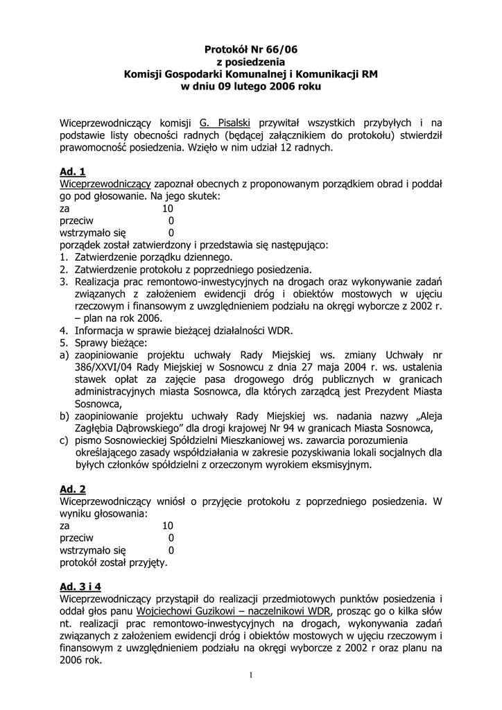 Protokół Nr 66/06 z posiedzenia Komisji Gospodarki Komunalnej i Komunikacji RM w dniu 09 lutego 2006 roku Wiceprzewodniczący komisji G. Pisalski przywitał wszystkich przybyłych i na podstawie listy obecności radnych (będącej załącznikiem do protokołu) stwierdził prawomocność posiedzenia. Wzięło w nim udział 12 radnych. Ad. 1 Wiceprzewodniczący zapoznał obecnych z proponowanym porządkiem obrad i poddał go pod głosowanie. Na jego skutek: za 10 przeciw 0 wstrzymało się 0 porządek został zatwierdzony i przedstawia się następująco: 1. Zatwierdzenie porządku dziennego. 2. Zatwierdzenie protokołu z poprzedniego posiedzenia. 3. Realizacja prac remontowo-inwestycyjnych na drogach oraz wykonywanie zadań związanych z założeniem ewidencji dróg i obiektów mostowych w ujęciu rzeczowym i finansowym z uwzględnieniem podziału na okręgi wyborcze z 2002 r. – plan na rok 2006. 4. Informacja w sprawie bieżącej działalności WDR. 5. Sprawy bieżące: a) zaopiniowanie projektu uchwały Rady Miejskiej ws. zmiany Uchwały nr 386/XXVI/04 Rady Miejskiej w Sosnowcu z dnia 27 maja 2004 r. ws. ustalenia stawek opłat za zajęcie pasa drogowego dróg publicznych w granicach administracyjnych miasta Sosnowca, dla których zarządcą jest Prezydent Miasta Sosnowca, b) zaopiniowanie projektu uchwały Rady Miejskiej ws. nadania nazwy „Aleja Zagłębia Dąbrowskiego” dla drogi krajowej Nr 94 w granicach Miasta Sosnowca, c) pismo Sosnowieckiej Spółdzielni Mieszkaniowej ws. zawarcia porozumienia określającego zasady współdziałania w zakresie pozyskiwania lokali socjalnych dla byłych członków spółdzielni z orzeczonym wyrokiem eksmisyjnym. Ad. 2 Wiceprzewodniczący wniósł o przyjęcie protokołu z poprzedniego posiedzenia. W wyniku głosowania: za 10 przeciw 0 wstrzymało się 0 protokół został przyjęty. Ad. 3 i 4 Wiceprzewodniczący przystąpił do realizacji przedmiotowych punktów posiedzenia i oddał głos panu Wojciechowi Guzikowi – naczelnikowi WDR, prosząc go o kilka słów nt. realizacji prac remontowo-inwestycyjnych na drogach, wykonywania zadań związanych z założeniem ewidencji dróg i obiektów mostowych w ujęciu rzeczowym i finansowym z uwzględnieniem podziału na okręgi wyborcze z 2002 r oraz planu na 2006 rok. 1 W uzupełnieniu do przedmiotowej informacji pisemnej (w załączeniu do protokołu) naczelnik powiedział, że właściwa ewidencja dróg jest narzędziem pozwalającym na prawidłowe nimi zarządzanie. Dodał przy tym, iż w dniu 25 kwietnia ubiegłego roku weszło w życie rozporządzenie nakładające obowiązek założenia do 09 maja 2007 r. nowej ewidencji dróg. Ma ona objąć przede wszystkim numer drogi, jednolity numer inwentarzowy dla wszystkich obiektów mostowych, książkę drogi, dziennik objazdów dróg, mapy techniczno-eksploatacyjne dot. dróg krajowych, wojewódzkich i powiatowych oraz książki, karty i wykaz obiektów mostowych. Powstanie ewidencji ma być dokonane w ramach systemu informacji o terenie (SIT). Niezbędne dane mogą być pozyskiwane drogą wykonywanych w tym celu zdjęć lotniczych bądź namiarów specjalistycznego sprzętu rejestrującego wszelkie elementy pasa drogowego. Dla wykonania ww. zadania konieczne jest także stworzenie mapy referencyjnej wskazującej odcinki referencyjne i punkty węzłowe, tworzące sieć dróg, która zostanie wprowadzona do konkretnej książki dróg. WDR przeprowadza ponadto inwentaryzację wszystkich użytków drogowych na terenie miasta, sprawdzając metryki ulic określające ich przebiegi, rozpoznając własności gruntów oraz proponując zaliczenie drogi do poszczególnej kategorii. Po zakończeniu ewidencjonowania WDR przystąpi do przygotowywania stosownych projektów uchwał. Radna A. Sporyszkiewicz zainteresowała się kwestią kosztów utrzymywania porządku na drogach zabudowanych obiektami mającymi różnych właścicieli. Radny K. Winiarski zapytał o plany remontowe poczynione względem ul. Chemicznej. Naczelnik WDR wyjaśnił, że ww. ulica zostanie w bieżącym roku wyfrezowana i wyposażona w nakładkę na odcinku od Parku Schoena do granicy z Będzinem. Dodatkowo, po wiosennym przeglądzie, wyremontowany zostanie jej najbardziej uczęszczany i pozostający w najgorszym stanie odcinek. Powiedział także, iż rokrocznie ma miejsce obligatoryjny podstawowy przegląd ulic, a raz na pięć lat dokonuje się przeglądu szczegółowego wraz z oceną stanu technicznego ulic. W chwili obecnej na terenie miasta jest 105 obiektów zakwalifikowanych do przeglądu specjalistycznego i wymagających dostosowania do standardów krajowych. Na zakończenie wypowiedzi poinformował, iż drogi w osiedlach mieszkaniowych powinny być drogami wewnętrznymi. Zarządcy terenu znajdującego się pod drogą powinni dojść do wzajemnego porozumienia w zakresie partycypacji w kosztach utrzymania drogi. Wiceprzewodniczący G. Pisalski zapytał o sposoby ustalania przez gminę właściciela drogi. Naczelnik WDR powiedział, że gmina we własnym zakresie sprawdza własność gruntu pod poszczególnymi drogami. Radny Cz. Tondos zainteresował się reorganizacją ruchu na przebudowywanym skrzyżowaniu ulic Lipowej i Niweckiej. Naczelnik WDR wyjaśnił, że reorganizację ruchu wprowadzono na skutek interwencji służb policyjnych donoszących o szeregu kolizji drogowych związanych z dokonywanymi tam pracami remontowymi. 2 Radna A. Kopeć zapytała, czy w roku 2006 remontowane będą ulice Rydza Śmigłego oraz Dobrzańskiego i Makuszyńskiego w rejonie starej szkoły podstawowej i przy torowisku tramwajowym. Naczelnik WDR odpowiedział, iż generalnie dokonywane będą prace związane z usuwaniem z nawierzchni ubytków i przełomów pozimowych. Dodatkowo czynione będą większe remonty na drogach wytypowanych do naprawy w pierwszej kolejności. Ponadto naczelnik zobowiązał się do sprawdzenia stanu ulic wskazanych przez radną. Radna A. Kopeć zapytała, czy WDR będ