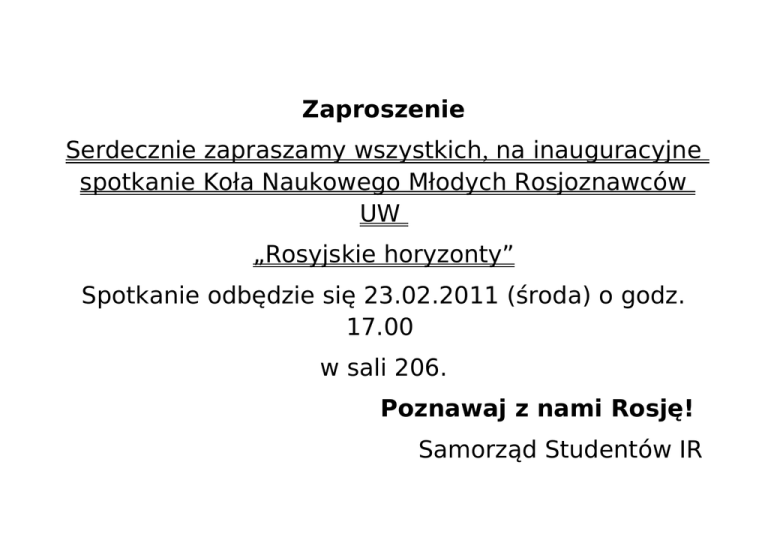 Zaproszenie Serdecznie zapraszamy wszystkich, na inauguracyjne spotkanie Koła Naukowego Młodych Rosjoznawców UW „Rosyjskie horyzonty” Spotkanie odbędzie się 23.02.2011 (środa) o godz. 17.00 w sali 206. Poznawaj z nami Rosję! Samorząd Studentów IR