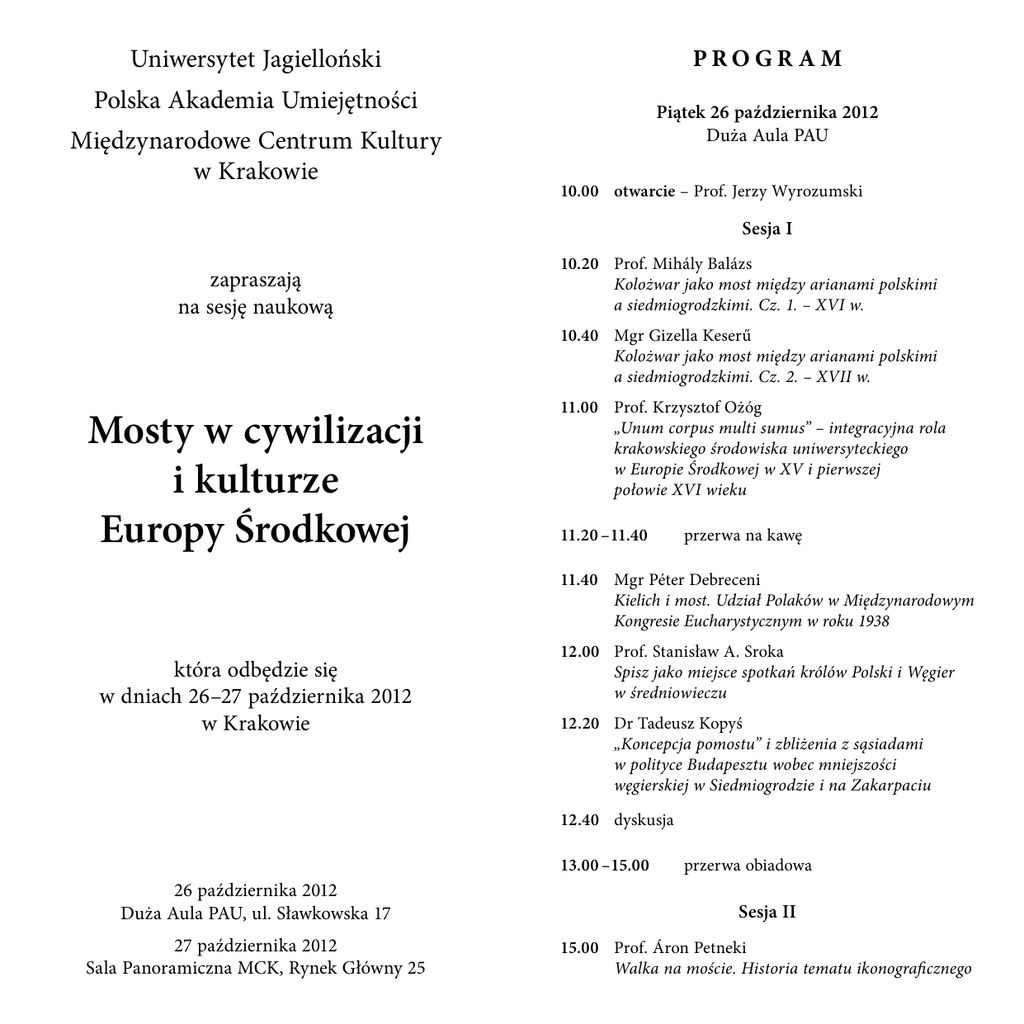 Progr am Uniwersytet Jagielloński Polska Akademia Umiejętności Międzynarodowe Centrum Kultury w Krakowie Piątek 26 października 2012 Duża Aula PAU 10.00 otwarcie – Prof. Jerzy Wyrozumski Sesja I zapraszają na sesję naukową 10.20 Prof. Mihály Balázs Kolożwar jako most między arianami polskimi a siedmiogrodzkimi. Cz. 1. – XVI w. 10.40 Mgr Gizella Keserű Kolożwar jako most między arianami polskimi a siedmiogrodzkimi. Cz. 2. – XVII w. Mosty w cywilizacji i kulturze Europy Środkowej 11.00 Prof. Krzysztof Ożóg „Unum corpus multi sumus” – integracyjna rola krakowskiego środowiska uniwersyteckiego w Europie Środkowej w XV i pierwszej połowie XVI wieku 11.20 –11.40 przerwa na kawę 11.40 Mgr Péter Debreceni Kielich i most. Udział Polaków w Międzynarodowym Kongresie Eucharystycznym w roku 1938 która odbędzie się w dniach 26–27 października 2012 w Krakowie 12.00 Prof. Stanisław A. Sroka Spisz jako miejsce spotkań królów Polski i Węgier w średniowieczu 12.20 Dr Tadeusz Kopyś „Koncepcja pomostu” i zbliżenia z sąsiadami w polityce Budapesztu wobec mniejszości węgierskiej w Siedmiogrodzie i na Zakarpaciu 12.40 dyskusja 13.00 –15.00 przerwa obiadowa 26 października 2012 Duża Aula PAU, ul. Sławkowska 17 Sesja II 27 października 2012 Sala Panoramiczna MCK, Rynek Główny 25 15.00 Prof. Áron Petneki Walka na moście. Historia tematu ikonograficznego 15.20 Prof. Gábor Winkler Historische Brücken in West-Ungarn Mosty historyczne na Węgrzech Zachodnich 15.40 Prof. Károly Kapronczay Odnowiony most Małgorzaty w Budapeszcie 16.00 –16.20 przerwa na kawę 16.20 Prof. Almut Bues Funkcje mostów we wczesnej nowożytności 16.40 Prof. Bogusław Krasnowolski Mosty w układzie urbanistycznym Krakowa 17.00 Dr Jakub Sito Nie tylko Most Karola. Kierunek czeski w rzeźbie warszawskiej pierwszej połowy XVIII wieku 17.20 dyskusja Sobota 27 października 2012 Sala Panoramiczna MCK Panel 9.00 –12.00 Prowadzący: Prof. Jacek Purchla Doc. Dániel Bagi Prof. Csaba Kiss Prof. Maciej Koźmiński Prof. Adriene Kőrmendy O. Józef Puciłowski Prof. Jerzy Wyrozumski Polska Akademia Umiejętności ul. Sławkowska 17, 31-016 Kraków tel. (48-12) 424-02-00, fax (48-12) 422-54-22 e-mail: [email protected] ZAPROSZENIE