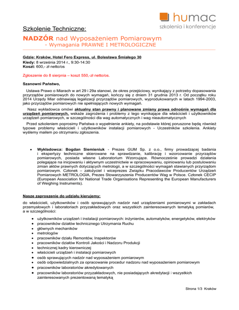 Szkolenie Techniczne: NADZÓR nad Wyposażeniem Pomiarowym - Wymagania PRAWNE I METROLOGICZNE ________________________________________________________________________________________________________________________________________________ Gdzie: Kraków, Hotel Fero Express, ul. Bolesława Śmiałego 30 Kiedy: 8 września 2014 r., 9:30-14:30 Koszt: 600,- zł netto/os Zgłoszenie do 8 sierpnia – koszt 550,-zł netto/os. Szanowni Państwo, Ustawa Prawo o Miarach w art 29 i 29a stanowi, że okres przejściowy, wynikający z potrzeby dopasowania przyrządów pomiarowych do nowych wymagań, kończy się z dniem 31 grudnia 2013 r. Od początku roku 2014 Urzędy Miar odmawiają legalizacji przyrządów pomiarowych, wyprodukowanych w latach 1994-2003, jako przyrządów pomiarowych nie spełniających nowych wymagań. Nasz wykładowca omówi aktualny stan prawny i planowane zmiany prawa odnośnie wymagań dla urządzeń pomiarowych, wskaże zagrożenia i problemy z tego wynikające dla właścicieli i użytkowników urządzeń pomiarowych, w szczególności dla wag automatycznych i wag nieautomatycznych Przed szkoleniem poprosimy Państwa o wypełnienie ankiety, na podstawie której poruszone będą również typowe problemy właścicieli i użytkowników instalacji pomiarowych - Uczestników szkolenia. Ankiety wyślemy mailem po otrzymaniu zgłoszenia. Wykładowca: Bogdan Siemieniuk - Prezes GUM Sp. z o.o., firmy prowadzącej badania i ekspertyzy techniczne skierowane na sprawdzanie, kalibrację i wzorcowanie przyrządów pomiarowych, posiada własne Laboratorium Wzorcujące. Równocześnie prowadzi działania polegające na inicjowaniu i aktywnym uczestnictwie w opracowywaniu, opiniowaniu lub postulowaniu zmian aktów prawnych dotyczących metrologii, a w szczególności wymagań stawianych przyrządom pomiarowym. Członek – założyciel i wiceprezes Związku Pracodawców Producentów Urządzeń Pomiarowych METROLOGIA, Prezes Stowarzyszenia Producentów Wag w Polsce. Członek CECIP (European Association for National Trade Organisations Representing the European Manufacturers of Weighing Instruments). Nasze zaproszenie do udziału kierujemy: do właścicieli, użytkowników i osób sprawujących nadzór nad urządzeniami pomiarowymi w zakładach przemysłowych i laboratoriach przyzakładowych oraz wszystkich zainteresowanych tematyką pomiarów, a w szczególności: użytkowników urządzeń i instalacji pomiarowych: inżynierów, automatyków, energetyków, elektryków pracowników działów technicznego Utrzymania Ruchu głównych mechaników metrologów pracowników działu Remontów, Inspektorów pracowników działów Kontroli Jakości i Nadzoru Produkcji technicznej kadry kierowniczej właścicieli urządzeń i instalacji pomiarowych osób sprawujących nadzór nad wyposażeniem pomiarowym osób odpowiedzialnych za opracowanie procedur nadzoru nad wyposażeniem pomiarowym pracowników laboratoriów akredytowanych pracowników laboratoriów przyzakładowych, nie posiadających akredytacji i wszystkich zainteresowanych prezentowaną tematyką Strona 1/3 Kraków Szkolenie Techniczne: NADZÓR nad Wyposażeniem Pomiarowym -Wymagania PRAWNE I METROLOGICZNE________________________________________________________________________________________________________________________________________________ Program Ramowy: Część I. Metrologia ogólna - pomiar, błąd pomiaru, niepewność pomiaru, zasada zgodności, spójność pomiarów - wzorce masy Sposoby nadzoru nad przyrządami pomiarowymi - ocena zgodności, moduły oceny zgodności - legalizacja pierwotna i ponowna - wzorcowanie - dyrektywy UE, Rozporządzenia Ministra Gospodarki Zasady spójności pomiarowej w metrologii prawnej i przemysłowej Zarządzanie częstotliwością sprawdzania i wzorcowania AKP Ważność dowodów kontroli metrologicznej - świadectwa legalizacji, wzory cech legalizacji - terminy ważności kontroli metrologicznej - liczniki energii elektrycznej, gazomierze, ciepłomierz Waga – przyrząd do pomiaru masy i ciężaru - podział, przeznaczenie, klasyfikacja wag - waga kontrolna Warunki techniczne, jakie powinny spełniać wagi, procedura przeważania kontrolnego wagi: - nieautomatyczne samochodowe i kolejowe - automatyczne przenośnikowe - automatyczne do ważenia w ruchu wagonów spiętych Zmiany wymagań dla urządzeń pomiarowych po 31.12.2013 r. Część II. Dyskusja i omówienie typowych problemów właścicieli i użytkowników instalacji pomiarowych na podstawie ankiet Uczestników szkolenia. Ankiety wysyłamy po otrzymaniu zgłoszenia. - Konsultacje indywidualne Część III. Zakończenie - sprawdzenie wiedzy - wręczenie certyfikatów Lunch W przerwach między wykładami Uczestnicy będą mogli skorzystać z przerw kawowych. UWAGA – ilość miejsc jest ograniczona ze względu na charakter spotkania - szkolenie. _______________________________________________________________ Uczestnicy szkolenia otrzymają materiały w wersji drukowanej i elektronicznej, imienny certyfikat uczestnictwa. Cena obejmuje: uczestnictwo w szkoleniu, materiały szkoleniowe, przerwy kawowe, lunch, imienny certyfikat uczestnictwa. Strona 2/3 Kraków Szkolenie Techniczne: NADZÓR nad Wyposażeniem Pomiarowym - Wymagania PRAWNE I METROLOGICZNE- ________________________________________________________________________________________________________________________________________________ Gdzie: Kraków, Hotel Fero Express, ul. Bolesława Śmiałego 30 Kiedy: 8 września 2014 r., 9:30-14:30 Zgłoszenie do 8 sierpnia – koszt 550,-zł netto/os. Koszt: 600,-zł netto/os. ■ Zgłoszenia przyjmujemy do 1 września 2014 r. lub do wyczerpania miejsc. ■ Zgłaszam udział przedstawicieli Firmy: NAZWA FIRMY /do faktury/:.............................................................................................................................. adres:.........................................................................................