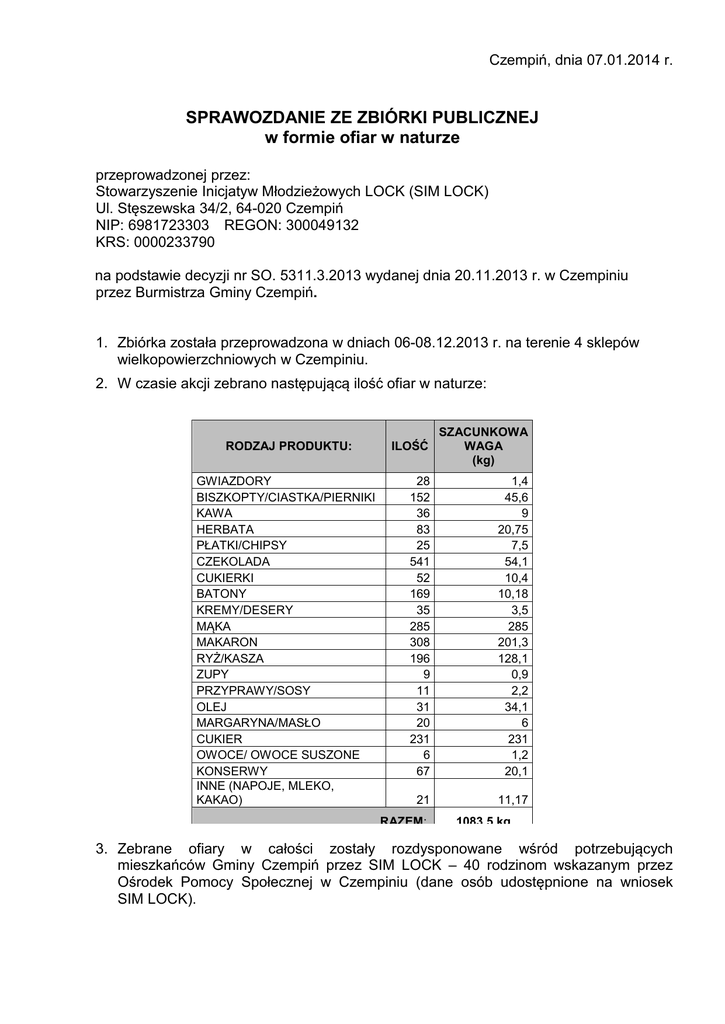 Czempiń, dnia 07.01.2014 r. SPRAWOZDANIE ZE ZBIÓRKI PUBLICZNEJ w formie ofiar w naturze przeprowadzonej przez: Stowarzyszenie Inicjatyw Młodzieżowych LOCK (SIM LOCK) Ul. Stęszewska 34/2, 64-020 Czempiń NIP: 6981723303 REGON: 300049132 KRS: 0000233790 na podstawie decyzji nr SO. 5311.3.2013 wydanej dnia 20.11.2013 r. w Czempiniu przez Burmistrza Gminy Czempiń. 1. Zbiórka została przeprowadzona w dniach 06-08.12.2013 r. na terenie 4 sklepów wielkopowierzchniowych w Czempiniu. 2. W czasie akcji zebrano następującą ilość ofiar w naturze: RODZAJ PRODUKTU: GWIAZDORY BISZKOPTY/CIASTKA/PIERNIKI KAWA HERBATA PŁATKI/CHIPSY CZEKOLADA CUKIERKI BATONY KREMY/DESERY MĄKA MAKARON RYŻ/KASZA ZUPY PRZYPRAWY/SOSY OLEJ MARGARYNA/MASŁO CUKIER OWOCE/ OWOCE SUSZONE KONSERWY INNE (NAPOJE, MLEKO, KAKAO) ILOŚĆ SZACUNKOWA WAGA (kg) 28 152 36 83 25 541 52 169 35 285 308 196 9 11 31 20 231 6 67 1,4 45,6 9 20,75 7,5 54,1 10,4 10,18 3,5 285 201,3 128,1 0,9 2,2 34,1 6 231 1,2 20,1 21 11,17 RAZEM: 1083,5 kg 3. Zebrane ofiary w całości zostały rozdysponowane wśród potrzebujących mieszkańców Gminy Czempiń przez SIM LOCK – 40 rodzinom wskazanym przez Ośrodek Pomocy Społecznej w Czempiniu (dane osób udostępnione na wniosek SIM LOCK). 4. Rozliczenie kosztów poniesionych na przeprowadzenie zbiórki publicznej: Rodzaj kosztu Opłata skarbowa Kwota planowana 82,00 zł Kwota Uzasadnienie wydatkowana Umorzenie opłaty skarbowej 0,00 zł Koszty plakatów 30,00 zł 0,00 zł Koszty ulotek 150,00 zł 0,00 zł Koszty administracyjne 50,00 zł 20,05 zł 312,00 zł 20,05 zł RAZEM: Celem zredukowania kosztów do minimum wykorzystane zostały plakaty pozostające w stałych zasobach SIM LOCK Celem zredukowania kosztów do minimum wykorzystane zostały ulotki znajdujące się w zasobach SIM LOCK Koszty dodatkowych usług ksero porozumień o współpracy dla wolontariuszy 5. Forma podania sprawozdania do wiadomości publicznej: Ogłoszenie na stronie internetowej SIM LOCK w terminie 08.01-08.02.2014 r.: http://simlock.czempin.w.interia.pl/ - zakładka aktualności Ogłoszenie na portalu internetowym NGO w terminie 08.01-08.02.2014 r.: http://ogloszenia.ngo.pl/komunikaty (-) Daria Jakielczyk Wiceprzewodnicząca Zarządu SIM LOCK
