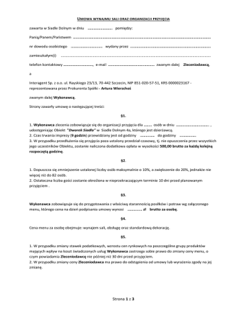 UMOWA WYNAJMU SALI ORAZ ORGANIZACJI PRZYJĘCIA zawarta w Siadle Dolnym w dniu ……………………. pomiędzy: Panią/Panem/Państwem ………………………………………………………………………………………………………………………….. nr dowodu osobistego ………………………….. wydany przez ………………………………………………………………………. zamieszkałym(i) …………………………………………………………………………………………………………………………………………. telefon kontaktowy …………………………, e-mail ……………………………………….. zwanym dalej Zleceniodawcą, a Interagent Sp. z o.o. ul. Rayskiego 23/13, 70-442 Szczecin, NIP 851-020-57-51, KRS 0000023167 reprezentowana przez Prokurenta Spółki - Artura Wierzchoś zwanym dalej Wykonawcą. Strony zawarły umowę o następującej treści: §1. 1. Wykonawca zlecenia zobowiązuje się do organizacji przyjęcia dla …….. osób w dniu ……………………………. , udostępniając Obiekt "Dworek Siadło" w Siadle Dolnym 4a, którego jest dzierżawcą. 2. Czas trwania imprezy (9 godzin) przewidziany jest od godziny …………… do godziny …………….. 3. W przypadku przedłużenia się przyjęcia poza ustalony przedział czasowy, tj. nie opuszczenia przez wszystkich jego uczestników Obiektu, zostanie naliczona dodatkowa opłata w wysokości 500,00 brutto za każdą kolejną rozpoczętą godzinę. §2. 1. Dopuszcza się zmniejszenie ustalonej liczby osób maksymalnie o 10%, a zwiększenie do 20%, jednakże nie więcej niż do 82 osób. 2. Ostateczna liczba gości zostanie określona w nieprzekraczającym terminie 10 dni przed planowanym przyjęciem . §3. Wykonawca zobowiązuje się do przygotowania z właściwą starannością posiłków i potraw wg załączonego menu, którego cena na dzień podpisania umowy wynosi …………… zł brutto za osobę. §4. Cena menu za osobę obejmuje: wynajem sali, obsługę oraz standardową dekorację. §5. 1. W przypadku zmiany stawek podatkowych, wzrostu cen rynkowych na poszczególne grupy produktów mających wpływ na koszt świadczonych usług Wykonawca zastrzega sobie prawo do zmiany ceny menu, o czym powiadamia Zleceniodawcę nie później niż 30 dni przed przyjęciem. 2. W przypadku zmiany ceny Zleceniodawca ma prawo do odstąpienia od umowy lub wyrażenia zgody na jej zmianę. Strona 1 z 3 §6. 1. 2. Wyroby cukiernicze (ciasta, torty, paczki), których nie obejmuje menu, zostaną dostarczone najpóźniej w dniu planowanego przyjęcia przez Zleceniodawcę wraz z dowodem potwierdzającym datę produkcji oraz producenta. Wyroby własne, wymagające pokrojenia (np. blacha ciasta), powinny być przygotowane i pokrojone w chwili dostarczenia przez Zleceniodawcę – w przeciwnym wypadku zostanie naliczona dodatkowa opłata w wysokości 10 zł od każdego wyrobu. §7. Zimne przekąski, które obejmuje menu, będą uzupełniane w trakcie przyjęcia. §8. 1. Alkohole zostaną dostarczone przez Zleceniodawcę najpóźniej w dniu planowanego przyjęcia. 2. Wykonawca zapewni warunki niezbędne do ich przechowywania oraz możliwość swobodnego dysponowania nimi w czasie przyjęcia przez Zleceniodawcę. §9. Produkty żywnościowe pozostałe po zakończeniu imprezy zostaną przekazane Zleceniodawcy bezpośrednio po jej zakończeniu. §10. 1. 2. 3. 4. Zleceniodawca ponosi odpowiedzialność za zdarzenia zaistniałe podczas przyjęcia spowodowane przez jego uczestników. Zleceniodawca odpowiada za wszelkie zniszczenia spowodowane przez uczestników, jak również stwierdzone braki w wyposażeniu sali weselnej, toalety lub innych pomieszczeń dostępnych dla uczestników przyjęcia. Wykonawca winien poinformować Zleceniodawcę o stwierdzonych stratach w terminie 3 dni od dnia zakończenia przyjęcia weselnego. Wysokość strat zostanie określona na podstawie faktur dokumentujących naprawę uszkodzeń lub obopólnej wyceny szkody. Wykonawca udostępnia Zleceniodawcy pomieszczenie zamykane na klucz, garderobę dla gości, jednocześnie nie ponosząc odpowiedzialności za pozostawione rzeczy. §11 1. 2. 3. Wykonawca zobowiązuje się do zapewnienia sprawnej obsługi i bezpieczeństwa gości. Zleceniodawca przyjmuje do wiadomości, iż obiekt jest monitorowany całodobowo przez licencjonowaną firmę ochroniarską upoważnioną do działań przywracających ład i porządek w przypadku ich zakłócenia, a z chwilą, kiedy ta interwencja w stosunku do uczestników przyjęcia okaże się nieskuteczna ma prawo wezwać policję lub inne jednostki interwencyjne na koszt i odpowiedzialność Zleceniodawcy. Wykonawca zastrzega sobie prawo, a Zleceniodawca upoważnia Wykonawcę do przerwania przyjęcia lub do interwencji w trakcie trwania przyjęcia w przypadku zaistnienia okoliczności zagrażających bezpieczeństwu osób znajdujących się na terenie Obiektu lub zagrożenia niszczenia mienia Zleceniobiorcy. §12. 1. Zleceniodawca organizuje oprawę muzyczną we własnym zakresie. Z tytułu wykorzystania utworów muzycznych Zleceniodawca zapłaci opłatę na rzecz ZAiKS we własnym zakresie. 2. Wykonawca umożliwi członkom zespołu muzycznego zatrudnionego przez Zleceniodawcę, podłączenie niezbędnych instrumentów i urządzeń nagłaśniających. Strona 2 z 3 §13. 1. Wykonawca zlecenia otrzyma za powyższą usługę kwotę ……………… zł (słownie : …………………………………… …………………………………….… 00/100 zł), przelewem na rachunek bankowy: 81 1750 1077 0000 0000 1129 3158, ustaloną na dzień podpisania umowy, z czego: a) ………………… zł (słownie: ………………………………………………………………. 00/100 zł) w formie opłaty rezerwacyjnej, która zostanie przekazana Wykonawcy w ciągu 3 dniu przelewem bankowym. b) 20% ogólnej kwoty tj. …