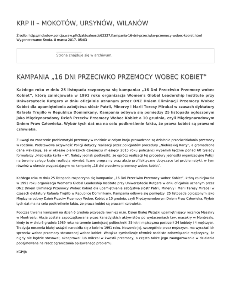 KRP II – MOKOTÓW, URSYNÓW, WILANÓW Źródło: http://mokotow.policja.waw.pl/r2/aktualnosci/62327,Kampania-16-dni-przeciwko-przemocy-wobec-kobiet.html Wygenerowano: Środa, 8 marca 2017, 05:03 Strona znajduje się w archiwum. KAMPANIA „16 DNI PRZECIWKO PRZEMOCY WOBEC KOBIET” Każdego roku w dniu 25 listopada rozpoczyna się kampania: „16 Dni Przeciwko Przemocy wobec Kobiet”, którą zainicjowała w 1991 roku organizacja Women's Global Leadership Institute przy Uniwersytecie Rutgers w dniu oficjalnie uznanym przez ONZ Dniem Eliminacji Przemocy Wobec Kobiet dla upamiętnienia zabójstwa sióstr Patrii, Minervy i Marii Teresy Mirabal w czasach dyktatury Rafaela Trujillo w Republice Dominikany. Kampania odbywa się pomiędzy 25 listopada ogłoszonym jako Międzynarodowy Dzień Przeciw Przemocy Wobec Kobiet a 10 grudnia, czyli Międzynarodowym Dniem Praw Człowieka. Wybór tych dat ma na celu podkreślenie faktu, że prawa kobiet są prawami człowieka. Z uwagi na znaczenie problematyki przemocy w rodzinie w całym kraju prowadzone są działania przeciwdziałania przemocy w rodzinie. Podstawowa aktywność Policji dotyczy realizacji przez policjantów procedury „Niebieskiej Karty”, a gromadzone dane wskazują, że w okresie pierwszych dziesięciu miesięcy 2015 roku policjanci wypełnili łącznie ponad 60 tysięcy formularzy „Niebieska karta – A”. Należy jednak podkreślić, że oprócz realizacji tej procedury jednostki organizacyjne Policji na terenie całego kraju realizują również liczne programy oraz akcje profilaktyczne dotyczące tej problematyki, w tym również w okresie przypadającym na kampanię „16 dni przeciwko przemocy wobec kobiet”. Każdego roku w dniu 25 listopada rozpoczyna się kampania: „16 Dni Przeciwko Przemocy wobec Kobiet”, którą zainicjowała w 1991 roku organizacja Women's Global Leadership Institute przy Uniwersytecie Rutgers w dniu oficjalnie uznanym przez ONZ Dniem Eliminacji Przemocy Wobec Kobiet dla upamiętnienia zabójstwa sióstr Patrii, Minervy i Marii Teresy Mirabal w czasach dyktatury Rafaela Trujillo w Republice Dominikany. Kampania odbywa się pomiędzy 25 listopada ogłoszonym jako Międzynarodowy Dzień Przeciw Przemocy Wobec Kobiet a 10 grudnia, czyli Międzynarodowym Dniem Praw Człowieka. Wybór tych dat ma na celu podkreślenie faktu, że prawa kobiet są prawami człowieka. Podczas trwania kampanii na dzień 6 grudnia przypada również m.in. Dzień Białej Wstążki upamiętniający rocznicę Masakry w Montrealu. Akcja została zapoczątkowana przez kanadyjskich aktywistów po wydarzeniach tzw. masakry w Montrealu, kiedy to w dniu 6 grudnia 1989 roku na terenie tamtejszej politechniki 25-letni mężczyzna postrzelił 24 kobiety i 4 mężczyzn. Tradycja noszenia białej wstążki narodziła się z kolei w 1991 roku. Noszenie jej, szczególnie przez mężczyzn, ma wyrażać ich sprzeciw wobec przemocy stosowanej wobec kobiet. Wstążka symbolizuje również osobiste zobowiązanie mężczyzny, że nigdy nie będzie stosował, akceptował lub milczał w kwestii przemocy, a często także jego zaangażowanie w działania podejmowane na rzecz ograniczania opisywanego problemu. KGP/jb Ocena: 0/5 (0) Tweetnij