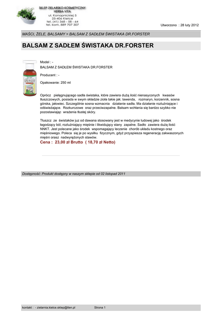 Utworzono : 28 luty 2012 MAŚCI, ŻELE, BALSAMY > BALSAM Z SADŁEM ŚWISTAKA DR.FORSTER BALSAM Z SADŁEM ŚWISTAKA DR.FORSTER Model : BALSAM Z SADŁEM ŚWISTAKA DR.FORSTER Producent : Opakowanie: 250 ml Oprócz pielęgnującego sadła świstaka, które zawiera dużą ilość nienasyconych kwasów tłuszczowych, posiada w swym składzie zioła takie jak: lawenda, rozmaryn, korzennik, sosna górska, jałowiec. Szczególnie sosna wzmacnia działanie sadła. Ma działanie rozluźniające i odświeżające. Rozkurczowe oraz przeciwzapalne. Balsam wchłania się bardzo szybko nie pozostawiając wrażenia tłustej skóry. Tłuszcz ze świstaków juz od dawana stosowany jest w medycynie ludowej jako środek łagodzący ból, rozluźniający mięśnie i likwidujący stany zapalne. Sadło zawiera dużą ilość NNKT. Jest polecane jako środek wspomagający leczenie chorób układu kostnego oraz mięśniowego. Poleca się je po wysiłku fizycznym, gdyż przyspiesza regenerację zakwaszonych mięśni orasz nadwyrężonych stawów. Cena : 23,00 zł Brutto ( 18,70 zł Netto) Dostępność: Produkt dostępny w naszym sklepie od 02 listopad 2011 kontakt : - [email protected] Strona 1