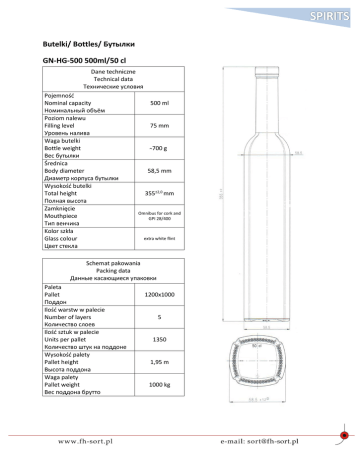 Butelki/ Bottles/ Бутылки GN-HG-500 500ml/50 cl Dane techniczne Technical data Технические условия Pojemność Nominal capacity Номинальный объём Poziom nalewu Filling level Уровень налива Waga butelki Bottle weight Вес бутылки Średnica Body diameter Диаметр корпуса бутылки Wysokość butelki Total height Полная высота Zamknięcie Mouthpiece Тип венчика Kolor szkła Glass colour Цвет стекла 500 ml 75 mm ̴700 g 58,5 mm 355±2,0 mm Omnibus for cork and GPI 28/400 extra white flint Schemat pakowania Packing data Данные касающиеся упаковки Paleta Pallet Поддон Ilość warstw w palecie Number of layers Количество слоев Ilość sztuk w palecie Units per pallet Количество штук на поддоне Wysokość palety Pallet height Высота поддона Waga palety Pallet weight Вес поддона брутто 1200x1000 5 1350 1,95 m 1000 kg