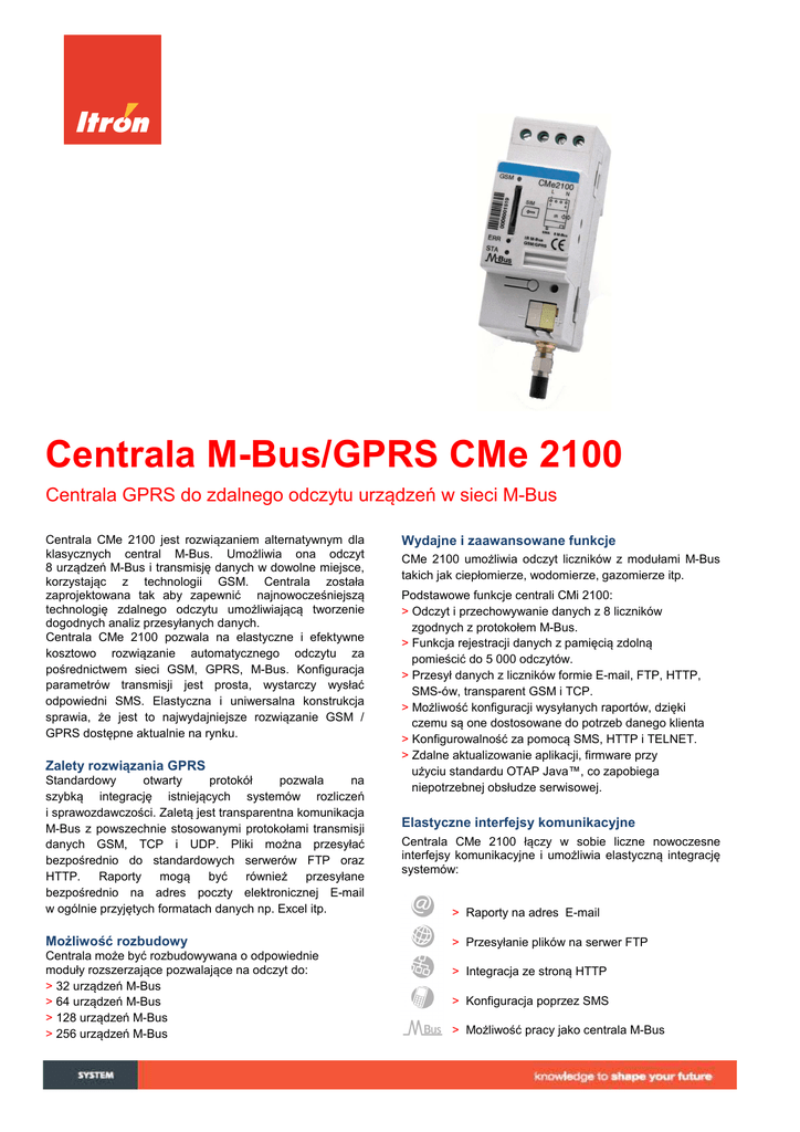 ace Centrala M-Bus/GPRS CMe 2100 Centrala GPRS do zdalnego odczytu urządzeń w sieci M-Bus Centrala CMe 2100 jest rozwiązaniem alternatywnym dla klasycznych central M-Bus. Umożliwia ona odczyt 8 urządzeń M-Bus i transmisję danych w dowolne miejsce, korzystając z technologii GSM. Centrala została zaprojektowana tak aby zapewnić najnowocześniejszą technologię zdalnego odczytu umożliwiającą tworzenie dogodnych analiz przesyłanych danych. Centrala CMe 2100 pozwala na elastyczne i efektywne kosztowo rozwiązanie automatycznego odczytu za pośrednictwem sieci GSM, GPRS, M-Bus. Konfiguracja parametrów transmisji jest prosta, wystarczy wysłać odpowiedni SMS. Elastyczna i uniwersalna konstrukcja sprawia, że jest to najwydajniejsze rozwiązanie GSM / GPRS dostępne aktualnie na rynku. Zalety rozwiązania GPRS Standardowy otwarty protokół pozwala na szybką integrację istniejących systemów rozliczeń i sprawozdawczości. Zaletą jest transparentna komunikacja M-Bus z powszechnie stosowanymi protokołami transmisji danych GSM, TCP i UDP. Pliki można przesyłać bezpośrednio do standardowych serwerów FTP oraz HTTP. Raporty mogą być również przesyłane bezpośrednio na adres poczty elektronicznej E-mail w ogólnie przyjętych formatach danych np. Excel itp. Możliwość rozbudowy Centrala może być rozbudowywana o odpowiednie moduły rozszerzające pozwalające na odczyt do: > 32 urządzeń M-Bus > 64 urządzeń M-Bus > 128 urządzeń M-Bus > 256 urządzeń M-Bus Wydajne i zaawansowane funkcje CMe 2100 umożliwia odczyt liczników z modułami M-Bus takich jak ciepłomierze, wodomierze, gazomierze itp. Podstawowe funkcje centrali CMi 2100: > Odczyt i przechowywanie danych z 8 liczników zgodnych z protokołem M-Bus. > Funkcja rejestracji danych z pamięcią zdolną pomieścić do 5 000 odczytów. > Przesył danych z liczników formie E-mail, FTP, HTTP, SMS-ów, transparent GSM i TCP. > Możliwość konfiguracji wysyłanych raportów, dzięki czemu są one dostosowane do potrzeb danego klienta > Konfigurowalność za pomocą SMS, HTTP i TELNET. > Zdalne aktualizowanie aplikacji, firmware przy użyciu standardu OTAP Java™, co zapobiega niepotrzebnej obsłudze serwisowej. Elastyczne interfejsy komunikacyjne Centrala CMe 2100 łączy w sobie liczne nowoczesne interfejsy komunikacyjne i umożliwia elastyczną integrację systemów: > Raporty na adres E-mail > Przesyłanie plików na serwer FTP > Integracja ze stroną HTTP > Konfiguracja poprzez SMS > Możliwość pracy jako centrala M-Bus PARAMETRY TECHNICZNE Parametry GSM/GPRS Częstotliwości 850/900/1800/1900 MHz Dane GSM do 14,4 bps, v.110 tryb nietransparentny Dane GPRS Multislot, do klasy 12 Interfejsy komunikacyjne Adres e-mail FTP HTTP przy użyciu SMTP standardowy klient FTP Możliwość rozbudowy o moduły rozszerzające: > CmeX10S dla 32 urządzeń M-Bus > CmeX11S dla 64 urządzeń M-Bus > CmeX12S dla 128 urządzeń M-Bus > CmeX13S dla 256 urządzeń M-Bus > Naścienna antena GSM standardowy klient HTTP, POST & GET Transparent M-Bus GSM CSD Transparent M-Bus Stały IP TCP Specyfikacje funkcjonalne Zasilanie sieciowe Pobór mocy 100-240 VAC, 50/60 Hz <2,5 W max. Temperatura działania 5° C-55° C Temperatura przechowywania 0° C - 55° C Specyfikacja funkcji centrali M-Bus Standard M-Bus Prędkość transmisji M-Bus Maks. ilość dodatkowych urządzeń M-Bus Maks. długość kabla PN-EN 1434-3, PN-EN 13757-2 / -3. 300 i 2400 bodów 8 urządzeń (możliwość rozszerzenia) 1000 m Funkcja rejestratora Pamięć danych 1,3 MB Przeciętna ilość zapamiętywanych rejestrów 5000 Programowalne okresy rejestracji 1/5/10/15/20/30 min, 1godz,12godz, 1 dz., 1 tydz, 1 mies. Itron na świecie Grupa Itron jest światowym liderem w produkcji i sprzedaży urządzeń pomiarowych i rozwiązań technologicznych związanych z gromadzeniem danych oraz systemów wspomagających zarządzanie energią. Współpracujemy z ponad 8 000 instytucji na świecie , które zaufały naszej technologii, aby optymalnie wykorzystywać i dostarczać energię oraz wodę. Wśród naszych produktów znajdują się liczniki energii elektrycznej, gazu, wody oraz energii cieplnej; systemy zbierania danych i komunikacji, w tym systemy automatycznego zdalnego odczytu danych pomiarowych z liczników (systemy AMR) oraz systemy dla zaawansowanych infrastruktur pomiarowych (AMI). Itron Polska Sp. z o.o. 30-702 Kraków ul.T.Romanowicza 6 www.itron.pl , e-mail: [email protected] tel: +48 +48 +48 fax: +48 12 257 10 27 12 257 10 28 12 257 10 29 12 257 10 25
