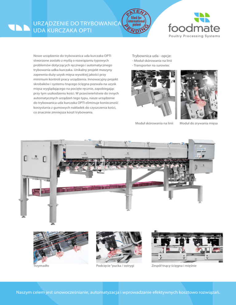 URZĄDZENIE DO TRYBOWANICA UDA KURCZAKA OPTI Nowe urządzenie do trybowanica uda kurczaka OPTI stworzone zostało z myślą o rozwiązaniu typowych problemów dotyczących ręcznego i automatycznego trybowania udka kurczaka. Unikalny projekt maszyny zapewnia duży uzysk mięsa wysokiej jakości przy minimum kontroli pracy urządzenia. Innowacyjny projekt skrobaków i systemu tnącego ścięgna pozwala na uzysk mięsa wyglądającego na pocięte ręcznie, zapobiegając przy tym uszkodzeniu kości. W przeciwieństwie do innych automatycznych urządzeń tego typu, nasze urządzenie do trybowanica uda kurczaka OPTI eliminuje konieczność korzystania z gumowych nakładek do czyszczenia kości, co znacznie zmniejsza koszt trybowania. Trybownica uda - opcje: - Moduł skórowania na linii - Transporter na surowiec Moduł skórowania na linii Trzymadło Podcięcie “pucka / ostrygi Moduł do zrywania mięsa Zespół tnący ścięgna i mięśnie Naszym celem jest unowocześnianie, automatyzacja i wprowadzanie efektywnych kosztowo rozwiązań. URZĄDZENIE DO TRYBOWANICA UDA KURCZAKA OPTI Firma Foodmate została założona w 2006 roku w Holandii. Produkujemy urządzenia do przetwórstwa żywności, specjalizując się w przetwórstwie drobiu. Ostatnio uruchomiliśmy Foodmate US w celu szerszej dystrybucji naszych urządzeń w Ameryce Północnej i na całym świecie. Dzięki stałym unowocześnieniom i ogromnej wiedzy wynikającej z dziesiątek lat doświadczenia w branży, wprowadzamy innowacyjność i automatyzację, co pozwala na stałe zmniejszanie kosztów. GŁÓWNE ZALETY • Prędkość trybowania: 80-100 udek kurczaka na minutę • Zwiększa uzysk • Łatwe w załadunku i obsłudze Na naszą ofertę składa się szeroki zakres urządzeń do transportu żywca, uboju i skubania, patroszenia, chłodzenia, ważenia, trybowania, systemy dzielenia i wiele innych. Oprócz produkcji urządzeń zapewniamy również szeroki wybór części zamiennych, używanych urządzeń oraz serwis innego sprzętu do przetwórstwa. Foodmate dostarcza również sprzęt wykorzystywany do myjni przemysłowych, włączając w to myjki pojemniko, palet oraz cymbrów. • Zapobiega uszkodzeniu kości lub rozrywaniu • Mięso wygląda na pocięte ręcznie • Skraca czas czyszczenia i kontroli pracy • Zwiększa efektywność pracownika • Mechanizacja zmniejsza nakład pracy Nasz zespół cechuje wieloletnie doświadczenie i profesjonalizm, które pozwalają na projektowanie, usprawnianie i wprowadzanie rozwiązań spełniających stale zmieniające się potrzeby klientów Foodmate. • Redukuje koszty obsługi i konserwacji 1 2 1 3 2 4 Dane Techniczne: • Konstrukcja: Stal nierdzewna 304 i materiały syntetyczne z atestem FDA • Moc silnika (IP66): 2,85 kW (razem ze skórowaczką): 3,4 kW • Przyłącze zasilania: 1 główne przyłącze zasilania do panelu sterowania • Czyszczenie: Łatwość czyszczenia, spełnia • Wymiary urządzenia: - Długość: 5723 mm - Szerokość: 1666 mm - Wysokość: 2116 mm - Waga: ok. 2080 kg B 3 5 4 6 5 7 6 8 9 7 10 8 11 9 10 B C 5723 mm. (18' - 9") 1666 mm. (5' - 6") 5723 mm. (18' - 9") 1666 mm. D E 2116 mm. (6' - 11") D 2116 mm. (6' - 11") C E F F G G G RV 7-3-2012 Update<br> Changes: Revision Appr. by Date: Description: H Thigh deboner OPTI H FOODMATE B.V. Röntgenstraat 18 • 3261 LK Oud-Beijerland P.O. Box 1405 • 3260 AK Oud-Beijerland The Netherlands Phone: +31-186 630240 • Fax: +31-186 630249 [email protected] www.foodmate.nl 1 2 1 FOODMATE US, Inc. 300 Wilbanks Drive, Ball Ground, GA 30107 P.O. Box 4116, CAnton, GA 30114 U.S.A. Phone: +1-678-819-5270 (U.S.) • Fax: +1-678-819-5273 [email protected] www.foodmateus.com 3 2 4 3 5 4 6 5 7 6 FOODMATE B.V. Röntgenstraat 18 3261 LK Oud-beijerland THE NETHERLANDS Tel. +31 (0)186 630240 Fax +31 (0)186 630249 [email protected] www.foodmate.nl 8 7 9 8 Linear tolerances (mm)* Angular deviation of shortest side Linear 0,5≥6 6>30 30>120 120>315 315>1000 1000>2000 2000> - >10 10 >50 50 >120 120 > - (* at G ±0,1 RV 0,5≥6 6>30 state ±0,2 ±0,3 7-3-2012 ±0,5 Update<br> ±0,8 ±1,2 ±2,0 ±1,0° ±0,5° ±0,3° ±0,2° Changes: Revision Appr. by Date: ±0,1 ±0,2 General roughness Ra 6,3* Group: Description: Tolerances acc. to. Dimension tol. acc. to. NEN 3311 NEN 2365 NEN 3634 Roughness acc.OPTI to. Thigh deboner Machine Material: THE INFORMATION CONTAINED IN THE IN THIS DRAWING IS THE SOLEFOODMATE B.V. Status: 18 Approved THIS D PROPERTY OF FOODMATE. Röntgenstraat 3261 LK Oud-beijerland PROPE ANY REPRODUCTION IN PART OR Prev: FM.00.690.B01 THE NETHERLANDS ANY RE AS WHOLE WITHOUT THE WRITTEN Tel. +31 (0)186 630240 Part number: AS WH PERMISSION OF FOODMATEFax IS +31 (0)186 630249 PERMI PROHIBITED. [email protected] PROHI www.foodmate.nl FM.00.690 10 9 11 10