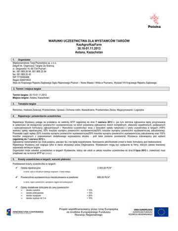 WARUNKI UCZESTNICTWA DLA WYSTAWCÓW TARGÓW KazAgro/KazFarm 30.10-01.11.2013 Astana, Kazachstan 1. Organizator Międzynarodowe Targi Poznańskie sp. z o.o. Zespół ds. Organizacji Targów Za Granicą ul. Głogowska 14, 60-734 Poznań tel.: 061 869 26 94, 061 869 23 54 fax: 061 869 20 40 NIP 7770000488 Regon 004870933 Wpis do Krajowego Rejestru Sądowego Sądu Rejonowego Poznań – Nowe Miasto i Wilda w Poznaniu, Wydział VIII Krajowego Rejestru Sądowego. 2. Termin i miejsce targów Termin targów: 30.10-01.11.2013 Miejsce targów: Astana, Kazachstan 3. Tematyka targów Rolnictwo, Hodowla Zwierząt, Przetwórstwo, Uprawa i Ochrona roślin, Nawadnianie, Przetwórstwo ZboŜa, Magazynowanie i Logistyka 4. Rejestracja i potwierdzenie uczestnictwa Rejestracja Wystawcy polega na przesłaniu do siedziby MTP najpóźniej do dnia 7 czerwca 2013 r. (po tym terminie zgłoszenia będą przyjmowane w zaleŜności od dostępności powierzchni wystawienniczej na dzień przesłania zgłoszenia) dwóch kompletnych, właściwie wypełnionych, podpisanych i opieczętowanych formularzy zgłoszeniowych i ‘Warunków uczestnictwa’ wraz z dowodem wpłaty naleŜności z tytułu uczestnictwa w targach (100% wartości opłaty rejestracyjnej, 50% kosztów wynajmu powierzchni wystawienniczej/50% kosztów wynajmu powierzchni wystawienniczej zabudowanej). Pozostała część wpłaty (50% kosztów wynajmu powierzchni wystawienniczej/50% kosztów wynajmu powierzchni wystawienniczej zabudowanej oraz 100% kosztów związanych z zapewnieniem dodatkowego wyposaŜenia stoiska – jeśli takie zostanie zamówione) Wystawca zobowiązany jest wpłacić najpóźniej do 7 czerwca 2012 r. Zgłoszenia niekompletne (np. brak podpisu, pieczęci itp.) nie będą rozpatrywane. Nanoszenie jakichkolwiek zmian w treści formularzy jest niedozwolone. Rejestracja Wystawcy jest wiąŜąca tylko w dacie akceptacji przez Organizatora. Wystawcami mogą być wyłącznie te firmy, których zakres branŜowy odpowiada tematyce targów. Organizator moŜe odwołać uczestnictwo w targach Wystawców, którzy nie uiścili w całości kosztów uczestnictwa do dnia 5 lipca 2013 r. (naleŜność musi znajdować się na koncie MTP sp. z o.o.) 5. Koszty uczestnictwa w targach; warunki płatności Podstawowe koszty uczestnictwa w targach: Opłata rejestracyjna: 2.300,00 PLN* w cenie: wpis w oficjalnym katalogu targowym, 2 karty wstępu Powierzchnia wystawiennicza niezabudowana w pawilonie: 850,00 PLN* w cenie: najem powierzchni, sprzątanie ciągów komunikacyjnych Opłaty dodatkowe doliczane do ceny powierzchni • • • • stoisko naroŜne stoisko półwyspowe stoisko wyspowe stoisko wyŜsze niŜ 3 m + 10% + 15% + 20% + 10% Projekt współfinansowany przez Unię Europejską ze środków Europejskiego Funduszu Rozwoju Regionalnego 1.100,00 PLN/ m2* Powierzchnia wystawiennicza zabudowana w cenie: najem powierzchni, ściany boczne, ściana tylnia stoiska, wykładzina podłogowa, fryz z nazwą firmy, 1 stół, 4 krzesła, lada informacyjna, przyłącza prądu (220V/2kW), 1 gniazdko, 3 punkty świetlne, kosz na śmieci 400,00 PLN/ m2* Powierzchnia niezabudowana poza pawilonem: Zapłata za uczestnictwo w targach powinna być uiszczona terminowo zgodnie z informacjami podanymi przez Organizatora. Dane na fakturze są prawnie wiąŜące. Koszty bankowe są ponoszone przez Wystawcę. Płatności naleŜy regulować przelewem bankowym na niŜej podane konto. NaleŜności związane z uczestnictwem w targach będą regulowane w walucie polskiej (PLN) na konto: * Opłata / cena netto nie uwzględnia podatku od towarów i usług. Podatek ten zostanie doliczony przy fakturowaniu w przypadkach określonych w obowiązujących przepisach. PKO BP SA: 38 1020 4027 0000 1102 0424 2962 Płatność, zrealizowana musi zostać następująco: 100% wartości opłaty rejestracyjnej, 50% kosztów wynajmu powierzchni wystawienniczej/50% kosztów wynajmu powierzchni wystawienniczej zabudowanej muszą zostać wpłacone na konto MTP najpóźniej w dniu przesłania do MTP podpisanych i opieczętowanych dwóch kompletnych, właściwie wypełnionych formularzy zgłoszeniowych i ‘Warunków Uczestnictwa’ wraz z dowodem wpłaty – najpóźniej do 7 czerwca 2013 r. Pozostała część wpłaty (50% kosztów wynajmu powierzchni wystawienniczej/50% kosztów wynajmu powierzchni wystawienniczej zabudowanej oraz 100% kosztów związanych z zapewnieniem dodatkowego wyposaŜenia stoiska – jeśli takie zostanie zamówione) Wystawca zobowiązany jest wpłacić najpóźniej do 5 lipca 2013r. 6. Odwołanie uczestnictwa Rezygnacja Wystawcy z udziału w targach przedstawiona w formie pisemnej po określonym terminie zgłoszeń upowaŜnia MTP do obciąŜenia Wystawcy wszystkimi kosztami związanymi z uczestnictwem w targach, tj. 100% opłaty rejestracyjnej, 100% kosztów wynajmu powierzchni wystawienniczej oraz 100% kosztów związanych z zabudową oraz zapewnieniem dodatkowego wyposaŜenia stoiska (jeśli takie zostanie zamówione). Zgłaszając swoje uczestnictwo w Wystawca nie wyraŜa sprzeciwu wobec obciąŜeń związanych z rezygnacją i zobowiązuje się uiścić je bez zwłoki, zgodnie z terminem płatności podanym przez Organizatora. 7. Miejsce rozwiązywania sporów Wszelkie spory mogące wyniknąć z tytułu uczestnictwa w targach będą rozstrzygane przez właściwy rzeczowo sąd powszechny w Poznaniu. Dla rozstrzygania ewentualnych sporów przyjmuje się jako obowiązujący tekst niniejszych ‘Warunków Uczestnictwa dla Uczestników Targów KazAgro/KazFarm 2013’. Prawem obowiązującym przy interpretacji postanowień niniejszych ‘‘Warunków Uczestnictwa dla Uczestników Targów KazAgro/KazFarm 2013’ jest prawo polskie. 8. Kontakt Ewa Ostrowska tel. (61) 869 26 94 tel. (61) 869 20 40 [email protected] 9. Marta Torzewska tel. (61) 869 23 54 tel. (61) 869 20 40 [email protected] Akceptacja warunków uczestnictwa W imieniu firmy _________________________________________________