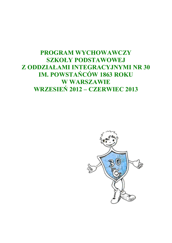 PROGRAM WYCHOWAWCZY SZKOŁY PODSTAWOWEJ Z ODDZIAŁAMI INTEGRACYJNYMI NR 30 IM. POWSTAŃCÓW 1863 ROKU W WARSZAWIE WRZESIEŃ 2012 – CZERWIEC 2013 Część V PROGRAM EDUKACJI EKOLOGICZNEJ Skarbnica polskiej przyrody wrzesień 2012 roku – czerwiec 2013 roku w ramach programu wychowawczego „Serce dla przyrody” Sposób realizacji: Udział w MIEJSKIM PROGRAMIE WSPIERANIA EDUKACJI EKOLOGICZNEJ MIASTA ST. WARSZAWY DLA DZIECI W WIEKU PRZEDSZKOLNYM I WCZESNOSZKOLNYM. Podejmowanie działań w ramach programu „WSPIERANIE EDUKACJI EKOLOGICZNEJ W PLACÓWKACH OŚWIATOWYCH M. ST. WARSZAWY” - realizacja projektu „WARSZAWA STOLICĄ CZYSTOŚCI”. Szkoła będzie organizatorem Dzielnicowych Obchodów 150 rocznicy wybuchu Powstania Styczniowego pod hasłem „ROK 2013 – ROKIEM POWSTANIA STYCZNIOWEGO”. Szkoła będzie organizatorem II Praskiego Konkursu Szkół Podstawowych z Pomocy Przedmedycznej „NIE BĄDŹ OBOJĘTNY – TY TEŻ MOŻESZ POMÓC”. Zespoły klasowe wraz z wychowawcami przygotują przedstawienia, a nauczyciele opracują regulaminy i przeprowadzą międzyklasowe konkursy, uwzględniające treści zawarte w Programie Wychowawczym Szkoły: „SERCE DLA PRZYRODY” – „SKARBNICA POLSKIEJ PRZYRODY”. Opracowanie i realizacja klasowych projektów „ZIELONĄ SCIEŻKĄ PRZEZ POLSKĘ”. Każda klasa zaplanuje wycieczkę wybranym szlakiem turystycznym po Polsce. Prezentacja zrealizowanych projektów klasowych oraz podsumowanie III etapu programu wychowawczego szkoły „SKARBNICA POLSKIEJ PRZYRODY” nastąpi w czasie festynu „Majówka z 30”. 2 Harmonogram przedstawień i uroczystości realizowanych w ramach szkolnego programu wychowawczego, klasy 0 - VI Oddział Odpowiedzialni klasowy 0a M. Wojtaś 0b E. Bogusz A. Jank0c Soporowska 1a E. Haraburda 1b J. Izdebska 1c K. Błażejewska 2a A. Otto-Orzeł 2b W.Kłos 2c E. Janik 2d H. Barańska 2e U. Derkacz 3a K. Karolak 3b 3c M. JuszyńskaNycz K. GuzekHorowska 3d Ł. Owczarski 4a W. Wydrzyński 4b I. Jawoszek 4c A. Serzysko 5a 5b H. Mielczarek E. Gołba 5c M. Karolkiewicz 6a 6b R. Seliga A. Mierzejewska 6c R. Potrac 6d D. Zygardowicz Tytuł przedstawienia Termin “Zielona Wielkanoc” “Zielone lato” marzec 2013 czerwiec 2013 „Choinka piękna jak las” grudzień 2012 Ślubowanie klas pierwszych „Z Pyzą na polskich dróżkach” 12 października 2012 „W świecie barw i kolorów” „Nasi skrzydlaci przyjaciele” „Eko – drużyna na start” kwiecień 2013 grudzień 2012 luty 2013 „Niech bije zielone serce przyrody” „Bezpieczna zima” listopad 2012 „Zielone podróże” marzec/kwiecień 2013 „Żyj z przyrodą w zgodzie” „Witaj majowo jutrzenko” Rocznica Święta Niepodległości – 11 Listopada Rocznica Święta 3 Maja Święta Wielkanocne styczeń 2013 czerwiec 2013 maj 2013 listopad 2012 maj 2013 marzec 2013 Rocznica Święta Niepodległości – 11 Listopada listopad 2012 Święto Patrona Szkoły styczeń 2013 Koncert świąteczny „Do szopy, hej pasterze” grudzień 2012 Uroczystość zakończenia klas szóstych czerwiec 2013 3 Konkursy realizowane w ramach szkolnego programu wychowawczego, klasy 0 - III Nazwa konkursu Termin Odpowiedzialni Międzyklasowy turniej: „Działamy praktycznie i ekologicznie” luty marzec kwiecień Klasy 2 – U. Derkacz Klasy 3 – Ł. Owczarski Klasy 1 – J. Izdebska Szkolny konkurs muzyczno -plastyczny: „Śpiewanki-malowanki ” listopad M. Wojtaś M. Gulatowska Szkolny konkurs plastyczno-techniczny: „Ptasia stołówka” grudzień Szkolny konkurs plastyczny: „Piękno polskiej przyrody” – zakładki do książek Międzyklasowy turniej czytelniczy: „Lektury czytamy i dobrze je znamy” A. Otto-Orzeł maj W. Kłos A. Jank - Soporowska maj/ czerwiec Klasy 1 – E. Haraburda Klasy 2 – H. Barańska Klasy 3 – K. Karolak 4 Konkursy polonistyczne, historyczne i religijne realizowane w ramach szkolnego programu wychowawczego, klasy IV-VI Nazwa konkursu I etap Wojewódzkiego Konkursu Polonistycznego dla uczniów klas VI Termin Odpowiedzialni A. Mierzejewska październik D. Zygardowicz E. Gołba Dzielnicowy konkurs „Mistrz Ortografii” w SP 258 maj A. Mierzejewska Dzielnicowy Konkurs Recytatorski „Warszawska Syrenka” kwiecień A. Mierzejewska Dzielnicowy Konkurs Recytatorski „Witaj Majowa Jutrzenko” kwiecień D. Zygardowicz Warszawski konkurs literacki „Wydajemy własną książkę” – współpraca z MDK Muranów wrzesień/ marzec D. Zygardowicz Szkolny całoroczny konkurs „Lubię czytanie” październik/maj E. Gołba Szkolny konkurs - Reklama ulubionej książki: „Ta książka wywarła na mnie największe wrażenie” luty/marzec E. Gołba Szkolny konkurs literacki na napisanie utworu do fotografii krajobrazu „Pejzaże Polski” kwiecień Dzielnicowy konkurs „ Kartka z pamiętnika” – projekt obchodów Powstania 1863 r. kwiecień Dzielnicowy Festiwal pieśni patriotycznych – podsumowanie projektu Konkursy zewnętrzne dla ucznia zdolnego wg harmonogramu nadsyłanego przez organizatorów E. Gołba H. Mielczarek E. Gołba A. Czajkowska maj E. Gołba Ł. Owczarski E. Gołba cały rok D. Zygardowicz A. Mierzejewska Szkolny konkurs - Związki frazeologiczne w życiu codziennym (bogacenie słownictwa uczniów) marzec A. Mierzejewska październik D. Zygardowicz Szkolny Konkurs Pięknego czytania listopad D. Zygardowicz Szkolna Olimpiada Ortograficzna luty D. Zygardowicz Szkolny Mistrz Ortografii – 3 etapy luty/ marzec/ kwiecień A. Mierzejewska maj A. Mierzejewska Szkolny konkurs „Piękna nasza Polska cała” Dzielnicowy Konkurs Mistrz Ortografii w SP 258 5 Szkolny konkurs - Najstaranniej prowadzony zeszyt do języka polskiego styczeń, czerwiec Jan Paweł II – Papież Rodziny październik Diecezjalne konkursy religijne cały rok Ogólnopolski Konkurs Historyczny „Krąg” Szkolny multimedialny - Przywódcy Powstania Styczniowego, Bitwy Powstania Styczniowego A. Mierzejewska s. E Popiołek K. Przesmycka s. E. Popiołek