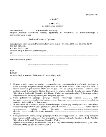 Załącznik Nr 4 „ Wzór ” U M OWA na dożywianie uczniów zawarta w dniu ...................... w Koronowie, pomiędzy: Miejsko-Gminnym Ośrodkiem Pomocy Społecznej w Koronowie, ul. Pomianowskiego 1, reprezentowanym przez : Dariusza Karwata – Dyrektora działającego z upoważnienia Burmistrza Koronowa z dnia 1 kwietnia 2009 r. nr SG/0113-32/09 NIP 967 005 62 14 REGON 091221240 zwanym dalej w umowie „Zamawiającym”, a) ..................................................................................................................................................................... ............................................................................................................................................................. reprezentowanym przez : ........................................................................... ............................................................................ NIP REGON zwanym dalej w umowie „Wykonawcą”, następującej treści. §1 1. Umowa zostaje zawarta w wyniku przeprowadzonego postępowania o zamówienie publiczne w trybie przetargu nieograniczonego, na podstawie art. 40 i nast. ustawy z dnia 29 stycznia 2004 r. – Prawo zamówień publicznych (Dz.U. Nr 19, poz. 177) na usługę dożywiania - uczniów szkół podstawowych i gimnazjów Gminy Koronowo w miejscowościach: Buszkowo, Łąsko Wielkie Wierzchucin Królewski, Sitowiec, Witoldowo, Wtelno, na podstawie oferty Wykonawcy będącej załącznikiem do niniejszej umowy jako integralna jej część. 2. Cena jednostkowa jednego gorącego posiłku obiadowego wynosi ................ netto (słownie: .........................złotych), brutto ............... (słownie: ............................................. złotych) zgodnie z załącznikiem Nr 3 do umowy. 3. W zależności od aktualnych potrzeb Zamawiającego, orientacyjny miesięczny koszt dożywiania uczniów szkół podstawowych i gimnazjów Gminy Koronowo................................... będzie wynosił ....................... złotych netto (słownie: ................................................................ złotych) ..................złotych brutto (słownie: .................................................................................. złotych). 4. Ceny jednostkowe brutto jednego gorącego posiłku zawierają podatek VAT oraz koszty transportu (dowozu) do szkół podstawowych i gimnazjów w miejscowościach: Buszkowo, Łąsko Wielkie, Wierzchucin Królewski, Witoldowo, Sitowiec, Wtelno. 5. Wykonawca gwarantuje niezmienność ceny przez cały okres obowiązywania umowy, tj. od dnia 1 września 2009 r. do dnia 30 czerwca 2010 r. 6. Umowa zostaje zawarta na czas określony i obowiązuje strony od dnia 1 września 2009 r. do dnia 30 czerwca 2010 r. §2 1. Przedmiotem niniejszej umowy jest przygotowanie i dowóz własnym (dzierżawionym na podstawie załączonej do niniejszej umowy, umowy dzierżawy) transportem gorących posiłków obiadowych w atestowanych jednorazowych naczyniach przeznaczonych do przechowywania żywności, składających się z: a) mięsa (raz w tygodniu ryba) b) ziemniaków c) surówki o łącznej wartości kalorycznej 800 kcl, z wyłączeniem dań z jaj, do szkół podstawowych i gimnazjów Gminy Koronowo do miejscowości: Buszkowo, Łąsko Wielkie, Wierzchucin, Królewski, Witoldowo, Sitowiec i Wtelno. 2. Gorące posiłki obiadowe winny być dowożone do szkół podstawowych i gimnazjów o których mowa w § 1 ust. 1 umowy i spożywane przez uczniów w stołówkach lub innych miejscach do tego celu przeznaczonych, wskazanych przez dyrektorów szkół. 3. Wykonawca wykona przedmiot umowy własnymi siłami w ramach prowadzonej działalności gospodarczej. 4. Wykonawca ustali bezpośrednio z dyrektorami szkół godziny dowozu gorących posiłków obiadowych oraz wszelkie inne sprawy z tym związane. §3 1. Wykonawca oświadcza, że jest należycie przygotowany do wykonania niniejszej umowy, posiada odpowiednie zaplecze techniczne, gospodarcze i osobowe na przygotowywanie i dowóz gorących posiłków obiadowych do wskazanych przez Zamawiającego szkół podstawowych i gimnazjów Gminy Koronowo w miejscowościach: Buszkowo, Łąsko Wielkie, Witoldowo, Wtelno, Sitowiec i Wierzchucin Królewski. 2. Gorące posiłki obiadowe będą dostarczane przez Wykonawcę w okresie od 1 września 2009 r. do dnia 30 czerwca 2010 r., w dniach od poniedziałku do piątku każdego tygodnia, z wyłączeniem ferii zimowych i wakacji oraz dni wolnych od nauki w szkole. §4 1. Posiłki o których mowa w § 2 ust. 1 umowy Wykonawca zobowiązuje się przygotowywać wg obowiązujących receptur oraz zasad żywienia dzieci i młodzieży, w ilości zapewniającej dzienne potrzeby Zamawiającego. 2. Zamawiający zobowiązuje się do bieżącego informowania Wykonawcy o wszelkich zmianach dotyczących dziennych ilościowych potrzeb gorących posiłków obiadowych. §5 1. Wykonawca nie ma prawa zlecania wykonywania przedmiotu umowy osobom trzecim. 2. Naruszenie obowiązku o którym mowa w ust. 1, skutkuje natychmiastowym rozwiązaniem umowy, bez zachowania okresu wypowiedzenia. §6 Listy uczniów uprawnionych do spożywania gorących posiłków obiadowych Zamawiający przekaże Wykonawcy : 1) za okres od IX/2009 do VI/2010 r. – w terminie do dnia 31 sierpnia 2009r. §7 1. Za wykonanie przedmiotu umowy Zamawiający zapłaci Wykonawcy kwotę w wysokości iloczynu (sumy) wynikającego z przemożenia ilości faktycznie wydanych i spożytych posiłków przez uczniów w danym miesiącu kalendarzowym netto, z doliczeniem podatku od towarów i usług VAT. 2. Zapłata za wykonanie przedmiotu umowy nastąpi przelewem na podstawie prawidłowo wystawionej faktury VAT w terminie 14 dni od daty jej otrzymania od Wykonawcy wraz z wykazem uczniów faktycznie spożywających gorące posiłki obiadowe w danym miesiącu kalendarzowym. 3. Wykonawca posiada rachunek rozliczeniowy w banku ..................................