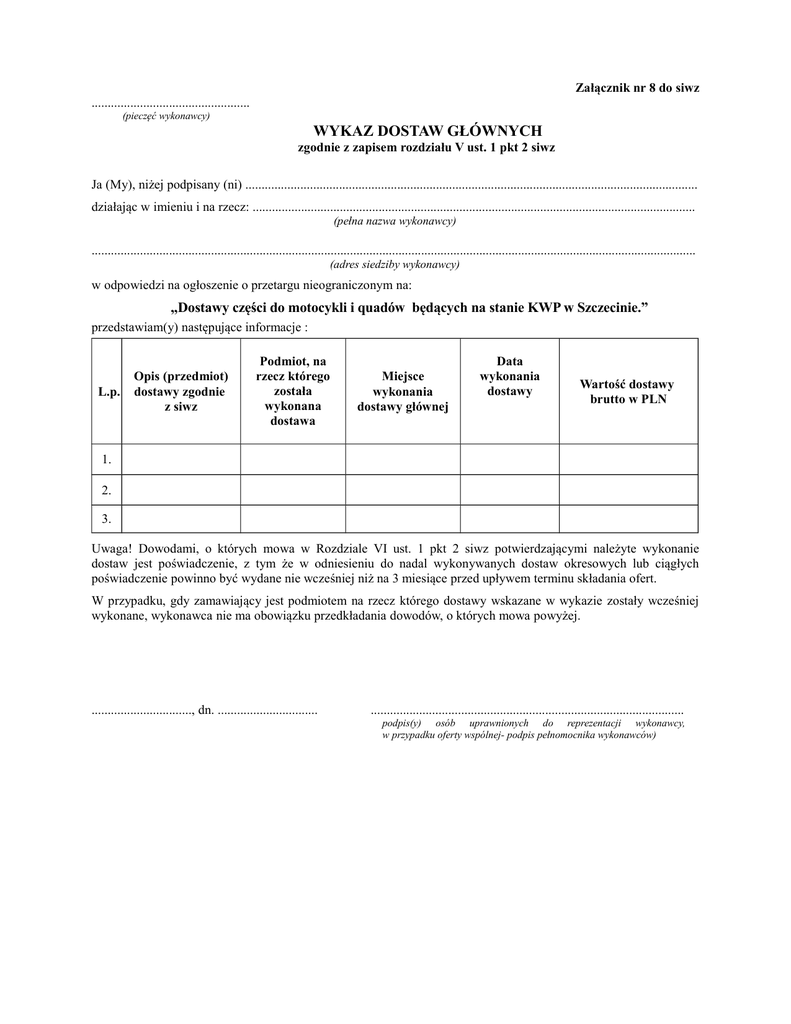 Załącznik nr 8 do siwz ................................................. (pieczęć wykonawcy) WYKAZ DOSTAW GŁÓWNYCH zgodnie z zapisem rozdziału V ust. 1 pkt 2 siwz Ja (My), niżej podpisany (ni) ............................................................................................................................................ działając w imieniu i na rzecz: ......................................................................................................................................... (pełna nazwa wykonawcy) ........................................................................................................................................................................................... (adres siedziby wykonawcy) w odpowiedzi na ogłoszenie o przetargu nieograniczonym na: „Dostawy części do motocykli i quadów będących na stanie KWP w Szczecinie.” przedstawiam(y) następujące informacje : L.p. Opis (przedmiot) dostawy zgodnie z siwz Podmiot, na rzecz którego została wykonana dostawa Miejsce wykonania dostawy głównej Data wykonania dostawy Wartość dostawy brutto w PLN 1. 2. 3. Uwaga! Dowodami, o których mowa w Rozdziale VI ust. 1 pkt 2 siwz potwierdzającymi należyte wykonanie dostaw jest poświadczenie, z tym że w odniesieniu do nadal wykonywanych dostaw okresowych lub ciągłych poświadczenie powinno być wydane nie wcześniej niż na 3 miesiące przed upływem terminu składania ofert. W przypadku, gdy zamawiający jest podmiotem na rzecz którego dostawy wskazane w wykazie zostały wcześniej wykonane, wykonawca nie ma obowiązku przedkładania dowodów, o których mowa powyżej. ..............................., dn. ............................... ................................................................................................. podpis(y) osób uprawnionych do reprezentacji wykonawcy, w przypadku oferty wspólnej- podpis pełnomocnika wykonawców)