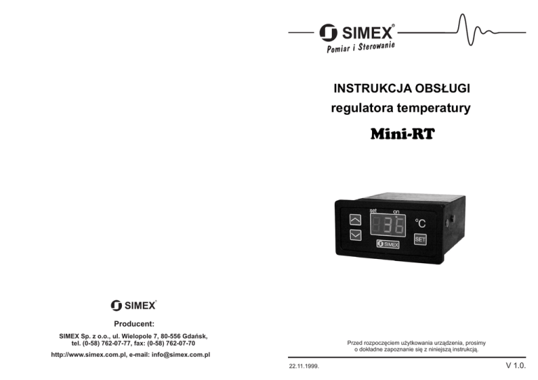 R SIMEX INSTRUKCJA OBS£UGI regulatora temperatury Mini-RT R SIMEX Producent: SIMEX Sp. z o.o., ul. Wielopole 7, 80-556 Gdañsk, tel. (0-58) 762-07-77, fax: (0-58) 762-07-70 Przed rozpoczêciem u¿ytkowania urz¹dzenia, prosimy o dok³adne zapoznanie siê z niniejsz¹ instrukcj¹. http://www.simex.com.pl, e-mail: [email protected] 22.11.1999. V 1.0. Instrukcja obs³ugi regulatora temperatury Mini-RT Instrukcja obs³ugi regulatora temperatury Mini-RT Analogicznie dla trybu “grzanie”: Zastosowanie on Programowany regulator temperatury typu Mini-RT wykonany zosta³ w technologii SMT. Umo¿liwia regulacjê temperatury z dok³adnoœci¹ 1%, lecz nie lepiej ni¿ 1oC. Posiada wyjœcie przekaŸnikowe o obci¹¿alnoœci 2A/230V AC oraz mo¿liwoœæ programowego ustalania parametrów pracy. Zasilany jest bezpoœrednio z sieci 220V. Wszystkie parametry pracy regulatora temperatury zapamiêtywane s¹ w pamiêci nieulotnej EEPROM, zapewniaj¹c zachowanie raz ustawionych parametrów nawet po zaniku zasilania. Urz¹dzenie dziêki swoim niewielkim rozmiarom, wysokiemu stopniu ochrony IP65 (od frontu) i szerokiemu zakresowi programowania mo¿e znaleŸæ zastosowanie w rozmaitych uk³adach automatyki wymagaj¹cych bie¿¹cych informacji na temat temperatury oraz mo¿liwoœci sterowania uk³adami wykonawczymi (np. zaworami, grza³kami, pompami, itp.). Regulator temperatury Mini-RT wspó³pracuje w zale¿noœci od wersji z czujnikami Pt100 lub termistorami typu HED-TH.103. wykres 2 (tryb grzanie) próg - histereza off próg USTAWIANIE OPÓNIENIA ZA£¥CZENIA PRZEKANIKA Opcja ta pozwala na ustawianie opóŸnienia za³¹czenia przekaŸnika w zakresie od 0 do 99. Wybór jednostki czasu - patrz P06. SET SET Dane techniczne: wyœwietlacz rozdzielczoœæ dok³adnoœæ zakres iloœæ progów wejœcie wyjœcie zasilanie stopieñ ochrony temp. pracy temp. sk³adowania obudowa materia³ obudowy LED, 3 dekady, wysokoœæ cyfr 10 mm 1°C 1% ± jedna cyfra wersja: 01 : 0°C ¸ +50°C 02 : -50°C ¸ +150°C 022 : 0°C ¸ +250°C 03 : -25°C ¸ +25°C jeden Pt100 lub termistorowe typu HED-TH.103 przekaŸnikowe 2A/230V AC (cosj =1) 230V AC / 1,5V A IP 65 (od frontu) 0°C ¸ +50°C -10°C ¸ +70°C tablicowa NORYL - GFN2S E1 + w³ókno szklane Wymiary: on > set > 36 mm Wymiary obudowy od frontu 72 mm 159 o C - zmiana wartoœci (+) - zmiana wartoœci (-) USTAWIANIE OPÓNIENIA WY£¥CZENIA PRZEKANIKA Opcja ta pozwala na ustawianie opóŸnienia wy³¹czenia przekaŸnika w zakresie od 0 do 99. Wybór jednostki czasu - patrz P06. SET SET - zmiana wartoœci (+) - zmiana wartoœci (-) WYBÓR JEDNOSTKI CZASU Opcja ta pozwala na wybór jednostki czasu dla parametrów 0 - sekundy SET 1 - minuty i : SET SET SIMEX - zmiana wartoœci (+) - zmiana wartoœci (-) 98 mm 5 mm POWRÓT DO TRYBU POMIARU - Wymiary obudowy z boku Opcja ta pozwala na wyjœcie z trybu programowania i powrót do pomiaru. Wymiary otworu 2 32 mm 66 mm UWAGA! - brak operacji na klawiaturze przez ok. 60 sek. powoduje automatyczne wyjœcie z trybu programowania SET POMIAR 7 Instrukcja obs³ugi regulatora temperatury Mini-RT Instrukcja obs³ugi regulatora temperatury Mini-RT Opis p³yty czo³owej USTAWIANIE HISTEREZY - dioda LED informuje, ¿e znajdujemy siê w trybie programowania Opcja ta pozwala na ustawianie histerezy temperaturowej w zakresie od 0oC do 99oC. dioda LED sygnalizuj¹ca za³¹czenie przekaŸnika SET SET zmniejszenie ustawianego parametru (+) - zmiana wartoœci (+) - zmiana wartoœci ( - ) USTAWIANIE STANU PRZEKANIKA - zwiêkszenie ustawianego parametru (-) Opcja ta pozwala na ustawianie stanu przekaŸnika w chwili uszkodzenia czujnika : 0 - off - przekaŸnik w stanie spoczynku. 1 - on - przekaŸnik w stanie dzia³ania. - przejœcie w tryb programowania - zapisanie nowej wartoœci do pamiêci SET SET Opis tylnej œcianki: - zmiana wartoœci (+ ) - zmiana wartoœci ( - ) termistor HED-TH.103 Pt100 PRZEKANIK USTAWIANIE TRYBU PRACY PRZEKANIKA - ZASILANIE Opcja ta pozwala na ustawianie trybu pracy przekaŸnika. Do wyboru s¹ dwa tryby: 0 - dzia³anie przekaŸnika dla trybu "ch³odzenie" 1 - dzia³anie przekaŸnika dla trybu "grzanie" 1 2 PRZEKANIK ZASILANIE 3 4 5 6 7 1 2 3 4 5 6 7 Patrz wykres 1 (str. 6) i wykres 2 (str. 7). SET Mini-RT wersja 02 lub 022 do wspó³pracy z czujnikiem Pt100 SET Mini-RT wersja 01 i 03 do wspó³pracy z czujnikiem termistorowym typu HED-TH.103 - zmiana wartoœci (+) - zmiana wartoœci (-) Warunkiem prze³¹czenia przekaŸnika, oprócz wartoœci temperatury jest up³yniêcie ¿¹danego czasu trwania temperatury (parametry P04, P05) i tak np.: w Dla trybu "ch³odzenie" przekaŸnik zostanie w³¹czony, gdy temperatura mierzona jest wiêksza od wartoœci "próg + histereza", a czas (mierzony od chwili pierwszego przekroczenia punktu "próg + histereza") utrzymywania siê temperatury powy¿ej wartoœci ustawionego progu jest równy czasowi ustawionemu parametrem "P04". on wykres 1 (tryb ch³odzenie) próg 6 próg + histereza off UWAGA! - Przekroczenie zakresu temperaturowego sygnalizowane jest komunikatem 3 Instrukcja obs³ugi regulatora temperatury Mini-RT Pêtla g³ówna algorytmu programowania Przycisk SET powoduje przejœcie w tryb programowania (patrz od do³u strony). Instrukcja obs³ugi regulatora temperatury Mini-RT Wyœwietlane komunikaty w pêtli g³ównej - próg dzia³ania przekaŸnika - histereza temperaturowa SET - stan przekaŸnika w chwili uszkodzenia czujnika SET - tryb pracy przekaŸnika - opóŸnienie za³¹czania przekaŸnika SET - opóŸnienie wy³¹czania przekaŸnika - wybór jednostek czasu dla P04 i P05 SET - powrót do trybu pomiaru SET WEJŒCIE W TRYB PROGRAMOWANIA - SET Wciœniêcie klawisza SET w trybie pomiaru spowoduje przejœcie w tryb programowania parametrów. Sygnalizowane jest to zapaleniem siê kropki na wyœwietlaczu pod napisem SET. SET SET POMIAR SET USTAWIANIE PROGU DZIA£ANIA PRZEKANIKA - SET Opcja ta pozwala na ustawianie progu dzia³ania przekaŸnika w zakresie temperaturowym w zale¿no