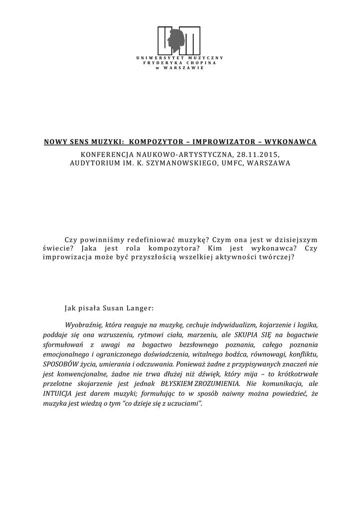 U N I W E R S Y T E T M U Z Y C Z N Y F R Y D E R Y K A C H O P I N A w W A R S Z A W I E NOWY SENS MUZYKI: KOMPOZYTOR – IMPROWIZATOR – WYKONAWCA KONFERENCJA NAUKOWO-ARTYSTYCZNA, 28.11.2015, AUDYTORIUM IM. K. SZYMANOWSKIEGO, UMFC, WARSZAWA Czy powinniśmy redefiniować muzykę? Czym ona jest w dzisiejszym świecie? Jaka jest rola kompozytora? Kim jest wykonawca? Czy improwizacja może być przyszłością wszelkiej aktywności twórczej? Jak pisała Susan Langer: Wyobraźnię, która reaguje na muzykę, cechuje indywidualizm, kojarzenie i logika, poddaje się ona wzruszeniu, rytmowi ciała, marzeniu, ale SKUPIA SIĘ na bogactwie sformułowań z uwagi na bogactwo bezsłownego poznania, całego poznania emocjonalnego i ograniczonego doświadczenia, witalnego bodźca, równowagi, konfliktu, SPOSOBÓW życia, umierania i odczuwania. Ponieważ żadne z przypisywanych znaczeń nie jest konwencjonalne, żadne nie trwa dłużej niż dźwięk, który mija – to krótkotrwałe przelotne skojarzenie jest jednak BŁYSKIEM ZROZUMIENIA. Nie komunikacja, ale INTUICJA jest darem muzyki; formułując to w sposób naiwny można powiedzieć, że muzyka jest wiedzą o tym “co dzieje się z uczuciami”. Czy muzyka jest wciąż w fazie wegetatywnej swego rozwoju? Pragnienie jest siłą stojącą poza umysłem, która wprawia go w działanie i czyni produktywnym. Zbyt aktywny umysł przestaje być krytyczny, podobnie jak żarłoczność gubi wybredność. Dzieci mylą sen z rzeczywistością, fakty z fikcją, tworząc nieprawdopodobne kombinacje idei w pogoni za POCHŁONIĘCIEM wszystkiego, zrozumieniem przytłaczającego potopu doświadczeń. Pośród pewnych ludów, które nazywamy dzikimi, już samo posługiwanie się językiem świadczy o szalejącej konfuzji metaforycznych znaczeń złączonych z każdym symbolem, czasem aż do całkowitego zaciemnienia rozsądnego, dosłownego znaczenia. Cailliet, który badał to zjawisko, nazywa ten okres “WEGETATYWNYM” stadium myśli, przyrównując tę niezwykłą plątaninę niedosłownej symboliki do dżungli, w której rzeczy wzajemnie się przytałaczają z nadmiaru rozrostu. Przyczyna owej nadmiernej obfitości symboli leży w intelektualnych potrzebach młodej rasy. Czekamy artystycznych, perspektyw. na propozycje wykładów, prelekcji i które podejmują proponowany temat prezentacji z różnych ZGŁOSZENIA W FORMIE ABSTRAKTÓW PROSIMY PRZESYŁAĆ DO DNIA 19 PAŹDZIERNIKA NA ADRES: [email protected] Przewidziane są honoraria dla aktywnych uczestników konferencji. KOORDYNATOR: mgr Robert Jędrzejewski, tel: 698 226 572