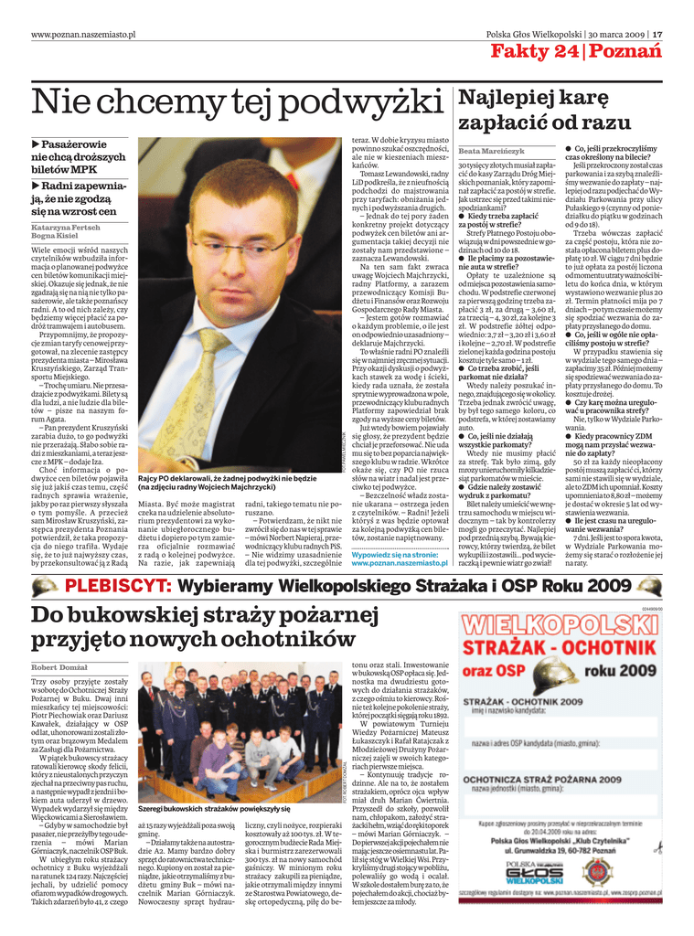 www.poznan.naszemiasto.pl Polska Głos Wielkopolski | 30 marca 2009 | 17 Fakty 24|Poznań Poznań Nie chcemy tej podwyżki b Pasażerowie niechcądroższych biletówMPK b Radnizapewniają,żeniezgodzą sięnawzrostcen Wiele emocji wśród naszych czytelników wzbudziła informacja o planowanej podwyżce cen biletów komunikacji miejskiej. Okazuje się jednak, że nie zgadzają się na nią nie tylko pasażerowie, ale także poznańscy radni. A to od nich zależy, czy będziemy więcej płacić za podróż tramwajem i autobusem. Przypomnijmy, że propozycje zmian taryfy cenowej przygotował, na zlecenie zastępcy prezydenta miasta – Mirosława Kruszyńskiego, Zarząd Transportu Miejskiego. – Trochę umiaru. Nie przesadzajcie z podwyżkami. Bilety są dla ludzi, a nie ludzie dla biletów – pisze na naszym forum Agata. – Pan prezydent Kruszyński zarabia dużo, to go podwyżki nie przerażają. Słabo sobie radzi zmieszkaniami, a teraz jeszcze z MPK – dodaje Iza. Choć informacja o podwyżce cen biletów pojawiła się już jakiś czas temu, część radnych sprawia wrażenie, jakby po raz pierwszy słyszała o tym pomyśle. A przecież sam Mirosław Kruszyński, zastępca prezydenta Poznania potwierdził, że taka propozycja do niego trafiła. Wydaje się, że to już najwyższy czas, by przekonsultować ją z Radą FOT.PAWEŁMIECZNIK Katarzyna Fertsch Bogna Kisiel Rajcy PO deklarowali, że żadnej podwyżki nie będzie (na zdjęciu radny Wojciech Majchrzycki) Miasta. Być może magistrat czeka na udzielenie absolutorium prezydentowi za wykonanie ubiegłorocznego budżetu i dopiero po tym zamierza oficjalnie rozmawiać z radą o kolejnej podwyżce. Na razie, jak zapewniają radni, takiego tematu nie poruszano. – Potwierdzam, że nikt nie zwrócił się do nas w tej sprawie – mówi Norbert Napieraj, przewodniczący klubu radnych PiS. – Nie widzimy uzasadnienie dla tej podwyżki, szczególnie teraz. W dobie kryzysu miasto powinno szukać oszczędności, ale nie w kieszeniach mieszkańców. TomaszLewandowski,radny LiD podkreśla, że z nieufnością podchodzi do majstrowania przy taryfach: obniżania jednych i podwyższania drugich. – Jednak do tej pory żaden konkretny projekt dotyczący podwyżek cen biletów ani argumentacja takiej decyzji nie zostały nam przedstawione – zaznacza Lewandowski. Na ten sam fakt zwraca uwagę Wojciech Majchrzycki, radny Platformy, a zarazem przewodniczący Komisji Budżetu i Finansów oraz Rozwoju Gospodarczego Rady Miasta. – Jestem gotów rozmawiać o każdym problemie, o ile jest on odpowiednio uzasadniony – deklaruje Majchrzycki. To właśnie radni PO znaleźli sięwnajmniejzręcznejsytuacji. Przy okazji dyskusji o podwyżkach stawek za wodę i ścieki, kiedy rada uznała, że została sprytniewyprowadzonawpole, przewodniczącykluburadnych Platformy zapowiedział brak zgody na wyższe ceny biletów. Już wtedy bowiem pojawiały się głosy, że prezydent będzie chciał je przeforsować. Nie uda mu się to bez poparcia największego klubu w radzie. Wkrótce okaże się, czy PO nie rzuca słów na wiatr i nadal jest przeciwko tej podwyżce. – Bezczelność władz zostanie ukarana – ostrzega jeden z czytelników. – Radni! Jeżeli któryś z was będzie optował za kolejną podwyżką cen biletów, zostanie napiętnowany. Wypowiedz się na stronie: www.poznan.naszemiasto.pl Najlepiej karę zapłacić od razu Beata Marcińczyk 30tysięcyzłotychmusiałzapłacić do kasy Zarządu Dróg Miejskichpoznaniak,któryzapominał zapłacić za postój w strefie. Jak ustrzec się przed takimi niespodziankami? a Kiedy trzeba zapłacić za postój w strefie? Strefy Płatnego Postoju obowiązująwdnipowszedniewgodzinach od 10 do 18. a Ile płacimy za pozostawienie auta w strefie? Opłaty te uzależnione są odmiejscapozostawieniasamochodu. W podstrefie czerwonej za pierwszą godzinę trzeba zapłacić 3 zł, za drugą – 3,60 zł, za trzecią – 4, 30 zł, za kolejne 3 zł. W podstrefie żółtej odpowiednio: 2,7 zł – 3,20 zł i 3,60 zł i kolejne – 2,70 zł. W podstrefie zielonej każda godzina postoju kosztuje tyle samo – 1 zł. a Co trzeba zrobić, jeśli parkomat nie działa? Wtedy należy poszukać innego,znajdującegosięwokolicy. Trzeba jednak zwrócić uwagę, by był tego samego koloru, co podstrefa, w której zostawiamy auto. a Co, jeśli nie działają wszystkie parkomaty? Wtedy nie musimy płacić za strefę. Tak było zimą, gdy mrozyunieruchomiłykilkadziesiąt parkomatów w mieście. a Gdzie należy zostawić wydruk z parkomatu? Biletnależyumieścićwewnętrzu samochodu w miejscu widocznym – tak by kontrolerzy mogli go przeczytać. Najlepiej podprzedniąszybą.Bywająkierowcy, którzy twierdzą, że bilet wykupiliizostawili...podwycieraczką i pewnie wiatr go zwiał! a Co, jeśli przekroczyliśmy czas określony na bilecie? Jeśliprzekroczonyzostałczas parkowania i za szybą znaleźliśmy wezwanie do zapłaty – najlepiejodrazupodjechaćdoWydziału Parkowania przy ulicy Pułaskiego 9 (czynny od poniedziałku do piątku w godzinach od 9 do 18). Trzeba wówczas zapłacić za część postoju, która nie została opłacona biletem plus dopłatę 10 zł. W ciągu 7 dni będzie to już opłata za postój liczona odmomentuutratyważnościbiletu do końca dnia, w którym wystawiono wezwanie plus 20 zł. Termin płatności mija po 7 dniach – potym czasie możemy się spodziać wezwania do zapłaty przysłanego do domu. a Co, jeśli w ogóle nie opłaciliśmy postoju w strefie? W przypadku stawienia się w wydziale tego samego dnia – zapłacimy35zł.Późniejmożemy sięspodziewaćwezwaniadozapłaty przysłanego do domu. To kosztuje drożej. a Czy karę można uregulować u pracownika strefy? Nie, tylko w Wydziale Parkowania. a Kiedy pracownicy ZDM mogą nam przysłać wezwanie do zapłaty? 50 zł za każdy nieopłacony postój muszą zapłacić ci, którzy sami nie stawili się w wydziale, aletoZDMichupomniał.Koszty up