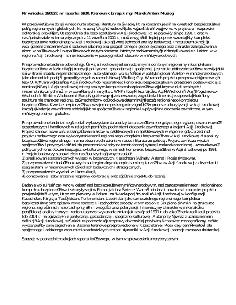 Nr wniosku: 190527, nr raportu: 5920. Kierownik (z rap.): mgr Marek