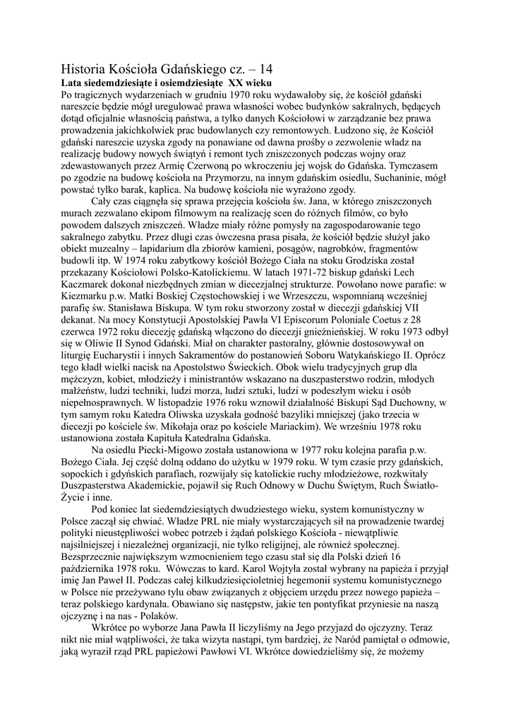Historia Kościoła Gdańskiego cz. – 14 Lata siedemdziesiąte i osiemdziesiąte XX wieku Po tragicznych wydarzeniach w grudniu 1970 roku wydawałoby się, że kościół gdański nareszcie będzie mógł uregulować prawa własności wobec budynków sakralnych, będących dotąd oficjalnie własnością państwa, a tylko danych Kościołowi w zarządzanie bez prawa prowadzenia jakichkolwiek prac budowlanych czy remontowych. Łudzono się, że Kościół gdański nareszcie uzyska zgody na ponawiane od dawna prośby o zezwolenie władz na realizację budowy nowych świątyń i remont tych zniszczonych podczas wojny oraz zdewastowanych przez Armię Czerwoną po wkroczeniu jej wojsk do Gdańska. Tymczasem po zgodzie na budowę kościoła na Przymorzu, na innym gdańskim osiedlu, Suchaninie, mógł powstać tylko barak, kaplica. Na budowę kościoła nie wyrażono zgody. Cały czas ciągnęła się sprawa przejęcia kościoła św. Jana, w którego zniszczonych murach zezwalano ekipom filmowym na realizację scen do różnych filmów, co było powodem dalszych zniszczeń. Władze miały różne pomysły na zagospodarowanie tego sakralnego zabytku. Przez długi czas ówczesna prasa pisała, że kościół będzie służył jako obiekt muzealny – lapidarium dla zbiorów kamieni, posągów, nagrobków, fragmentów budowli itp. W 1974 roku zabytkowy kościół Bożego Ciała na stoku Grodziska został przekazany Kościołowi Polsko-Katolickiemu. W latach 1971-72 biskup gdański Lech Kaczmarek dokonał niezbędnych zmian w diecezjalnej strukturze. Powołano nowe parafie: w Kiezmarku p.w. Matki Boskiej Częstochowskiej i we Wrzeszczu, wspomnianą wcześniej parafię św. Stanisława Biskupa. W tym roku stworzony został w diecezji gdańskiej VII dekanat. Na mocy Konstytucji Apostolskiej Pawła VI Episcorum Poloniale Coetus z 28 czerwca 1972 roku diecezję gdańską włączono do diecezji gnieźnieńskiej. W roku 1973 odbył się w Oliwie II Synod Gdański. Miał on charakter pastoralny, głównie dostosowywał on liturgię Eucharystii i innych Sakramentów do postanowień Soboru Watykańskiego II. Oprócz tego kładł wielki nacisk na Apostolstwo Świeckich. Obok wielu tradycyjnych grup dla mężczyzn, kobiet, młodzieży i ministrantów wskazano na duszpasterstwo rodzin, młodych małżeństw, ludzi techniki, ludzi morza, ludzi sztuki, ludzi w podeszłym wieku i osób niepełnosprawnych. W listopadzie 1976 roku wznowił działalność Biskupi Sąd Duchowny, w tym samym roku Katedra Oliwska uzyskała godność bazyliki mniejszej (jako trzecia w diecezji po kościele św. Mikołaja oraz po kościele Mariackim). We wrześniu 1978 roku ustanowiona została Kapituła Katedralna Gdańska. Na osiedlu Piecki-Migowo została ustanowiona w 1977 roku kolejna parafia p.w. Bożego Ciała. Jej część dolną oddano do użytku w 1979 roku. W tym czasie przy gdańskich, sopockich i gdyńskich parafiach, rozwijały się katolickie ruchy młodzieżowe, rozkwitały Duszpasterstwa Akademickie, pojawił się Ruch Odnowy w Duchu Świętym, Ruch ŚwiatłoŻycie i inne. Pod koniec lat siedemdziesiątych dwudziestego wieku, system komunistyczny w Polsce zaczął się chwiać. Władze PRL nie miały wystarczających sił na prowadzenie twardej polityki nieustępliwości wobec potrzeb i żądań polskiego Kościoła - niewątpliwie najsilniejszej i niezależnej organizacji, nie tylko religijnej, ale również społecznej. Bezsprzecznie największym wzmocnieniem tego czasu stał się dla Polski dzień 16 października 1978 roku. Wówczas to kard. Karol Wojtyła został wybrany na papieża i przyjął imię Jan Paweł II. Podczas całej kilkudziesięcioletniej hegemonii systemu komunistycznego w Polsce nie przeżywano tylu obaw związanych z objęciem urzędu przez nowego papieża – teraz polskiego kardynała. Obawiano się następstw, jakie ten pontyfikat przyniesie na naszą ojczyznę i na nas - Polaków. Wkrótce po wyborze Jana Pawła II liczyliśmy na Jego przyjazd do ojczyzny. Teraz nikt nie miał wątpliwości, że taka wizyta nastąpi, tym bardziej, że Naród pamiętał o odmowie, jaką wyraził rząd PRL papieżowi Pawłowi VI. Wkrótce dowiedzieliśmy się, że możemy spodziewać się pielgrzymki Jana Pawła II w 1979 roku. Zaczęliśmy patrzeć inaczej na otaczający nas świat. Planowana przez papieża Polaka pielgrzymka do Polski bardzo niepokoiła komunistyczne władze. Przewidywano, że niepokorny biskup Rzymu może rozbudzić „uśpionego” ducha narodu. Szczególne obawy budził termin pielgrzymki; dziewięćsetna rocznica śmierci świętego Stanisława – biskupa, który zginął za nieposłuszeństwo wobec władzy świeckiej. Bardzo niepokoił się również przywódca Związku Radzieckiego Leonid Breżniew, który po prostu sugerował władzom polskim, aby Ojca Świętego do Polski nie wpuścić. Widząc determinację I sekretarza Edwarda Gierka, ostrzegał: Róbcie, jak uważacie, bylebyście tego później nie żałowali. Krótko przed papieską pielgrzymką władze zezwoliły na dokończenie budowy kościoła NMP Królowej Różańca Świętego na Przymorzu i wzniesienie wysokiej latarnianej wieży. W czerwcu 1979 roku została erygowana parafia p.w. Błogosławionej Doroty z Mątów w Gdańsku-Jasieniu, a w sierpniu parafia p.w. Opatrzności Bożej na drugim gigantycznym osiedlu Gdańska – Zaspie. Bardzo oczekiwana przez Polaków pielgrzymka Jana Pawła II do Polski trwała dziewięć dni tj. od 2 do 10 czerwca 1979 roku. Przykrym dla nas gdańszczan było pominięcie naszego miasta na trasie tej tak ważnej dla naszego Narodu, a pierwszej w dziejach pielgrzymki papieża do Polski, i co również bardzo ważne; papieża – Polaka. Ojciec Święty podczas tej pielgrzymki odwiedził: Warszawę, Gniezno, Częstochowę, Kraków, Kalwarię Zebrzydowską, swoje rodzinne miasto Wadowice, Oświęcim, Nowy Targ i ponownie Kraków, skąd udał się do Watykanu. Pobyt papieża w Polsce był dla n