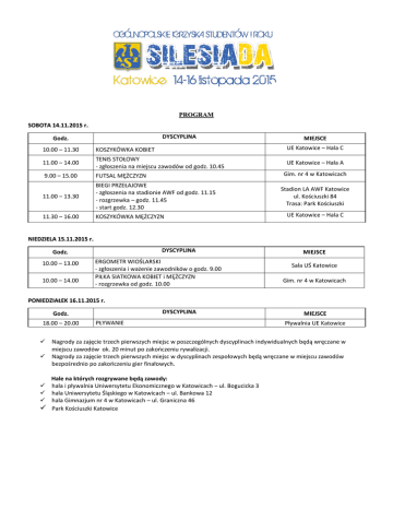 PROGRAM SOBOTA 14.11.2015 r. DYSCYPLINA Godz. MIEJSCE 10.00 – 11.30 KOSZYKÓWKA KOBIET UE Katowice – Hala C 11.00 – 14.00 TENIS STOŁOWY - zgłoszenia na miejscu zawodów od godz. 10.45 UE Katowice – Hala A 9.00 – 15.00 FUTSAL MĘŻCZYZN 11.00 – 13.30 BIEGI PRZEŁAJOWE - zgłoszenia na stadionie AWF od godz. 11.15 - rozgrzewka – godz. 11.45 - start godz. 12.30 11.30 – 16.00 KOSZYKÓWKA MĘŻCZYZN Gim. nr 4 w Katowicach Stadion LA AWF Katowice ul. Kościuszki 84 Trasa: Park Kościuszki UE Katowice – Hala C NIEDZIELA 15.11.2015 r. DYSCYPLINA Godz. 10.00 – 13.00 10.00 – 14.00 ERGOMETR WIOŚLARSKI - zgłoszenia i ważenie zawodników o godz. 9.00 PIŁKA SIATKOWA KOBIET i MĘŻCZYZN - rozgrzewka od godz. 10.00 MIEJSCE Sala UŚ Katowice Gim. nr 4 w Katowicach PONIEDZIAŁEK 16.11.2015 r. DYSCYPLINA Godz. 18.00 – 20.00 PŁYWANIE MIEJSCE Pływalnia UE Katowice Nagrody za zajęcie trzech pierwszych miejsc w poszczególnych dyscyplinach indywidualnych będą wręczane w miejscu zawodów ok. 20 minut po zakooczeniu rywalizacji. Nagrody za zajęcie trzech pierwszych miejsc w dyscyplinach zespołowych będą wręczane w miejscu zawodów bezpośrednio po zakooczeniu gier finałowych. Hale na których rozgrywane będą zawody: hala i pływalnia Uniwersytetu Ekonomicznego w Katowicach – ul. Bogucicka 3 hala Uniwersytetu Śląskiego w Katowicach – ul. Bankowa 12 hala Gimnazjum nr 4 w Katowicach – ul. Graniczna 46 Park Kościuszki Katowice