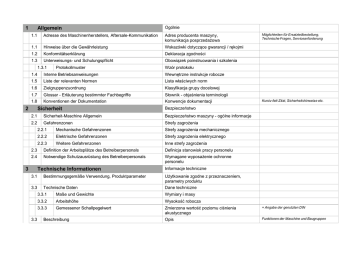 1 Allgemein Ogólnie 1.1 Adresse des Maschinenherstellers, Aftersale-Kommunikation Adres producenta maszyny, komunikacja posprzedażowa 1.1 Hinweise über die Gewährleistung Wskazówki dotyczące gwarancji / rękojmi 1.2 Konformitätserklärung Deklaracja zgodności 1.3 Unterweisungs- und Schulungspflicht Obowiązek poinstruowania i szkolenia 1.3.1 Protokollmuster Wzór protokołu 1.4 Interne Betriebsanweisungen Wewnętrzne instrukcje robocze 1.5 Liste der relevanten Normen Lista właściwych norm 1.6 Zielgruppenzuordnung Klasyfikacja grupy docelowej 1.7 Glossar - Erläuterung bestimmter Fachbegriffe Słownik - objaśnienia terminologii 1.8 Konventionen der Dokumentation Konwencje dokumentacji 2 Sicherheit Sicherheit-Maschine Allgemein Bezpieczeństwo maszyny - ogólne informacje 2.2 Gefahrenzonen Strefy zagrożenia 2.2.1 Mechanische Gefahrenzonen Strefy zagrożenia mechanicznego 2.2.2 Elektrische Gefahrenzonen Strefy zagrożenia elektrycznego 2.2.3 Weitere Gefahrenzonen Inne strefy zagrożenia 2.3 Definition der Arbeitsplätze des Betreiberpersonals Definicja stanowisk pracy personelu 2.4 Notwendige Schutzausrüstung des Betreiberpersonals Wymagane wyposażenie ochronne personelu Technische Informationen Informacje techniczne 3.1 Bestimmungsgemäße Verwendung, Produktparameter Użytkowanie zgodne z przeznaczeniem, parametry produktu 3.3 Technische Daten Dane techniczne 3.3 Kursiv-fett-Zitat, Sicherheitshinweise etc. Bezpieczeństwo 2.1 3 Möglichkeiten für Ersatzteilbestellung, Technische Fragen, Serviceanforderung 3.3.1 Maße und Gewichte Wymiary i masy 3.3.2 Arbeitshöhe Wysokość robocza 3.3.3 Gemessener Schallpegelwert Zmierzona wartość poziomu ciśnienia akustycznego + Angabe der genutzten DIN Opis Funktionen der Maschine und Baugruppen Beschreibung 4 Vorbereitende Tätigkeiten Czynności przygotowawcze 4.1 Sicherheitshinweise bei den vorbereitenden Tätigkeiten 4.2 Zielgruppe Wskazówki dotyczące bezpieczeństwa czynności przygotowawczych Grupa docelowa 4.3 Fundamente Fundamenty 4.4 Anschlussparameter für Spannung, Wasser und Druckluft Parametry przyłączowe napięcia, wody i sprężonego powietrza 4.5 Notwendiger Schallschutz Wymagana ochrona słuchu 4.6 Produktzu- und Abfuhr Doprowadzanie i odprowadzanie produktu 4.7 Abladen und Aufstellen der Maschine Rozładunek i ustawianie maszyny 4.8 Erst-Inbetriebnahme der Maschine Pierwsze uruchamianie maszyny 5 Praca Betrieb 5.1 Sicherheitshinweise beim Betrieb Wskazówki dotyczące bezpieczeństwa pracy 5.2 Zielgruppe Grupa docelowa 5.3 Einschalt- und Ausschaltprocerere Procedura włączania i wyłączania 5.4 Programmarten Rodzaje programów 5.5 Software Oprogramowanie 5.5.1 Programmbeschreibung Opis programu 5.5.2 Wichtige Programmfunktionen Ważne funkcje programu 5.5.3 Parameteränderungen Zmiany parametrów 5.6 Produkt- oder Programmwechsel Zmiana programu i produktu 5.7 Austausch von verschlissenen oder defekten Werkzeugen Wymiana zużytych lub uszkodzonych narzędzi 6 Wartungsintervalle Częstość konserwacji 6.1 Sicherheitshinweise bei der Wartung Wskazówki dotyczące bezpieczeństwa prac konserwacyjnych 6.2 6.3 Wartungsfristenerklärung Wartungstätigkeiten – Täglich Objaśnienie terminów konserwacji Czynności konserwacyjne – codziennie 6.4 Wartungstätigkeiten – Wöchentlich Czynności konserwacyjne - co tydzień 6.5 Wartungstätigkeiten – Monatlich Czynności konserwacyjne - co miesiąc 6.6 Wartungstätigkeiten – Jährlich Czynności konserwacyjne – corocznie Betriebsarten, verschiedene Betriebsmodi 6.7 7 Schmierstoffangaben Kleinere Störungen während des Betriebes Informacje dotyczące środków smarnych Drobne usterki podczas pracy 7.1 Software-Fehlermeldungen Oprogramowanie - komunikaty o błędach 7.2 Funktionsstörungen Usterki w działaniu 7.2.1 Sicherheitshinweise bei der Störungsbehebung Wskazówki dotyczące bezpieczeństwa przy usuwaniu usterek 7.2.2 Hinweise zur Störungsbehebung Wskazówki dotyczące usuwania usterek 8 Größere Instandsetzungen Większe naprawy 9 Regelmäßige Inspektionen Regularne przeglądy 10 Ersatzteillisten Wykaz części zamiennych 11 Außerbetriebnahme / Lagerung / Demontage / Entsorgung Wycofanie z eksploatacji / Przechowywanie / Demontaż / Utylizacja troubleshooting guide