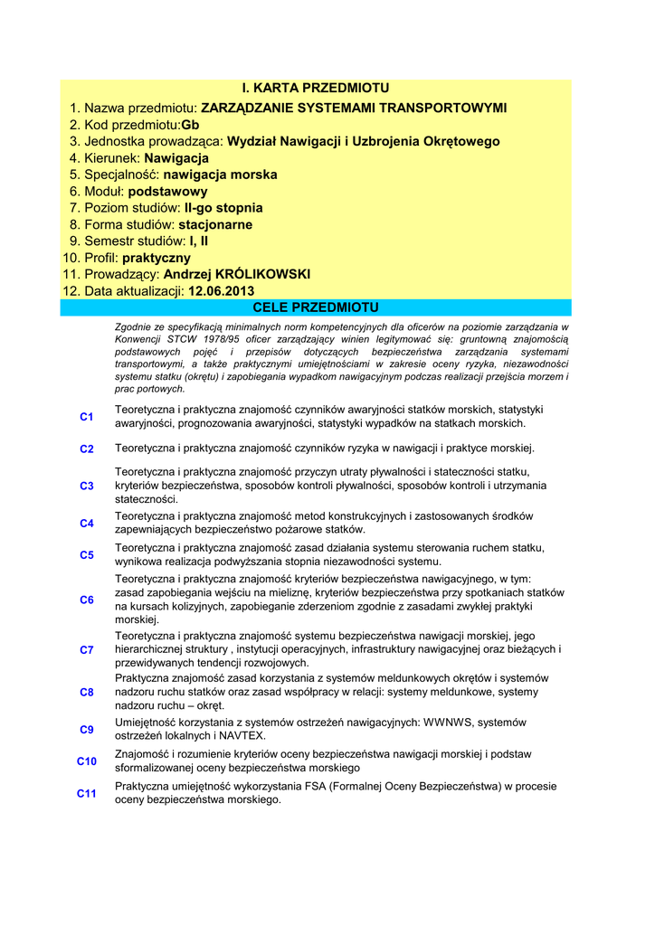 I. KARTA PRZEDMIOTU 1. Nazwa przedmiotu: ZARZĄDZANIE SYSTEMAMI TRANSPORTOWYMI 2. Kod przedmiotu:Gb 3. Jednostka prowadząca: Wydział Nawigacji i Uzbrojenia Okrętowego 4. Kierunek: Nawigacja 5. Specjalność: nawigacja morska 6. Moduł: podstawowy 7. Poziom studiów: II-go stopnia 8. Forma studiów: stacjonarne 9. Semestr studiów: I, II 10. Profil: praktyczny 11. Prowadzący: Andrzej KRÓLIKOWSKI 12. Data aktualizacji: 12.06.2013 CELE PRZEDMIOTU Zgodnie ze specyfikacją minimalnych norm kompetencyjnych dla oficerów na poziomie zarządzania w Konwencji STCW 1978/95 oficer zarządzający winien legitymować się: gruntowną znajomością podstawowych pojęć i przepisów dotyczących bezpieczeństwa zarządzania systemami transportowymi, a także praktycznymi umiejętnościami w zakresie oceny ryzyka, niezawodności systemu statku (okrętu) i zapobiegania wypadkom nawigacyjnym podczas realizacji przejścia morzem i prac portowych. C1 Teoretyczna i praktyczna znajomość czynników awaryjności statków morskich, statystyki awaryjności, prognozowania awaryjności, statystyki wypadków na statkach morskich. C2 Teoretyczna i praktyczna znajomość czynników ryzyka w nawigacji i praktyce morskiej. C3 Teoretyczna i praktyczna znajomość przyczyn utraty pływalności i stateczności statku, kryteriów bezpieczeństwa, sposobów kontroli pływalności, sposobów kontroli i utrzymania stateczności. C4 Teoretyczna i praktyczna znajomość metod konstrukcyjnych i zastosowanych środków zapewniających bezpieczeństwo pożarowe statków. C5 Teoretyczna i praktyczna znajomość zasad działania systemu sterowania ruchem statku, wynikowa realizacja podwyższania stopnia niezawodności systemu. C6 C7 C8 Teoretyczna i praktyczna znajomość kryteriów bezpieczeństwa nawigacyjnego, w tym: zasad zapobiegania wejściu na mieliznę, kryteriów bezpieczeństwa przy spotkaniach statków na kursach kolizyjnych, zapobieganie zderzeniom zgodnie z zasadami zwykłej praktyki morskiej. Teoretyczna i praktyczna znajomość systemu bezpieczeństwa nawigacji morskiej, jego hierarchicznej struktury , instytucji operacyjnych, infrastruktury nawigacyjnej oraz bieżących i przewidywanych tendencji rozwojowych. Praktyczna znajomość zasad korzystania z systemów meldunkowych okrętów i systemów nadzoru ruchu statków oraz zasad współpracy w relacji: systemy meldunkowe, systemy nadzoru ruchu – okręt. C9 Umiejętność korzystania z systemów ostrzeżeń nawigacyjnych: WWNWS, systemów ostrzeżeń lokalnych i NAVTEX. C10 Znajomość i rozumienie kryteriów oceny bezpieczeństwa nawigacji morskiej i podstaw sformalizowanej oceny bezpieczeństwa morskiego C11 Praktyczna umiejętność wykorzystania FSA (Formalnej Oceny Bezpieczeństwa) w procesie oceny bezpieczeństwa morskiego. WYMAGANIA WSTĘPNE W ZAKRESIE WIEDZY, UMIEJĘTNOŚCI I INNYCH KOMPETENCJI 1 Znajomość matematyki i fizyki na poziomie studiów inżynierskich I stopnia. 3 Zaliczenie przedmiotów: zarządzanie systemami transportowymi, bezpieczeństwo nawigacji i ratownictwo morskie w ramach studiów I stopnia. 4 Znajomość nawigacji w zakresie programu przedmiotu Nawigacja I i II EFEKTY KSZTAŁCENIA EK1 EK2 Student posiada teoretyczną i praktyczną znajomość czynników awaryjności statków morskich, umie wykonać obliczenia w zakresie statystyki awaryjności. Potrafi prognozować awaryjność systemu, prawidłowo wyciąga wnioski z danych statystycznych odnośnie wypadków na statkach morskich. Student zna teoretyczne i praktyczne podstawy czynników ryzyka w nawigacji i praktyce morskiej i potrafi je zastosować w działaniu systemu transportowego. EK3 Student zna teoretyczne i praktyczne przyczyny utraty pływalności i stateczności statku, prawidłowo ocenia kryteria bezpieczeństwa, umie zastosować w praktyce sposoby kontroli pływalności, stateczności i ich utrzymania w warunkach zakłóceń pracy systemu transportowego. EK4 Student posiada teoretyczną i praktyczną znajomość metod konstrukcyjnych i zastosowanych środków zapewniających bezpieczeństwo pożarowe statków. EK5 Student zna i rozumie pojęcia dotyczące teorii działania systemu sterowania ruchem statku, umie realizować praktycznie proces podwyższania stopnia niezawodności systemu. EK6 Student posiada szczegółową wiedzę w zakresie teoretycznej znajomości kryteriów bezpieczeństwa nawigacyjnego, w tym: zasad zapobiegania wejściu na mieliznę, kryteriów bezpieczeństwa przy spotkaniach statków na kursach kolizyjnych, zapobieganiu zderzeniom zgodnie z zasadami zwykłej praktyki morskiej i potrafi je zastosować w praktyce. EK7 EK8 EK9 EK10 EK11 Student posiada teoretyczną znajomość systemu bezpieczeństwa nawigacji morskiej, jego hierarchicznej struktury , instytucji operacyjnych, infrastruktury nawigacyjnej oraz bieżących i przewidywanych tendencji rozwojowych. Umie zastosować w praktyce elementy struktury systemu podczas realizacji zadań systemu transportowego. Student posiada praktyczną znajomość zasad korzystania z systemów meldunkowych okrętów i systemów nadzoru ruchu statków oraz zasad współpracy w relacji: systemy meldunkowe, systemy nadzoru ruchu – okręt. Student posiada praktyczną umiejętność korzystania z systemów ostrzeżeń nawigacyjnych: WWNWS, systemów ostrzeżeń lokalnych i NAVTEX. Student zna i rozumie kryteria oceny bezpieczeństwa nawigacji morskiej i podstawy sformalizowanej oceny bezpieczeństwa morskiego oraz umie je zastosować praktycznie podczas zarządzania pracą systemu transportowego. Student posiada praktyczne umiejętności wykorzystania FSA (Formalnej Oceny Bezpieczeństwa) w procesie oceny bezpieczeństwa morskiego w odniesieniu do zarządzania statkiem (okrętem) w ramach systemu transportowego. STRUKTURA PRZEDMIOTU EK1 Forma zajęćwykłady Liczba godzin W1 2 Forma zajęććwiczenia Liczba godzin Forma zajęćlaboratoria Liczba godzin EK2 W2 1 C1 2 EK3 W3 1 C2 2 EK4 W4 1 EK5 W5 1 C3 1 C4 1 C5 2 C6