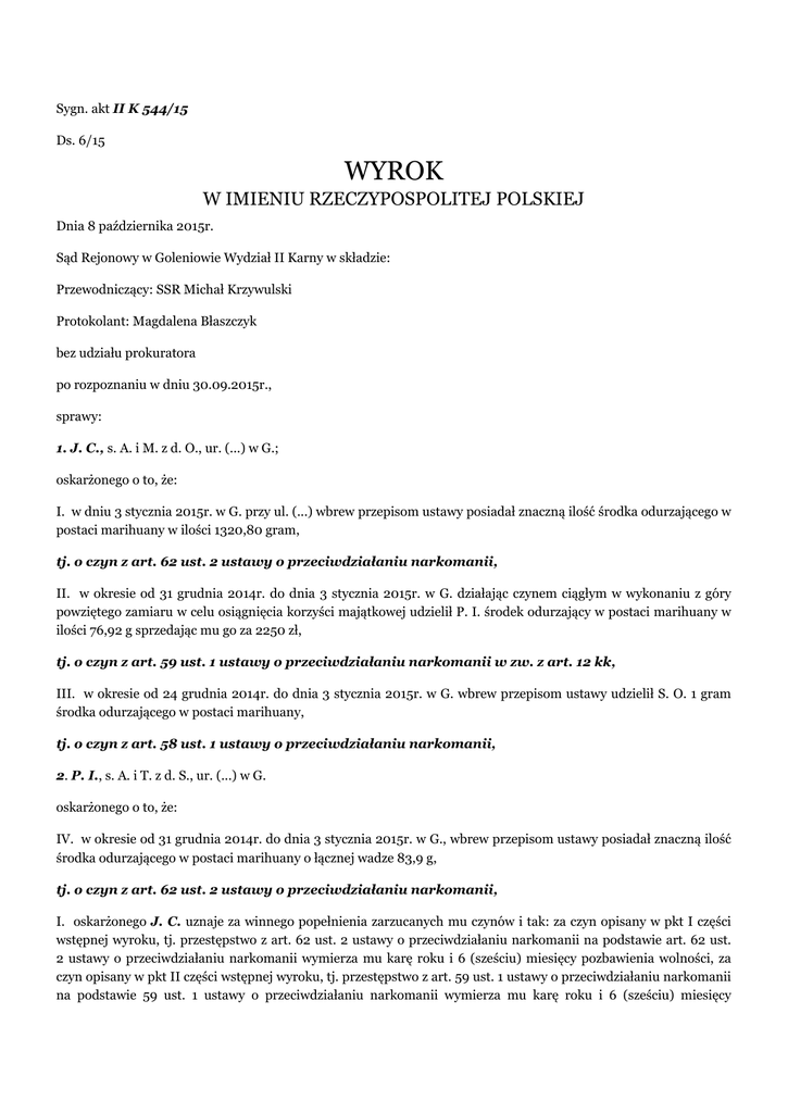 Sygn. akt II K 544/15 Ds. 6/15 WYROK W IMIENIU RZECZYPOSPOLITEJ POLSKIEJ Dnia 8 października 2015r. Sąd Rejonowy w Goleniowie Wydział II Karny w składzie: Przewodniczący: SSR Michał Krzywulski Protokolant: Magdalena Błaszczyk bez udziału prokuratora po rozpoznaniu w dniu 30.09.2015r., sprawy: 1. J. C., s. A. i M. z d. O., ur. (...) w G.; oskarżonego o to, że: I. w dniu 3 stycznia 2015r. w G. przy ul. (...) wbrew przepisom ustawy posiadał znaczną ilość środka odurzającego w postaci marihuany w ilości 1320,80 gram, tj. o czyn z art. 62 ust. 2 ustawy o przeciwdziałaniu narkomanii, II. w okresie od 31 grudnia 2014r. do dnia 3 stycznia 2015r. w G. działając czynem ciągłym w wykonaniu z góry powziętego zamiaru w celu osiągnięcia korzyści majątkowej udzielił P. I. środek odurzający w postaci marihuany w ilości 76,92 g sprzedając mu go za 2250 zł, tj. o czyn z art. 59 ust. 1 ustawy o przeciwdziałaniu narkomanii w zw. z art. 12 kk, III. w okresie od 24 grudnia 2014r. do dnia 3 stycznia 2015r. w G. wbrew przepisom ustawy udzielił S. O. 1 gram środka odurzającego w postaci marihuany, tj. o czyn z art. 58 ust. 1 ustawy o przeciwdziałaniu narkomanii, 2. P. I., s. A. i T. z d. S., ur. (...) w G. oskarżonego o to, że: IV. w okresie od 31 grudnia 2014r. do dnia 3 stycznia 2015r. w G., wbrew przepisom ustawy posiadał znaczną ilość środka odurzającego w postaci marihuany o łącznej wadze 83,9 g, tj. o czyn z art. 62 ust. 2 ustawy o przeciwdziałaniu narkomanii, I. oskarżonego J. C. uznaje za winnego popełnienia zarzucanych mu czynów i tak: za czyn opisany w pkt I części wstępnej wyroku, tj. przestępstwo z art. 62 ust. 2 ustawy o przeciwdziałaniu narkomanii na podstawie art. 62 ust. 2 ustawy o przeciwdziałaniu narkomanii wymierza mu karę roku i 6 (sześciu) miesięcy pozbawienia wolności, za czyn opisany w pkt II części wstępnej wyroku, tj. przestępstwo z art. 59 ust. 1 ustawy o przeciwdziałaniu narkomanii na podstawie 59 ust. 1 ustawy o przeciwdziałaniu narkomanii wymierza mu karę roku i 6 (sześciu) miesięcy pozbawienia wolności, zaś za czyn opisany w pkt III części wstępnej wyroku, tj. przestępstwo z art. 58 ust. 1 ustawy o przeciwdziałaniu narkomanii na podstawie art. 58 ust. 1 ustawy o przeciwdziałaniu narkomanii wymierza mu karę 3 (trzech) miesięcy pozbawienia wolności, II. na podstawie art. 85 kk, art. 86 § 1 kk w brzmieniu obowiązującym w okresie popełnienia czynów w zw. z art. 4 § 1 kk łączy wymierzone oskarżonemu J. C. kary jednostkowe pozbawienia wolności i wymierza mu karę łączną 2 (dwóch) lat pozbawienia wolności, III. na podstawie art. 45 § 1 kk orzeka wobec oskarżonego przepadek korzyści majątkowej uzyskanej z popełnienia przestępstwa opisanego w pkt II części wstępnej wyroku w wysokości 2250 (dwóch tysięcy dwustu pięćdziesięciu) złotych, IV. na podstawie art. 70 ust. 4 ustawy o przeciwdziałaniu narkomanii orzeka wobec oskarżonego nawiązkę w kwocie 500 (pięćset) złotych na rzecz ośrodka Stowarzyszenia (...) Ośrodek (...) w B., V. na podstawie art. 63 § 1 kk w brzmieniu obowiązującym w okresie popełnienia czynów w zw. z art. 4 § 1 kk zalicza oskarżonemu na poczet wymierzonej mu kary łącznej pozbawienia wolności okres jego zatrzymania i tymczasowego aresztowania w sprawie od dnia 3 stycznia 2015r. do dnia 27 marca 2015r., VI. na podstawie art. 70 ust. 1 i 2 ustawy o przeciwdziałaniu narkomanii orzeka wobec oskarżonego przepadek dowodów rzeczowych w postaci elektronicznej wagi koloru srebrnego oraz ziela konopi innych niż włókniste o łącznej masie netto 1318,64 g, łodyg roślin konopi innych niż włókniste o masie netto 22,77 g, VII. oskarżonego P. I. uznaje za winnego popełnienia zarzucanego mu czynu, tj. przestępstwa z art. 62 ust. 2 ustawy o przeciwdziałaniu narkomanii i za to na podstawie art. 62 ust. 2 ustawy o przeciwdziałaniu narkomanii wymierza mu karę roku pozbawienia wolności, VIII. na podstawie art. 69 § 1 i § 2 kk, art. 70 § 1 pkt 1 kk w brzmieniu obowiązującym w okresie popełnienia czynu w zw. z art. 4 § 1 kk wykonanie orzeczonej wobec oskarżonego P. I. kary pozbawienia wolności warunkowo zawiesza na okres próby 3 (trzech) lat, IX. na podstawie art. 71 § 1 kk w brzmieniu obowiązującym w okresie popełnienia czynu w zw. z art. 4 § 1 kk wymierza oskarżonemu P. I. karę grzywny w wysokości 50 (pięćdziesięciu) stawek dziennych ustalając wysokość jednej stawki na kwotę 20 (dwudziestu) złotych, X. na podstawie art. 63 § 1 kk w brzmieniu obowiązującym w okresie popełnienia czynu w zw. z art. 4 § 1 kk zalicza oskarżonemu na poczet wymierzonej mu kary grzywny okres jego zatrzymania w sprawie od dnia 3 stycznia 2015r. do dnia 5 stycznia 2015r., przy przyjęciu, że jeden dzień rzeczywistego pozbawienia wolności jest równoważny dwóm dziennym stawkom grzywny, XI. na podstawie art. 70 ust. 4 ustawy o przeciwdziałaniu narkomanii orzeka wobec oskarżonego nawiązkę w kwocie 500 (pięćset) złotych na rzecz ośrodka Stowarzyszenia (...) Ośrodek (...) w B., XII. na podstawie art. 70 ust. 2 ustawy o przeciwdziałaniu narkomanii orzeka wobec oskarżonego przepadek dowodu rzeczowego w postaci ziela konopi innych niż włókniste o łącznej masie netto 53,53 g, zaś na podstawie art. 44 § 2 kk orzeka przepadek dowodów rzeczowych w postaci wagi elektronicznej koloru srebrnego marki D., młynka koloru złotego o wysokości 3,5 cm i średnicy 5 cm jako przedmiotów służących do popełnienia przestępstwa, XIII. na podstawie art. 627 k.p.k. w zw. z art. 2 ust. 1 pkt 3 i 4 ustawy z dnia 23 czerwca 1973r. o opłatach w sprawach karnych zasądza od oskarżonych na rzecz Skarbu Państwa koszty sądowe w częściach ich dotyczących, w tym wymierza im opłaty: - J. C. w kwocie 300 (trzystu) złotych, - P. I. w kwocie 180 (stu osiemdziesięciu) złotych. Sygn. akt II K 544/15 UZASADNIENIE na zasadzie art. 423 § 1a k.p.k. o