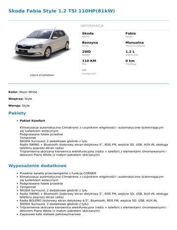 Skoda Fabia Style 1.2 TSI 110HP(81kW) INFORMACJE Skoda Fabia Marka Model Benzyna Manualna Silnik Skrzynia biegów 2WD 1.2 L Napęd pojemność 110 KM 0 km Moc Przebieg --zdjęcie przykładowe Dostępność Kolor: Moon White Wnętrze: Style Wersja: Style Pakiety Pakiet Komfort Klimatyzacja automatyczna Climatronic z czujnikiem wilgotności i automatycznie ściemniającym się lusterkiem wstecznym Podgrzewane fotele przednie Tempomat ŠKODA Surround, 2 dodatkowe głośniki z tyłu Radio SWING + Bluetooth (kolorowy ekran dotykowy 5”, RDS FM, wejście SD, USB, AUX-IN, obsługa telefonu poprzez ekran radia) Trójramienna skórzana kierownica wielofunkcyjna (radio + telefon) z elementami chromowanymi i dekorem Piano White (z małym pakietem skórzanym) Wyposażenie dodatkowe Przednie światła przeciwmgielne z funkcją CORNER Klimatyzacja automatyczna Climatronic z czujnikiem wilgotności i automatycznie ściemniającym się lusterkiem wstecznym Podgrzewane fotele przednie Tempomat ŠKODA Surround, 2 dodatkowe głośniki z tyłu Radio SWING + Bluetooth (kolorowy ekran dotykowy 5”, RDS FM, wejście SD, USB, AUX-IN, obsługa telefonu poprzez ekran radia) Radio BOLERO (kolorowy ekran dotykowy 6,5", Bluetooth, RDS FM, wejście SD, USB, AUX-IN, ŠKODA Surround, 2 dodatkowe głośniki z tyłu) Trójramienna skórzana kierownica wielofunkcyjna (radio + telefon) z elementami chromowanymi i dekorem Piano White (z małym pakietem skórzanym) Zapasowe koło stalowe pełnowymiarowe Wyposażenie standardowe Poduszki powietrzne czołowe i boczne kierowcy oraz pasażera z przodu Kurtyny powietrzne Dezaktywacja czołowej poduszki powietrznej pasażera z przodu ESP z ABS, MSR, ASR, EDL, HBA, TPM XDS+ - rozbudowana elektroniczna blokada mechanizmu różnicowego Multicollision Brake - hamulec antykolizyjny ACS - system pokolizyjny Front Assist - kontrola odstepu z funkcją awaryjnego hamowania Trzypunktowe przednie pasy bezpieczeństwa z regulacją wysokości mocowania oraz z pirotechnicznymi napinaczami Trzy trzypunktowe pasy bezpieczeństwa z tyłu 5 zagłówków regulowanych na wysokość Immobilizer Uchwyt ISOFIX na zewnętrznych miejscach kanapy tylnej Funkcja Start-Stop i odzyskiwania energii Podpowiedź zmiany biegu Światła do jazdy dziennej Day Light Reflektory projektorowe ze światłami do jazdy dziennej LED Przednie światła przeciwmgielne Easy Light Assist - czujnik zmierzchu ( Coming Home, Leaving Home) Wycieraczki przedniej szyby AERO z regulacją częstotliwości pracy Wycieraczka tylnej szyby Skrobaczka do szyb ( w porywie wlewu paliwa ) Elektromechaniczne wspomaganie kierownicy Regulowana w dwóch płaszczyznach kolumna kierownicy Fotel kierowcy z regulacja wysokości Fotel pasażera z regulacją wysokości Podłokietnik przedni ze schowkiem Wyswietlacz Maxi DOT Klimatyzacja Manualna Zdalnie sterowany centralny zamek (2 składane kluczyki) Easy Start - bezkluczykowe uruchamianie i wyłączanie silnika (przycisk start/stop zamiast stacyjki) Elektrycznie sterowane i ogrzewane lusterka zewnętrzne Elektrycznie sterowane szyby przednie Ogranicznik prędkości Czujniki parkowania z tyłu Oświetlenie części pasażerskiej z przodu i z tyłu Osłony przeciwsłoneczne kierowcy i pasażera z lusterkiem Cztery sładane uchwyty w podsufitce Uchwyt na kwity parkingowe Schowek przed pasazerem z przodu - oświetlony, z miejscem na butelkę 1-litrową Schowki w drzwiach przednich Schowek pod fotelem kierowcy Uchwyt z parasolką pod fotelem pasażera Uchwyt na butelkę 1,5-litrową w drzwiach przednich Uchwyt na butelke 0,5-litrową w drzwiach tylnych Schowek na kamizelkę odblaskową Kieszenie w tylnej części oparć foteli przednich 2 siatki na bokach oparć foteli przednich Schowek na okulary Konsola centralna z gniazdkiem 12V Haczyki na zakupy w przestrzeni bagażowej Schowek w bagażniku (nad lewym nadkolem) Przegroda wnęki nadkola – z lewej strony (dotyczy wersji Hatchback) Oświetlenie części bagażowej – 1 lampka Mocowanie pod montaż zestawu siatek Składana pokrywa nad przestrzenią bagażową (dotyczy wersji Hatchback) Siedzisko tylnej kanapy niedzielone, oparcie składane i dzielone (dotyczy wersji Hatchback) Radio SWING (kolorowy ekran dotykowy 5”, RDS FM, wejście SD, USB, AUX-IN) Trójramienna skórzana kierownica wielofunkcyjna (obsługa radia) z elementami chromowanymi i dekorem Piano Black (z małym pakietem skórzanym) Lusterka i klamki zewnętrzne lakierowane w kolorze nadwozia Kierunkowskazy zintegrowane z lusterkami bocznymi Przyciemniane szyby Grill przedni w kolorze czarnym Chromowana ramka grilla Stylistyka wnętrza – Style (czarna lub czarno-beżowa) Panel instrumentów – Ambition/Style (chromowana ramka obrotomierza i prędkościomierza, więcej symboli, komputer pokładowy) Pakiet Chrom (chromowane klamki wewnętrzne, ramki bocznych nawiewów powietrza, przycisk dźwigni hamulca ręcznego oraz elementy kontrolne nawiewów powietrza) Dekor Dark Brushed na desce rozdzielczej (w wersji Style dla tapicerki czarnej) Dekor Piano Black na desce rozdzielczej (dla tapicerki czarno-beżowej) Dywaniki (dwa z przodu i dwa z tyłu) Obręcze kół ze stopów lekkich MATO 6J x 15'' z oponami 185/60 R15 Zestaw naprawczy do kół id: 5650 Powered by TCPDF (www.tcpdf.org)