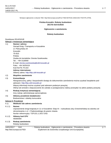 Dz.U./S S10 14/01/2017 14533-2017-PL - - Roboty budowlane - Ogłoszenie o zamówieniu - Procedura otwarta 1/7 Niniejsze ogłoszenie w witrynie TED: http://ted.europa.eu/udl?uri=TED:NOTICE:14533-2017:TEXT:PL:HTML Polska-Koszalin: Roboty budowlane 2017/S 010-014533 Ogłoszenie o zamówieniu Roboty budowlane Dyrektywa 2014/24/UE Sekcja I: Instytucja zamawiająca I.1) Nazwa i adresy Zarząd Dróg i Transportu w Koszalinie ul. Połczyńska 24 Koszalin 75-815 Polska Osoba do kontaktów: Dorota Szarkowska Tel.: +94 3118060 E-mail: [email protected] Faks: +94 3425419 Kod NUTS: PL422 Adresy internetowe: Główny adres: http://bip.zdit-koszalin.pl I.2) Wspólne zamówienie I.3) Komunikacja Nieograniczony, pełny i bezpośredni dostęp do dokumentów zamówienia można uzyskać bezpłatnie pod adresem: http://bip.zdit-koszalin.pl Więcej informacji można uzyskać pod adresem podanym powyżej Oferty lub wnioski o dopuszczenie do udziału w postępowaniu należy przesyłać na adres podany powyżej I.4) Rodzaj instytucji zamawiającej Inny rodzaj: administracja samorządowa I.5) Główny przedmiot działalności Budownictwo i obiekty komunalne Sekcja II: Przedmiot II.1) Wielkość lub zakres zamówienia II.1.1) Nazwa: Usprawnienie drogi krajowej nr 11 w Koszalinie: Etap III – rozbudowa ulicy Gnieźnieńskiej na odcinku od skrzyżowania z ul. I. Paderewskiego do granic miasta. Numer referencyjny: TZP.221.1.2017.DSz II.1.2) Główny kod CPV 45000000 II.1.3) Rodzaj zamówienia Roboty budowlane 14/01/2017 S10 http://ted.europa.eu/TED - - Roboty budowlane - Ogłoszenie o zamówieniu - Procedura otwarta Suplement do Dziennika Urzędowego Unii Europejskiej 1/7 Dz.U./S S10 14/01/2017 14533-2017-PL - - Roboty budowlane - Ogłoszenie o zamówieniu - Procedura otwarta 2/7 II.1.4) Krótki opis: Przedmiotem zamówienia jest – Usprawnienie drogi krajowej nr 11 w Koszalinie: Etap III – rozbudowa ulicy Gnieźnieńskiej na odcinku od skrzyżowania z ul. I. Paderewskiego do granic miasta Znak sprawy: TZP.221.1.2017.DSz. II.1.5) Szacunkowa całkowita wartość II.1.6) Informacje o częściach To zamówienie podzielone jest na części: nie II.2) Opis II.2.1) Nazwa: II.2.2) Dodatkowy kod lub kody CPV 45112730 45232130 45231400 45232300 II.2.3) Miejsce świadczenia usług Kod NUTS: PL422 Główne miejsce lub lokalizacja realizacji: Usprawnienie drogi krajowej nr 11 w Koszalinie: Etap III – rozbudowa ulicy Gnieźnieńskiej na odcinku od skrzyżowania z ul. I. Paderewskiego do granic miasta. II.2.4) Opis zamówienia: Przedmiotem zamówienia jest rozbudowa ulicy Gnieźnieńskiej w Koszalinie na odcinku od ul. I. Paderewskiego do granic miasta stanowiącej odcinek drogi krajowej nr 11. Zakres robót budowlanych na odcinku ok. 1,5km obejmuje: — roboty drogowe – przebudowa ze wzmocnieniem jezdni i chodników, wykonanie na brakującym odcinku ścieżki rowerowej; — przebudowa zatok autobusowych, miejsc postojowych, zjazdów, — renowacja zieleni w pasie drogowym, wycinka i sadzenie drzew; — regulacja wysokościowa armatury w dostosowaniu do nowych rzędnych nawierzchni; — odwodnienie drogi – częściowe wykorzystanie istniejącego odwodnienia drogowego; — budowa odwodnienia wgłębnego i kolektora deszczowego na dalszym odcinku; — przebudowa i uzupełnienie oświetlenia drogi — przebudowa lub zabezpieczenie istniejącego uzbrojenia zlokalizowanego w sąsiedztwie robót drogowych w zakresie koniecznym dla usunięcia kolizji; — budowa sygnalizacji świetlnej na skrzyżowaniu z ul. Diamentową – Manowską; — budowa ekranów dźwiękochłonnych; — budowę kanału technologicznego. Na objętym rozbudową odcinku droga krajowa Nr 11 (ul. Gnieźnieńska) posiada dwie dwupasmowe jezdnie o nawierzchni bitumicznej szerokość jezdni 7 m. Droga krajowa Nr 11 na przebudowywanym odcinku jest ulicą klasy G o przekroju 2x2 (dwie jezdnie po dwa pasy ruchu), oddzielone pasem dzielącym o szerokości od 2,0 m do 36,0m. 1. Wykonawca zobowiązany jest do udostępnienia placu budowy właścicielom urządzeń podziemnych a w szczególności dla MWiK Koszalin pod budowę magistrali wodociągowej wraz z przyłączami oraz dla firmy 14/01/2017 S10 http://ted.europa.eu/TED - - Roboty budowlane - Ogłoszenie o zamówieniu - Procedura otwarta Suplement do Dziennika Urzędowego Unii Europejskiej 2/7 Dz.U./S S10 14/01/2017 14533-2017-PL - - Roboty budowlane - Ogłoszenie o zamówieniu - Procedura otwarta 3/7 ENERGA-OPERATOR S.A. pod przebudowę sieci kablowych na zasadach określonych przez Wykonawcę. Wykonawca robót określonych w tym zamówieniu będzie zobowiązany do uwzględnienia w harmonogramie rzeczowo – finansowym konieczności udostępnienia placu budowy podmiotowi trzeciemu. 2. W miejscach, gdzie w dokumentacji projektowej, specyfikacjach technicznych oraz przedmiarze robót zostało wskazane pochodzenie (marka, znak towarowy, producent, dostawca) materiałów lub normy, w szczególności których mowa w art. 30 ust. 1-4 ustawy Pzp, Zamawiający dopuszcza oferowanie materiałów równoważnych, pod warunkiem, że zagwarantują one prawidłową realizację robót oraz zapewnią uzyskanie parametrów technicznych nie gorszych od założonych w wyżej wymienionych dokumentach. W takiej sytuacji Zamawiający wymaga złożenia stosownych dokumentów uwiarygodniających te materiały i urządzenia. II.2.5) Kryteria udzielenia zamówienia Cena nie jest jedynym kryterium udzielenia zamówienia; wszystkie kryteria są wymienione tylko w dokumentacji zamówienia II.2.6) Szacunkowa wartość II.2.7) Okres obowiązywania zamówienia, umowy ramowej lub dynamicznego systemu zakupów Koniec: 14/12/2017 Niniejsze zamówienie podlega wznowieniu: nie II.2.10) Informacje o ofertach wariantowych Dopuszcza się składanie ofert wariantowych: nie II.2.11) Informacje o opcjach Opcje: nie II.2.12) Informacje na temat katalogów elektronicznych II.2.13) Informacje o funduszach Unii Europejskiej Zamówienie dotyczy projektu/program