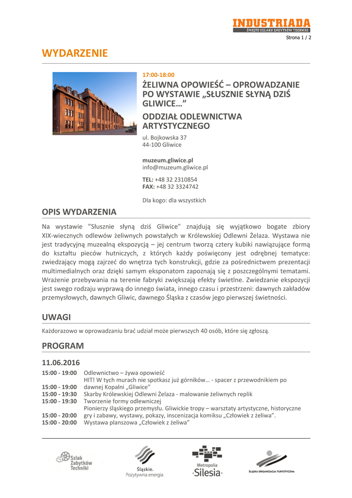 Strona 1 / 2 WYDARZENIE 17:00-18:00 ŻELIWNA OPOWIEŚĆ – OPROWADZANIE PO WYSTAWIE „SŁUSZNIE SŁYNĄ DZIŚ GLIWICE…” ODDZIAŁ ODLEWNICTWA ARTYSTYCZNEGO ul. Bojkowska 37 44-100 Gliwice muzeum.gliwice.pl [email protected] TEL: +48 32 2310854 FAX: +48 32 3324742 Dla kogo: dla wszystkich OPIS WYDARZENIA Na wystawie ”Słusznie słyną dziś Gliwice” znajdują się wyjątkowo bogate zbiory XIX-wiecznych odlewów żeliwnych powstałych w Królewskiej Odlewni Żelaza. Wystawa nie jest tradycyjną muzealną ekspozycją – jej centrum tworzą cztery kubiki nawiązujące formą do kształtu pieców hutniczych, z których każdy poświęcony jest odrębnej tematyce: zwiedzający mogą zajrzeć do wnętrza tych konstrukcji, gdzie za pośrednictwem prezentacji multimedialnych oraz dzięki samym eksponatom zapoznają się z poszczególnymi tematami. Wrażenie przebywania na terenie fabryki zwiększają efekty świetlne. Zwiedzanie ekspozycji jest swego rodzaju wyprawą do innego świata, innego czasu i przestrzeni: dawnych zakładów przemysłowych, dawnych Gliwic, dawnego Śląska z czasów jego pierwszej świetności. UWAGI Każdorazowo w oprowadzaniu brać udział może pierwszych 40 osób, które się zgłoszą. PROGRAM 11.06.2016 15:00 - 19:00 15:00 - 19:00 15:00 - 19:30 15:00 - 19:30 15:00 - 20:00 15:00 - 20:00 Odlewnictwo – żywa opowieść HIT! W tych murach nie spotkasz już górników… - spacer z przewodnikiem po dawnej Kopalni „Gliwice” Skarby Królewskiej Odlewni Żelaza - malowanie żeliwnych replik Tworzenie formy odlewniczej Pionierzy śląskiego przemysłu. Gliwickie tropy – warsztaty artystyczne, historyczne gry i zabawy, wystawy, pokazy, inscenizacja komiksu „Człowiek z żeliwa”. Wystawa planszowa „Człowiek z żeliwa” Strona 2 / 2 15:00 - 20:00 15:30 - 16:30 15:30 - 16:30 15:30 - 16:30 15:30 - 16:30 17:00 - 18:00 17:00 - 18:00 17:00 - 18:00 17:00 - 18:00 18:30 - 19:30 18:30 - 19:30 18:30 - 19:30 18:30 - 19:30 20:00 - 22:00 W tych murach nie spotkasz już górników… - warsztaty i zabawy z węglem dla dzieci Żeliwna opowieść – oprowadzanie po wystawie „Słusznie słyną dziś Gliwice…” Pionierzy śląskiego przemysłu: Reden, Baildon i Holzthausen – warsztaty Zaułek jubilera – warsztaty z wykorzystaniem replik żeliwnej biżuterii Śląscy przemysłowcy i ich baśniowe pałace – zajęcia edukacyjne i gra historyczna Żeliwna opowieść – oprowadzanie po wystawie „Słusznie słyną dziś Gliwice…” Pionierzy śląskiego przemysłu: Reden, Baildon i Holzthausen – warsztaty Zaułek jubilera – warsztaty z wykorzystaniem replik żeliwnej biżuterii Śląscy przemysłowcy i ich baśniowe pałace – zajęcia edukacyjne i gra historyczna Żeliwna opowieść – oprowadzanie po wystawie „Słusznie słyną dziś Gliwice…” Pionierzy śląskiego przemysłu: Reden, Baildon i Holzthausen – warsztaty Zaułek jubilera – warsztaty z wykorzystaniem replik żeliwnej biżuterii Śląscy przemysłowcy i ich baśniowe pałace – zajęcia edukacyjne i gra historyczna Krzysztof Kobyliński i przyjaciele - koncert