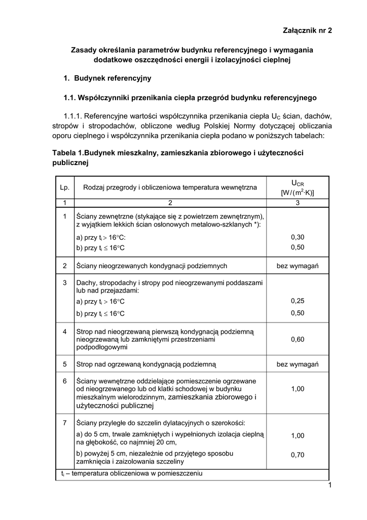 Załącznik nr 2 Zasady określania parametrów budynku referencyjnego i wymagania dodatkowe oszczędności energii i izolacyjności cieplnej 1. Budynek referencyjny 1.1. Współczynniki przenikania ciepła przegród budynku referencyjnego 1.1.1. Referencyjne wartości współczynnika przenikania ciepła UC ścian, dachów, stropów i stropodachów, obliczone według Polskiej Normy dotyczącej obliczania oporu cieplnego i współczynnika przenikania ciepła podano w poniższych tabelach: Tabela 1.Budynek mieszkalny, zamieszkania zbiorowego i użyteczności publicznej Lp. Rodzaj przegrody i obliczeniowa temperatura wewnętrzna 1 2 1 Ściany zewnętrzne (stykające się z powietrzem zewnętrznym), z wyjątkiem lekkich ścian osłonowych metalowo-szklanych *): a) przy ti > 16°C: b) przy ti ≤ 16°C 2 Ściany nieogrzewanych kondygnacji podziemnych 3 Dachy, stropodachy i stropy pod nieogrzewanymi poddaszami lub nad przejazdami: 4 UCR [W /(m2∙K)] 3 0,30 0,50 bez wymagań a) przy ti > 16°C 0,25 b) przy ti ≤ 16°C 0,50 Strop nad nieogrzewaną pierwszą kondygnacją podziemną nieogrzewaną lub zamkniętymi przestrzeniami podpodłogowymi 0,60 5 Strop nad ogrzewaną kondygnacją podziemną 6 Ściany wewnętrzne oddzielające pomieszczenie ogrzewane od nieogrzewanego lub od klatki schodowej w budynku mieszkalnym wielorodzinnym, zamieszkania zbiorowego i bez wymagań 1,00 użyteczności publicznej 7 Ściany przyległe do szczelin dylatacyjnych o szerokości: a) do 5 cm, trwale zamkniętych i wypełnionych izolacja cieplną na głębokość, co najmniej 20 cm, 1,00 b) powyżej 5 cm, niezależnie od przyjętego sposobu zamknięcia i zaizolowania szczeliny 0,70 ti – temperatura obliczeniowa w pomieszczeniu 1 Tabela 2. Budynek produkcyjny, magazynowy i gospodarczy Lp. Rodzaj przegrody i obliczeniowa temperatura wewnętrzna 1 2 1 Ściany zewnętrzne (stykające się z powietrzem zewnętrznym), z wyjątkiem lekkich ścian osłonowych metalowo-szklanych *): 3 0,30 b) przy 8°C < ti ≤ 16°C 0,65 c) przy ti ≤ 8°C 0,90 Ściany nieogrzewanych kondygnacji podziemnych 3 Dachy, stropodachy i stropy pod nieogrzewanymi poddaszami lub nad przejazdami: 5 [W /(m2∙K)] a) przy ti > 16°C: 2 4 UCR bez wymagań a) przy ti > 16°C 0,25 b) przy 8°C < ti ≤ 16°C 0,50 c) przy ti ≤ 8°C 0,70 Strop nad nieogrzewaną pierwszą kondygnacją podziemną nieogrzewaną lub zamkniętymi przestrzeniami podpodłogowymi 0,60 Ściany wewnętrzne i stropy międzykondygnacyjne: a) przy ti > 16°C 1,00 b) przy 8°C < ti ≤ 16°C 1,40 c) przy ti ≤ 8°C bez wymagań ti – temperatura obliczeniowa w pomieszczeniu lub określana indywidualnie w projekcie technologicznym 1.1.2. Referencyjne wartości współczynnika przenikania ciepła UW okien, świetlików, UD drzwi balkonowych, drzwi zewnętrznych, wrót oraz drzwi wejściowych do mieszkań w budynkach mieszkalnych wielorodzinnych, obliczone według Polskiej Normy dotyczącej właściwości użytkowych okien i drzwi, podano w poniższych tabelach: 2 Tabela 3. Budynek mieszkalny, zamieszkania zbiorowego i użyteczności publicznej Lp. Okna, drzwi balkonowe, świetliki, drzwi zewnętrzne, wrota i drzwi wejściowe do mieszkań w budynkach wielorodzinnych UWR, UDR [W /(m2· K)] 1 2 3 1 Okna, drzwi balkonowe, świetliki i przegrody przezroczyste nieotwierane w przegrodach zewnętrznych (stykających się z powietrzem zewnętrznym): 2 3 a) przy ti ≥ 16°C b) przy ti < 16°C Okna w ścianach oddzielających ogrzewane od nieogrzewanych 1,80 2,60 pomieszczenia 2,60 Drzwi zewnętrzne, drzwi wejściowe do mieszkań w budynkach wielorodzinnych oraz wrota do ogrzewanych garaży 2,60 ti - temperatura obliczeniowa w pomieszczeniu Tabela 4. Budynek produkcyjny, magazynowy i gospodarczy Lp. Okna, świetliki, drzwi i wrota UW R, UDR [W /(m2· K)] 1 2 3 1 2. 2. Okna i świetliki w przegrodach zewnętrznych: a) przy ti ≥ 16°C b) przy 8°C ≤ ti < 16°C c) przy ti < 8°C Okna w ścianach oddzielających ogrzewane od nieogrzewanych 1,80 2,60 bez wymagań pomieszczenia 2,6 Drzwi i wrota w przegrodach zewnętrznych: a) przy ti ≥ 8°C b) przy ti < 8°C 2,60 bez wymagań ti - temperatura obliczeniowa w pomieszczeniu lub określana indywidualnie w projekcie technologicznym 3 1.2. Cechy energetyczne instalacji w budynku referencyjnym 1.2.1. Referencyjne wartości sprawności regulacji i wykorzystania ciepła ηH,e w instalacji ogrzewczej podano w poniższej tabeli: Lp. 1 2 3 Rodzaj grzejnika lub instalacji ηH,e R Elektryczne grzejniki bezpośrednie oraz centralne ogrzewanie wodne z grzejnikami członowymi, płytowymi lub podłogowymi w przypadku regulacji centralnej adaptacyjnej i miejscowej Elektryczne grzejniki akumulacyjne, w tym podłogowe Centralne ogrzewanie z grzejnikami członowymi, płytowymi lub podłogowymi w przypadku regulacji centralnej i miejscowej 0,98 1.2.2. Referencyjne wartości sprawności przesyłu ciepła ηH,d ogrzewczej podano w poniższej tabeli: Lp. 1 2 3 R 0,90 0,95 R w instalacji Rodzaj instalacji ogrzewczej ηH,d R Źródło ciepła w pomieszczeniu (ogrzewanie elektryczne, kominek) lub ogrzewanie mieszkaniowe (kocioł gazowy lub niniwęzeł) Ogrzewanie centralne wodne z lokalnego źródła ciepła usytuowanego w ogrzewanym budynku, z zaizolowanymi przewodami, armaturą i urządzeniami, które są zainstalowane w pomieszczeniach ogrzewanych oraz ogrzewanie powietrzne Ogrzewanie centralne wodne z lokalnego źródła ciepła usytuowanego w ogrzewanym budynku, z zaizolowanymi przewodami, armaturą i urządzeniami, które są zainstalowane w pomieszczeniach nieogrzewanych 1,0 0,95 0,92 1.2.3. Referencyjne wartości sprawności akumulacji ciepła w instalacji ogrzewczej ηH,s R podano w poniższej tabeli: Lp. 1 2 3. Usytuowanie zasobnika buforowego Bufor w systemie grzewczym wewnątrz osłony termicznej budynku Bufor w systemie grzewczym na zewnątrz osłony termicznej budynku Brak zasobnika buforowego ηH,s R 0,95 0,92 1,00 4 1.2.4. Referencyjne wartości sprawno