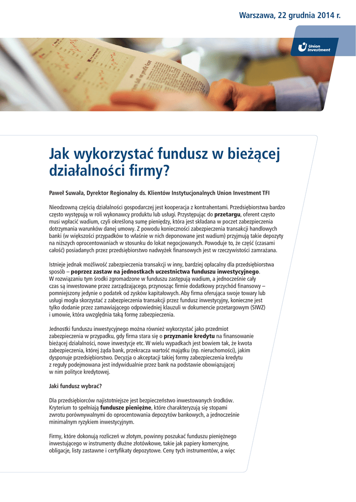 Warszawa, 22 grudnia 2014 r. Jak wykorzystać fundusz w bieżącej działalności firmy? Paweł Suwała, Dyrektor Regionalny ds. Klientów Instytucjonalnych Union Investment TFI Nieodzowną częścią działalności gospodarczej jest kooperacja z kontrahentami. Przedsiębiorstwa bardzo często występują w roli wykonawcy produktu lub usługi. Przystępując do przetargu, oferent często musi wpłacić wadium, czyli określoną sumę pieniędzy, która jest składana w poczet zabezpieczenia dotrzymania warunków danej umowy. Z powodu konieczności zabezpieczenia transakcji handlowych banki (w większości przypadków to właśnie w nich deponowane jest wadium) przyjmują takie depozyty na niższych oprocentowaniach w stosunku do lokat negocjowanych. Powoduje to, że część (czasami całość) posiadanych przez przedsiębiorstwo nadwyżek finansowych jest w rzeczywistości zamrażana. Istnieje jednak możliwość zabezpieczenia transakcji w inny, bardziej opłacalny dla przedsiębiorstwa sposób – poprzez zastaw na jednostkach uczestnictwa funduszu inwestycyjnego. W rozwiązaniu tym środki zgromadzone w funduszu zastępują wadium, a jednocześnie cały czas są inwestowane przez zarządzającego, przynosząc firmie dodatkowy przychód finansowy – pomniejszony jedynie o podatek od zysków kapitałowych. Aby firma oferująca swoje towary lub usługi mogła skorzystać z zabezpieczenia transakcji przez fundusz inwestycyjny, konieczne jest tylko dodanie przez zamawiającego odpowiedniej klauzuli w dokumencie przetargowym (SIWZ) i umowie, która uwzględnia taką formę zabezpieczenia. Jednostki funduszu inwestycyjnego można również wykorzystać jako przedmiot zabezpieczenia w przypadku, gdy firma stara się o przyznanie kredytu na finansowanie bieżącej działalności, nowe inwestycje etc. W wielu wypadkach jest bowiem tak, że kwota zabezpieczenia, której żąda bank, przekracza wartość majątku (np. nieruchomości), jakim dysponuje przedsiębiorstwo. Decyzja o akceptacji takiej formy zabezpieczenia kredytu z reguły podejmowana jest indywidualnie przez bank na podstawie obowiązującej w nim polityce kredytowej. Jaki fundusz wybrać? Dla przedsiębiorców najistotniejsze jest bezpieczeństwo inwestowanych środków. Kryterium to spełniają fundusze pieniężne, które charakteryzują się stopami zwrotu porównywalnymi do oprocentowania depozytów bankowych, a jednocześnie minimalnym ryzykiem inwestycyjnym. Firmy, które dokonują rozliczeń w złotym, powinny poszukać funduszu pieniężnego inwestującego w instrumenty dłużne złotówkowe, takie jak papiery komercyjne, obligacje, listy zastawne i certyfikaty depozytowe. Ceny tych instrumentów, a więc Warszawa, Warszawa,19 22 grudnia grudnia 2014 2014 r.r. i stopa zwrotu z subfunduszu, nie zależą bezpośrednio od sytuacji na giełdzie ani od kursów walut. Warto się takżeinwestycyjne upewnić, że wybrany produkt jest TFI na bieżąco optymalizowany pod kątem rentowności, płynności i ryzyka Cele Union Investment na 2015 r. kredytowego. Przy odpowiedniej realizacji strategii inwestycyjnej i trafnym doborze papierów do portfela (co zależy od konkretnego TFI) fundusz taki może być w bardzo niewielkim stopniu narażony na wahania stóp Fundusze Cele inwestycyjne dla klas aktywów procentowych, przynosząc stabilne i atrakcyjne wyniki inwestycyjne. Ponadto niektóre fundusze pieniężne (np. UniWIBID Plus) są skonstruowane tak, aby wartość wpłaconych Pieniężne ok. 2,5–3% pieniędzy rosła z dnia na dzień, co jest kluczową kwestią z punktu widzenia zarządzania płynnością finansową przedsiębiorstwa. Obligacyjne ok. 2–4% Wśród produktów pieniężne denominowane w różnych Stabilnego wzrostuoferowanych przez TFI znajdują się fundusze ok. 3,1–5,8% walutach – oprócz złotych także w dolarach amerykańskich czy euro. Są one szczególnie polecane Zrównoważone 5–7%eksportują swoje produkty, firmom, które posiadają nadwyżki finansowe w walutachok. obcych, dokonują rozliczeń ze swoim zagranicznym akcjonariuszem – a w określonych przypadkach także Akcji polskich – uniwersalne ok. 8–10% tym przedsiębiorstwom, które otrzymują dotacje, np. z Unii Europejskiej, na rozwój działalności. Akcji polskich – małych i średnich ok. 6–16% spółek Podsumowując, przed ulokowaniem nadwyżek finansowych przedsiębiorstwa w konkretnym funduszu warto sprawdzić parametry, takie jak: polityka inwestycyjna, stopa zwrotu, powtarzalność wyników Akcji tureckich ok. 15–20% w różnych horyzontach czasowych, opłaty oraz stabilność zespołu zarządzających – jeśli funduszem od lat niezmiennie zarządza ta sama osoba, zwiększa to ok. prawdopodobieństwo, że historycznie Ilościowe 8–15% dobre wyniki będą osiągane także w przyszłości. Prognozy liczbowe przedstawione w dokumencie opracowane na podstawie obliczeń własnych Union Investment TFI na dzień 15 grudnia 2014 r. Niniejszy materiał jest upowszechniany w celu reklamy lub promocji usług świadczonych przez Union Investment Towarzystwo Funduszy Inwestycyjnych S.A. Union Investment Towarzystwo Funduszy Inwestycyjnych S.A. od 19 lat oferuje najwyższej jakości rozwiązania finansowe inwestorom indywidualnym (w zakresie funduszy inwestycyjnych, portfeli asset management, a także produktów systematycznego oszczędzania) oraz instytucjom (w zakresie zarządzania płynnością firmy, asset management, tworzenia dedykowanych produktów). Towarzystwo wielokrotnie nagradzane było za osiągane wyniki zarządzania, w tym – jako jedyne – 12-krotnie stawało na podium najstarszego rankingu funduszy inwestycyjnych w Polsce, przygotowywanego przez „Rzeczpospolitą”. Więcej informacji na stronie www.union-investment.pl. Union Investment Towarzystwo Funduszy Inwestycyjnych S.A. działa na podstawie decyzji Komisji Papierów Wartościowych i Giełd (obecnie Komisja Nadzoru Finansowego) z dnia 1 czerwca 1995 r., nr de
