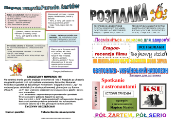 Маленький хлопчик, сидячи перед телевізором, питає у батька: – Тату, а чому цей серіал не можна дивитися дітям? – Сиди тихо, зараз сам побачиш. Jeden przedszkolak mówi do drugiego: - U mnie w domu modlimy się przed kaŜdym posiłkiem. - U mnie nie - odpowiada drugi. - Nieee?! - dziwi się pierwszy. - Nie! Mama dobrze gotuje. - Дівчино, навіщо ви носите панчохи у велику сітку? - Тому, щоб дрібна риба не ловилася. MIESIĘCZNIK SZASZKEWICZÓWKI GAZETKA ZESPOŁU SZKÓŁ OGÓLNOKSZTAŁCĄCYCH NR 2 W PRZEMYŚLU Nr 6(26), 27 maja 2010 r., cena 1 zł. МІСЯЧНИК ШАШКЕВИЧІВКИ ГАЗЕТКА КОМПЛЕКСУ ЗАГАЛЬНООСВІТНІХ ШКІЛ № 2 В ПЕРЕМИШЛІ № 6(26), 27 травня 2010 р., ціна 1 зл. - Krysiu - pyta nauczycielka matematyki - jak podzieliłabyś cztery ziemniaki między pięciu harcerzy? - Zrobiłbym sałatkę ziemniaczaną Wycieczka szkolna w muzeum. Zainteresowanie Jasia wzbudza tabliczka umieszczona obok mumii. - Tutaj jest napisane 2466 PNE. Co to moŜe znaczyć - pyta kolegę. - To chyba rejestracja wozu, który potrącił tego nieboszczyka. Хірург витяг із горла пацієнта рибячу кісточку. - Скільки ? – запитав пацієнт про гонорар. - Десять доларів. - Десять доларів ? Та ви збожеволіли! Я за всю порцію риби заплатив тільки три долари! ВСЕ НАВПАКИ Eragonrecenzja filmu Bajkowy dzień dzie Патриція Багінська Загадки для дотепних Na ostatniej stronie gazetki znajduje się numer od 1 do 5. Nazajutrz po ukazaniu się gazetki spośród tych cyfr zostanie wylosowany Szczęśliwy Numerek. Posiadacze gazetek ze Szczęśliwym Numerkiem mogą skorzystać z ,,np.” na wybranej przez siebie lekcji w szkole podstawowej, gimnazjum czy liceum. UWAGA: „Sz N” traci waŜność z ukazaniem się nowego numeru gazetki i powtórnym losowaniem. „Sz N” nie zwalnia z zapowiedzianych sprawdzianów i powtórek! Wywieszany jest w gablocie Rozpałki na parterze. śeby skorzystać z ,,Sz N”, trzeba przedstawić swój egzemplarz Rozpałki, Nauczyciel powinien podpisem potwierdzić fakt wykorzystania. Losowanie odbywa się w II kl. gimnazjum na duŜej przerwie. śYCZYMY SZCZĘŚCIA!!! Numer gazetki: Potwierdzenie nauczyciela: ………………………………… У НОМЕРІ: SZCZĘŚLIWY NUMEREK !!!!!! Spotkanie z astronautami ІСТОРІЯ ТРИЗУБА зустріч з письменницею Марією Матіос Слово від Редакції РОЗПАЛКИ ВСЕ НАВПАКИ Черговий тиждень минає, а "Слово від Редакції" не почате; навіть задум мені не пруйшов до голови. Менше переймався б тим, якшо не мав би часу, бо школа, бо наука, а тут ані це, ані те. Осінь у травні! Погода змусила до "гібернації", тому час взятися до роботи. Ха! Але це не таке просте. Треба мати ідею, отже роблю все, щоб її притягнути. Вирішив я побудити знайомі мені почуття. Ладан, що мішається з солодощами жіночої парфуми (не питайте звідки). По підлозі б’ють баси „Tiesto”. В руках мобілка, на яку споглядаю спостерігаючи за спринтом часу, якого неможливо притримати. За вікном пейзаж "Постапокаліптичного світу", тому що це не хмари, а попіл засипає землю. І подумати, що кілька тисяч метрів над землею тепленьке сонечко пригріває... попіл. Все навпаки. Не буду пригадувати про матури, бо як подумаю, що я взагалі не приготовляюсь... Матуристам бажаю успіхів:) Пробуючи продовжувати моє висловлювання, сиджу на дворі замку в Красічині, дощ охолоджує мої вуха. "Ви є майбутнім" - це гасло проекту, на якому мали ми привілей бути. Щодо самого викладу, то мушу признати, що це була дуже цікава річ. Гості – люди, які осягнули професійний успіх, переказали нам, тобто „молодьожі”, що в нас майбутнє та надія. А через науку, тяжку працю, та завзятість вcі дороги перед нами відкриті. Маю надію, що ця стара правда, винятково переказана астронавтами, а не батьками, хоча в найменшім ступені здолає хворобу століття, якою деякі з нас заразилися - лінь. Від імені редакції Артур Бостан DuŜe bzdury z małych zeszytów 1.Układ oddechowy przechodząc przez nos i gardło, wpada do Ŝołądka. 2.Węgiel występuje na całej kuli ziemskiej, na przykład w naszej komórce. 3.Goethe, jak jego nazwisko wskazuje był w getcie. 4.Gdyby nie było wody, ludzie nie nauczyliby się pływać i wszyscy by utonęli. 5.Wśród skał rozróŜniamy: granity i baltazary. 6.Po ukończeniu ślubów Zbyszko ucałował Danuśkę od stóp do głów. 7.W czasie totalnej mobi