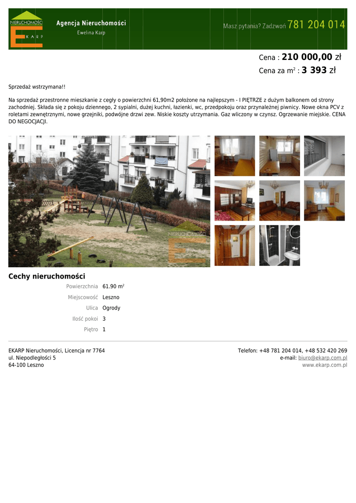 Cena : 210 000,00 zł Cena za m2 : 3 393 zł Sprzedaż wstrzymana!! Na sprzedaż przestronne mieszkanie z cegły o powierzchni 61,90m2 położone na najlepszym - I PIĘTRZE z dużym balkonem od strony zachodniej. Składa się z pokoju dziennego, 2 sypialni, dużej kuchni, łazienki, wc, przedpokoju oraz przynależnej piwnicy. Nowe okna PCV z roletami zewnętrznymi, nowe grzejniki, podwójne drzwi zew. Niskie koszty utrzymania. Gaz wliczony w czynsz. Ogrzewanie miejskie. CENA DO NEGOCJACJI. Cechy nieruchomości Powierzchnia 61.90 m2 Miejscowość Leszno Ulica Ogrody Ilość pokoi 3 Piętro 1 EKARP Nieruchomości, Licencja nr 7764 ul. Niepodległości 5 64-100 Leszno Telefon: +48 781 204 014, +48 532 420 269 e-mail: [email protected] www.ekarp.com.pl