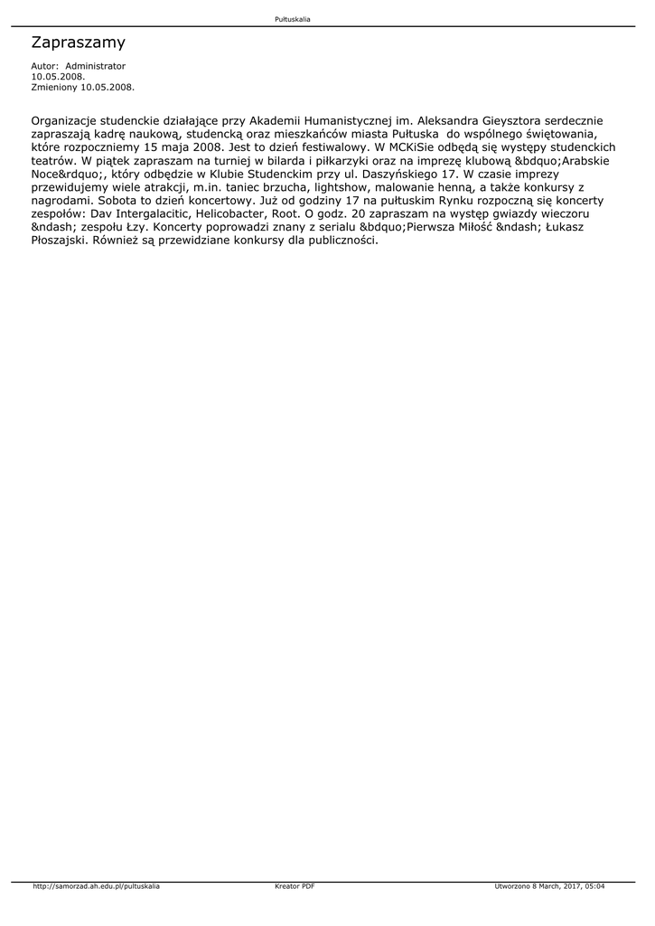 Pułtuskalia Zapraszamy Autor: Administrator 10.05.2008. Zmieniony 10.05.2008. Organizacje studenckie działające przy Akademii Humanistycznej im. Aleksandra Gieysztora serdecznie zapraszają kadrę naukową, studencką oraz mieszkańców miasta Pułtuska do wspólnego świętowania, które rozpoczniemy 15 maja 2008. Jest to dzień festiwalowy. W MCKiSie odbędą się występy studenckich teatrów. W piątek zapraszam na turniej w bilarda i piłkarzyki oraz na imprezę klubową „Arabskie Noce”, który odbędzie w Klubie Studenckim przy ul. Daszyńskiego 17. W czasie imprezy przewidujemy wiele atrakcji, m.in. taniec brzucha, lightshow, malowanie henną, a także konkursy z nagrodami. Sobota to dzień koncertowy. Już od godziny 17 na pułtuskim Rynku rozpoczną się koncerty zespołów: Dav Intergalacitic, Helicobacter, Root. O godz. 20 zapraszam na występ gwiazdy wieczoru – zespołu Łzy. Koncerty poprowadzi znany z serialu „Pierwsza Miłość – Łukasz Płoszajski. Również są przewidziane konkursy dla publiczności. http://samorzad.ah.edu.pl/pultuskalia Kreator PDF Utworzono 8 March, 2017, 05:04