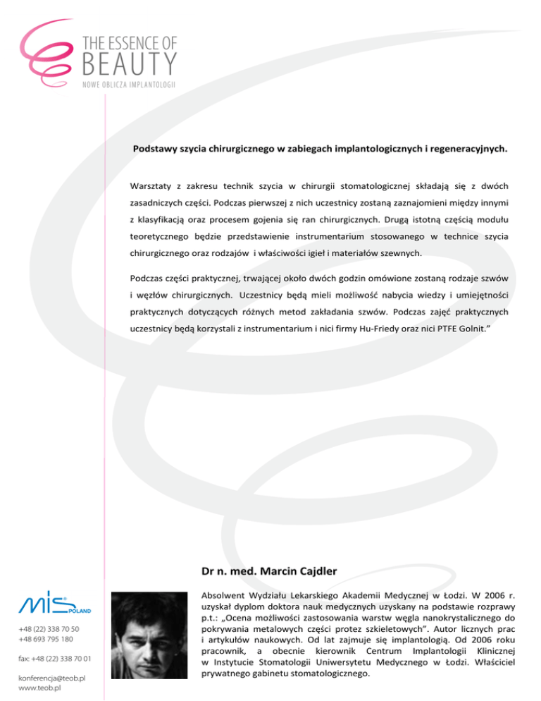 Podstawy szycia chirurgicznego w zabiegach implantologicznych i regeneracyjnych. Warsztaty z zakresu technik szycia w chirurgii stomatologicznej składają się z dwóch zasadniczych części. Podczas pierwszej z nich uczestnicy zostaną zaznajomieni między innymi z klasyfikacją oraz procesem gojenia się ran chirurgicznych. Drugą istotną częścią modułu teoretycznego będzie przedstawienie instrumentarium stosowanego w technice szycia chirurgicznego oraz rodzajów i właściwości igieł i materiałów szewnych. Podczas części praktycznej, trwającej około dwóch godzin omówione zostaną rodzaje szwów i węzłów chirurgicznych. Uczestnicy będą mieli możliwość nabycia wiedzy i umiejętności praktycznych dotyczących różnych metod zakładania szwów. Podczas zajęć praktycznych uczestnicy będą korzystali z instrumentarium i nici firmy Hu-Friedy oraz nici PTFE Golnit.” Dr n. med. Marcin Cajdler +48 (22) 338 70 50 +48 693 795 180 fax: +48 (22) 338 70 01 [email protected] www.teob.pl Absolwent Wydziału Lekarskiego Akademii Medycznej w Łodzi. W 2006 r. uzyskał dyplom doktora nauk medycznych uzyskany na podstawie rozprawy p.t.: „Ocena możliwości zastosowania warstw węgla nanokrystalicznego do pokrywania metalowych części protez szkieletowych”. Autor licznych prac i artykułów naukowych. Od lat zajmuje się implantologią. Od 2006 roku pracownik, a obecnie kierownik Centrum Implantologii Klinicznej w Instytucie Stomatologii Uniwersytetu Medycznego w Łodzi. Właściciel prywatnego gabinetu stomatologicznego.