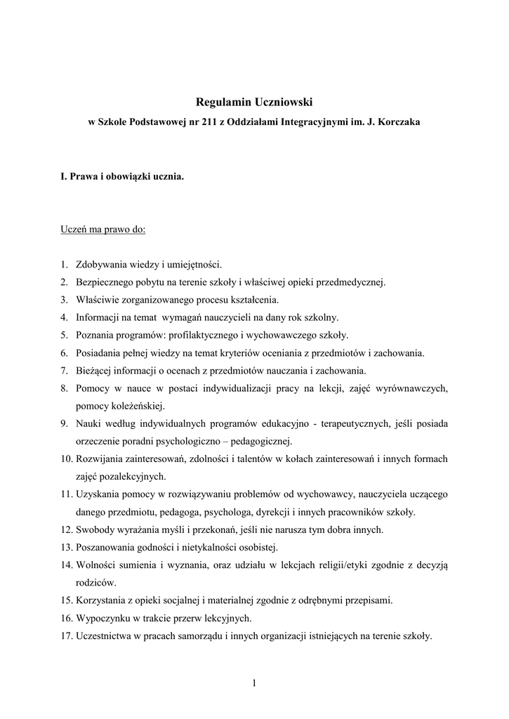 Regulamin Uczniowski w Szkole Podstawowej nr 211 z Oddziałami Integracyjnymi im. J. Korczaka I. Prawa i obowiązki ucznia. Uczeń ma prawo do: 1. Zdobywania wiedzy i umiejętności. 2. Bezpiecznego pobytu na terenie szkoły i właściwej opieki przedmedycznej. 3. Właściwie zorganizowanego procesu kształcenia. 4. Informacji na temat wymagań nauczycieli na dany rok szkolny. 5. Poznania programów: profilaktycznego i wychowawczego szkoły. 6. Posiadania pełnej wiedzy na temat kryteriów oceniania z przedmiotów i zachowania. 7. Bieżącej informacji o ocenach z przedmiotów nauczania i zachowania. 8. Pomocy w nauce w postaci indywidualizacji pracy na lekcji, zajęć wyrównawczych, pomocy koleżeńskiej. 9. Nauki według indywidualnych programów edukacyjno - terapeutycznych, jeśli posiada orzeczenie poradni psychologiczno – pedagogicznej. 10. Rozwijania zainteresowań, zdolności i talentów w kołach zainteresowań i innych formach zajęć pozalekcyjnych. 11. Uzyskania pomocy w rozwiązywaniu problemów od wychowawcy, nauczyciela uczącego danego przedmiotu, pedagoga, psychologa, dyrekcji i innych pracowników szkoły. 12. Swobody wyrażania myśli i przekonań, jeśli nie narusza tym dobra innych. 13. Poszanowania godności i nietykalności osobistej. 14. Wolności sumienia i wyznania, oraz udziału w lekcjach religii/etyki zgodnie z decyzją rodziców. 15. Korzystania z opieki socjalnej i materialnej zgodnie z odrębnymi przepisami. 16. Wypoczynku w trakcie przerw lekcyjnych. 17. Uczestnictwa w pracach samorządu i innych organizacji istniejących na terenie szkoły. 1 18. Reprezentowania klasy i szkoły w konkursach, zawodach, i innych formach współzawodnictwa. 19. Korzystania z pomieszczeń szkoły, sprzętu, środków dydaktycznych, księgozbioru biblioteki, zasobów multimedialnych, stołówki i świetlicy. 20. Zgłaszania swoich postulatów i wniosków różnym organom szkoły. Uczeń ma obowiązek: 1. Systematycznie i aktywnie uczestniczyć w zajęciach lekcyjnych i innych formach życia szkoły. 2. Posiadać na lekcjach dzienniczek ucznia jako dokument umożliwiający kontakt nauczyciela z rodzicami. 3. Odpowiedzialnie i rzetelnie wykonywać powierzone zadania. 4. Punktualnie przychodzić na wszystkie zajęcia szkolne. 5. Przygotowywać się do zajęć, wykonywać prace domowe zadane przez nauczyciela. 6. Podporządkować się poleceniom i rozporządzeniom Dyrektora, nauczycieli i innych pracowników szkoły oraz postanowieniom zawartym w regulaminach szkolnych. 7. Przestrzegać zasad kultury współżycia. 8. Szanować symbole narodowe, religijne i szkolne. 9. Szanować przekonania, poglądy i godność osobistą drugiego człowieka. 10. Dbać o zdrowie i bezpieczeństwo własne i innych. 11. Dbać o ład, porządek, estetykę w pomieszczeniach i otoczeniu szkoły. 12. Szanować mienie szkolne, własne i innych osób. 13. Dbać o piękno mowy ojczystej. 14. Godnie reprezentować szkołę i dbać o jej dobre imię. 15. Codziennie nosić strój szkolny, którego kolorystyka obejmuje kolory: biały, czarny, granatowy, niebieski, szary oraz pastelowe kolory bez błyszczących aplikacji. 16. Uczestniczyć w uroczystościach szkolnych w stroju galowym. Przez strój galowy należy rozumieć: - dla dziewcząt: biała bluzka, granatowa lub czarna spódnica (nie krótsza niż do kolan), - dla chłopców: biała koszula, granatowe lub czarne spodnie. 17. Zmieniać obuwie w szatni szkolnej. 2 18. Dbać o schludny i estetyczny wygląd i higienę osobistą. 19. Wyłączyć telefon komórkowy w czasie zajęć lekcyjnych i przerw. Wyłączony telefon powinien znajdować się w plecaku/tornistrze. W szczególnie uzasadnionych przypadkach uczeń może skorzystać z telefonu za zgodą nauczyciela. 20. Przedstawić wychowawcy klasy pisemne usprawiedliwienie nieobecności od rodziców (do pięciu dni nieobecności) na najbliższej godzinie wychowawczej. 21. Dostarczyć wychowawcy zwolnienie lekarskie (nieobecności powyżej pięciu dni) w ciągu siedmiu dni od powrotu do szkoły. 22. Uzyskać zgodę od Dyrektora szkoły na usprawiedliwienie nieobecności trwającej powyżej pięciu dni z powodów innych niż zwolnienie lekarskie (np. wyjazd za granicę). III. Nagrody i kary. Uczeń może być wyróżniony i nagrodzony za: 1. Rzetelną naukę potwierdzoną wynikami, wzorową frekwencję, aktywność i postawę. 2. Osiągnięcia w pracy pozalekcyjnej potwierdzone dobrymi lokatami w konkursach, przeglądach, turniejach (szkolnych i międzyszkolnych). 3. Znaczące osiągnięcia sportowe (szkolne i międzyszkolne). 4. Aktywną działalność na rzecz klasy, szkoły, samorządu uczniowskiego, w wolontariacie. 5. Godne reprezentowanie klasy i szkoły. Formy wyróżnień i nagród: 1. Pochwała udzielona przez wychowawcę i nauczyciela (ustna lub pisemna). 2. Wpis do zeszytu wychowawczego i dzienniczka ucznia. 3. Pochwała udzielona przez Dyrektora szkoły (ustna lub pisemna). 4. List pochwalny do rodziców. 5. Świadectwo z wyróżnieniem dla średniej ocen 4.75 lub wyższej i oceną zachowania bardzo dobrą lub wzorową. 3 6. „Nagroda Dyrektora” za najlepsze wyniki nauczania na poziomie klas czwartych, piątych i szóstych. 7. Dyplom wzorowego ucznia w klasach I – III. 8. Stypendium naukowe w klasach IV – VI. 9. Nagrody rzeczowe, książki, dyplomy, inne nagrody okolicznościowe. 10. Powołanie do pocztu sztandarowego. 11. Reprezentowanie klasy i szkoły. 12. Nagrody przyznawane przez samorząd uczniowski, bibliotekę, świetlicę szkolną. 13. Odnotowanie osiągnięć na świadectwie szkolnym. 14. Prezentacja osiągnięć na zakończenie roku szkolnego lub na innych uroczystościach szkolnych. 15. Umieszczenie informacji o sukcesach i osiągnięciach w mediach. Formy kar: Za nieprzestrzeganie regulaminu szkolnego uczeń może być ukarany: 1. Upomnieniem wychowawcy i innych nauczycieli (ustnie lub pisemnie). 2. Upomnieniem lub naganą Dyrektora szkoły (ustną lub pisemną). 3. Odebran